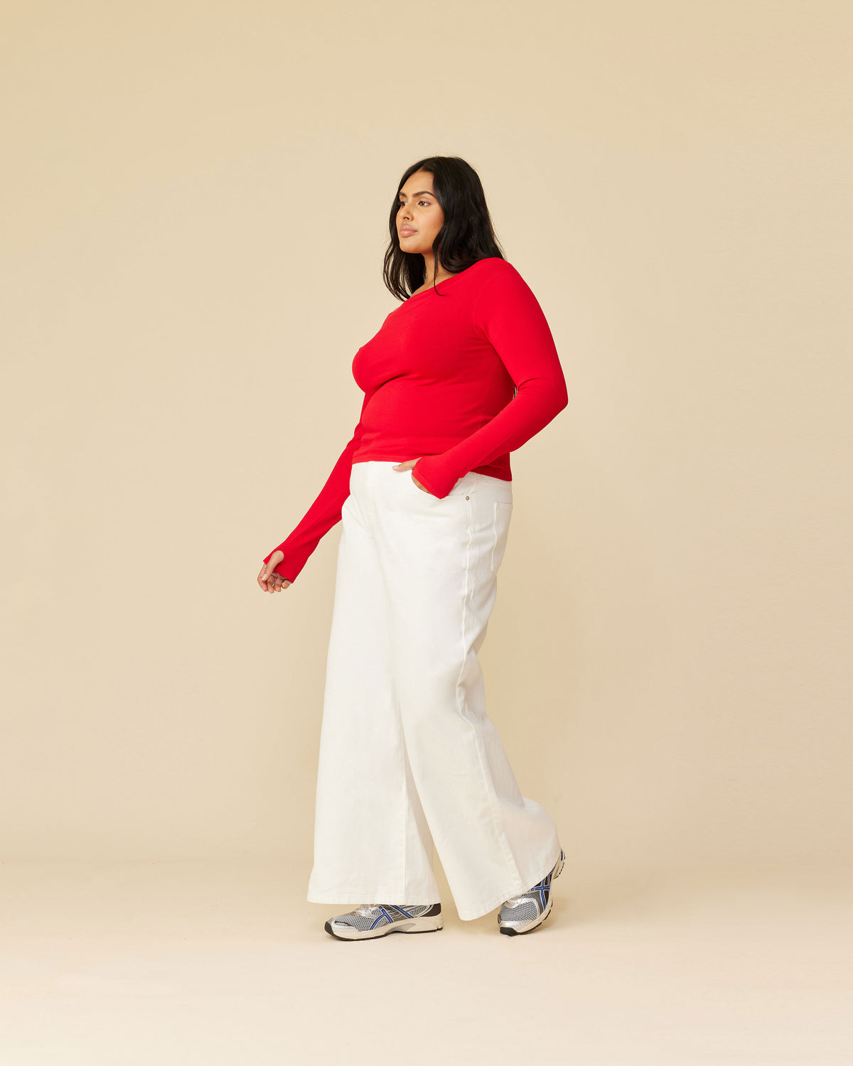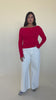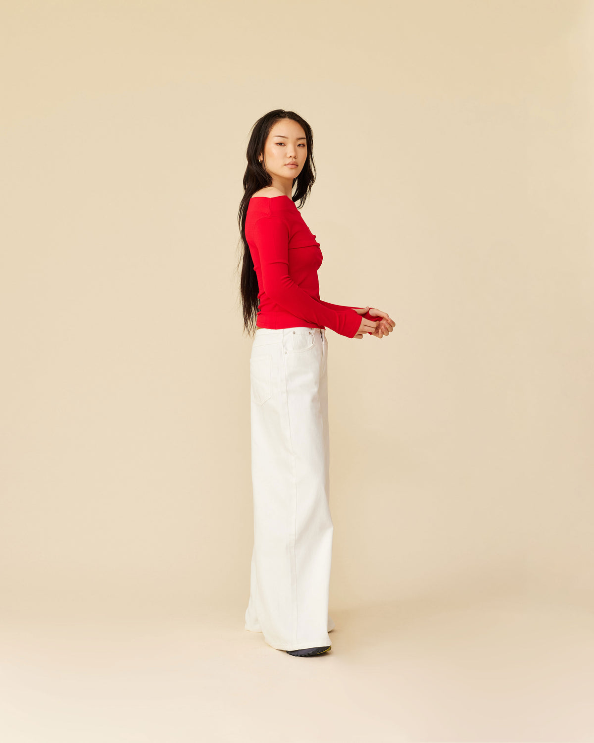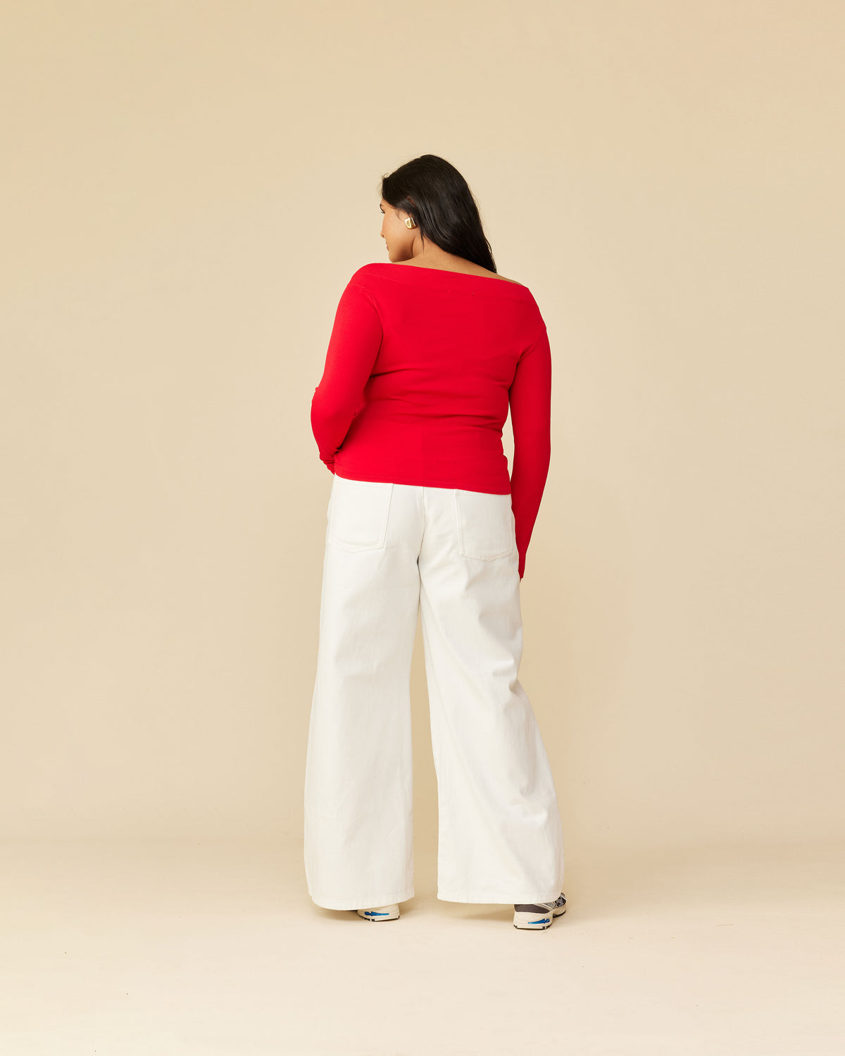 Off-shoulder long sleeve knitted top crafted in a cherry red mid-weight knit. This top is simple yet elegant and can be worn on or off the shoulder.