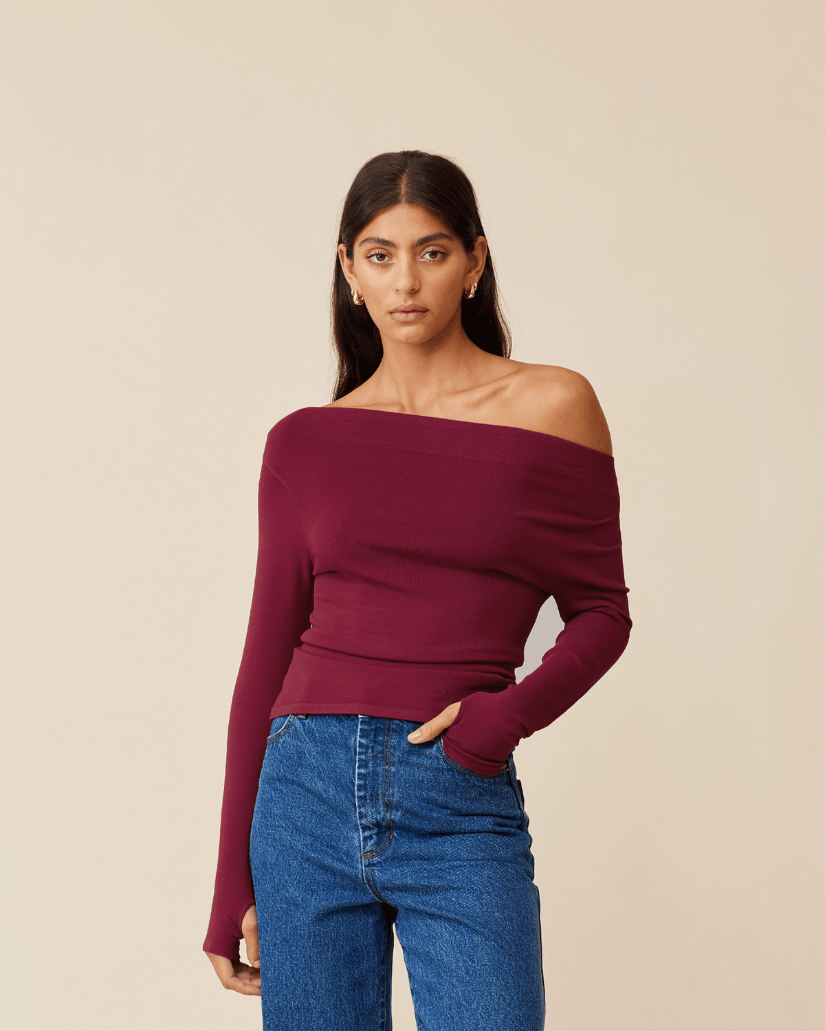Off-shoulder long sleeve knitted top crafted in a deep plum mid-weight knit. This top is simple yet elegant and can be worn on or off the shoulder.