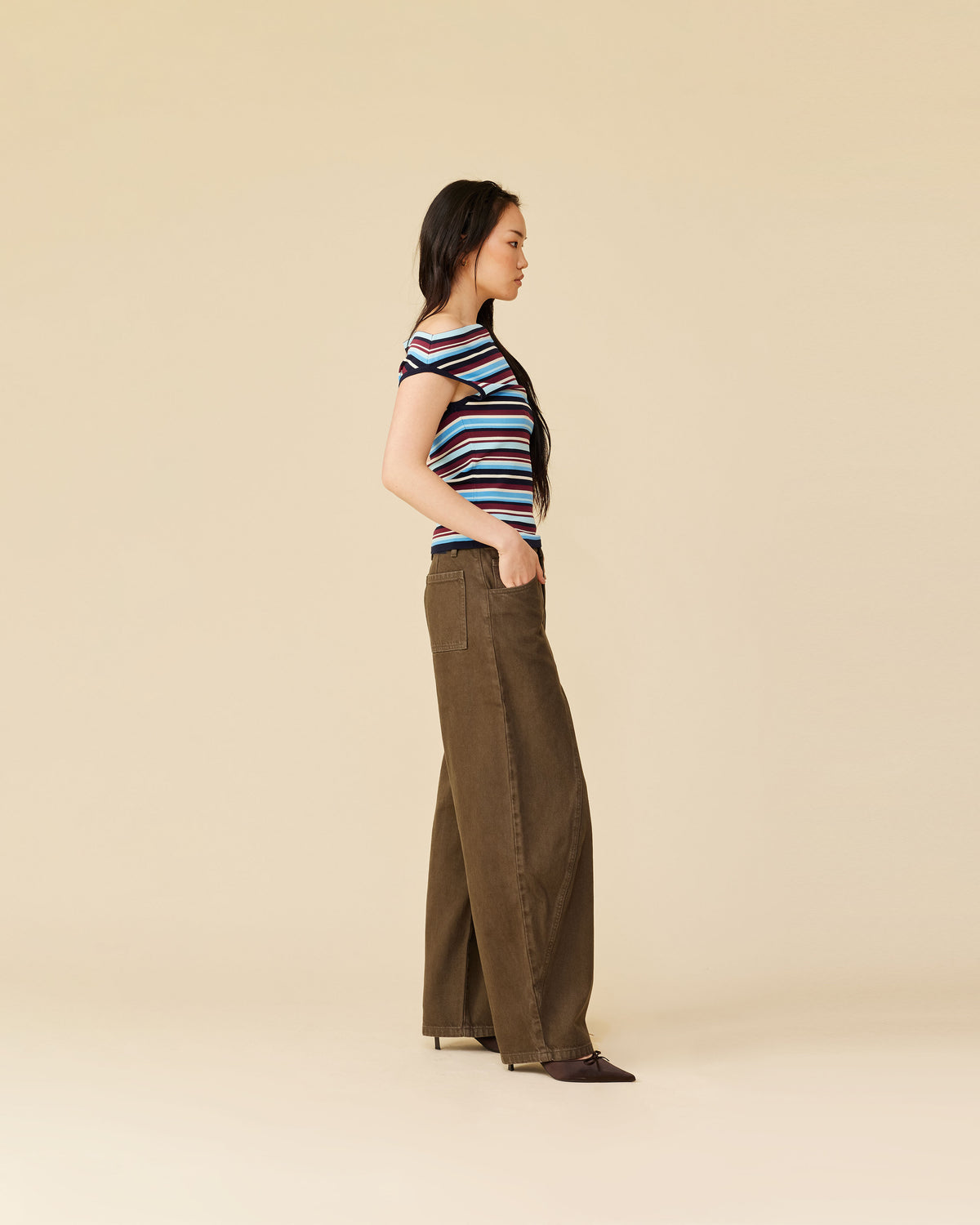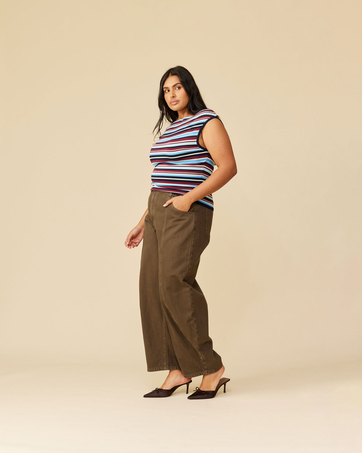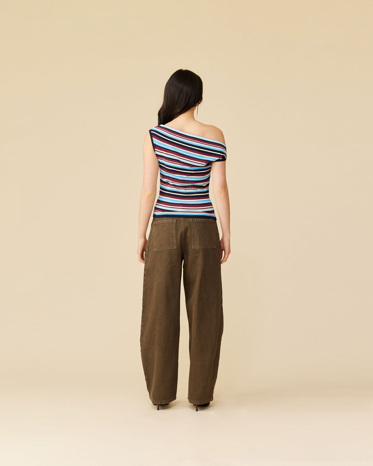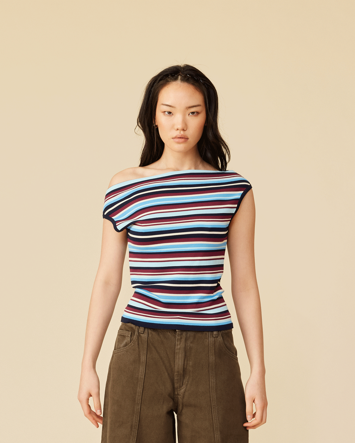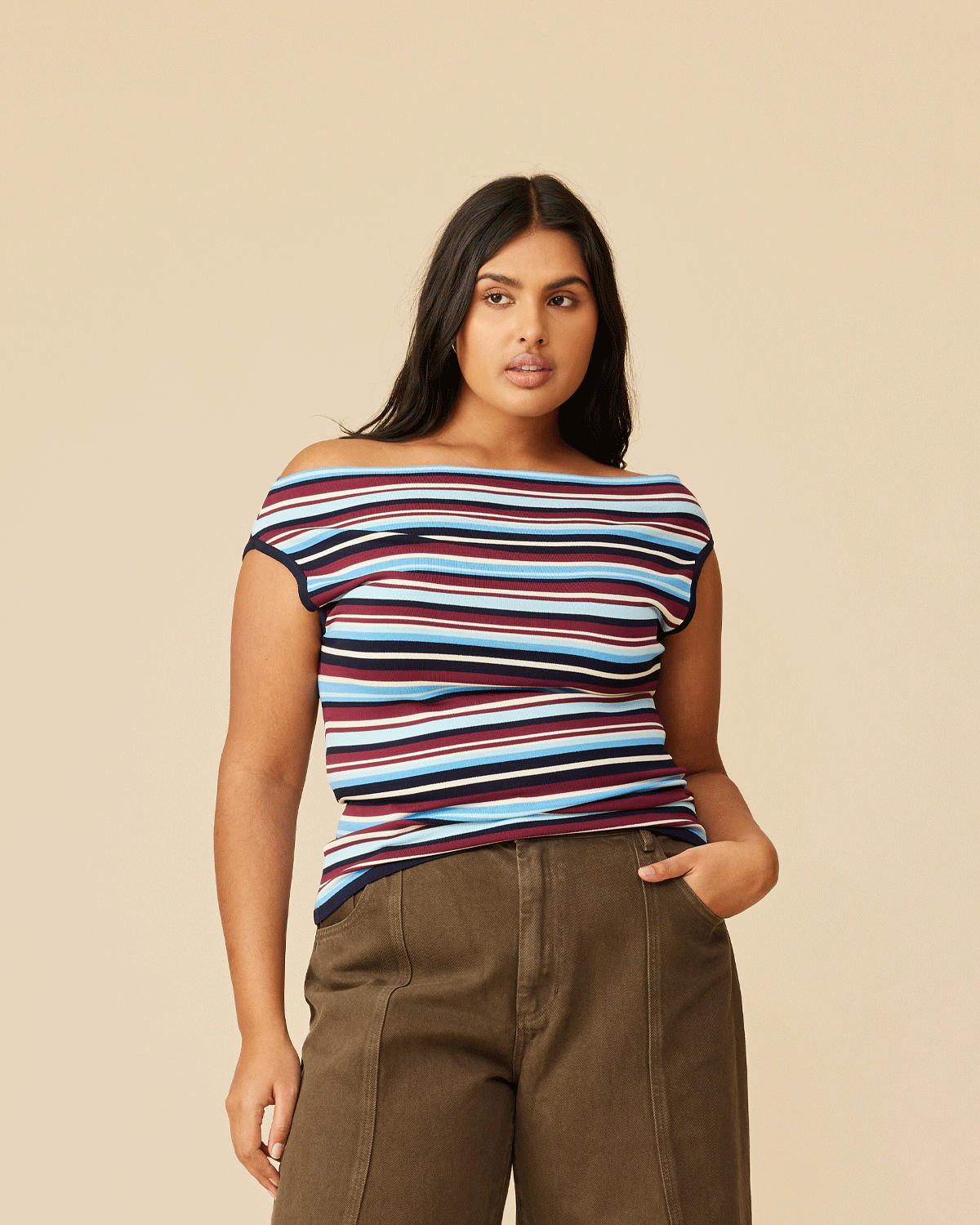 Off-shoulder knitted top crafted in a mid-weight striped knit. This top is simple yet elegant and can be worn on or off the shoulder. Make it a set by pairing this top with the matching Marla Short.