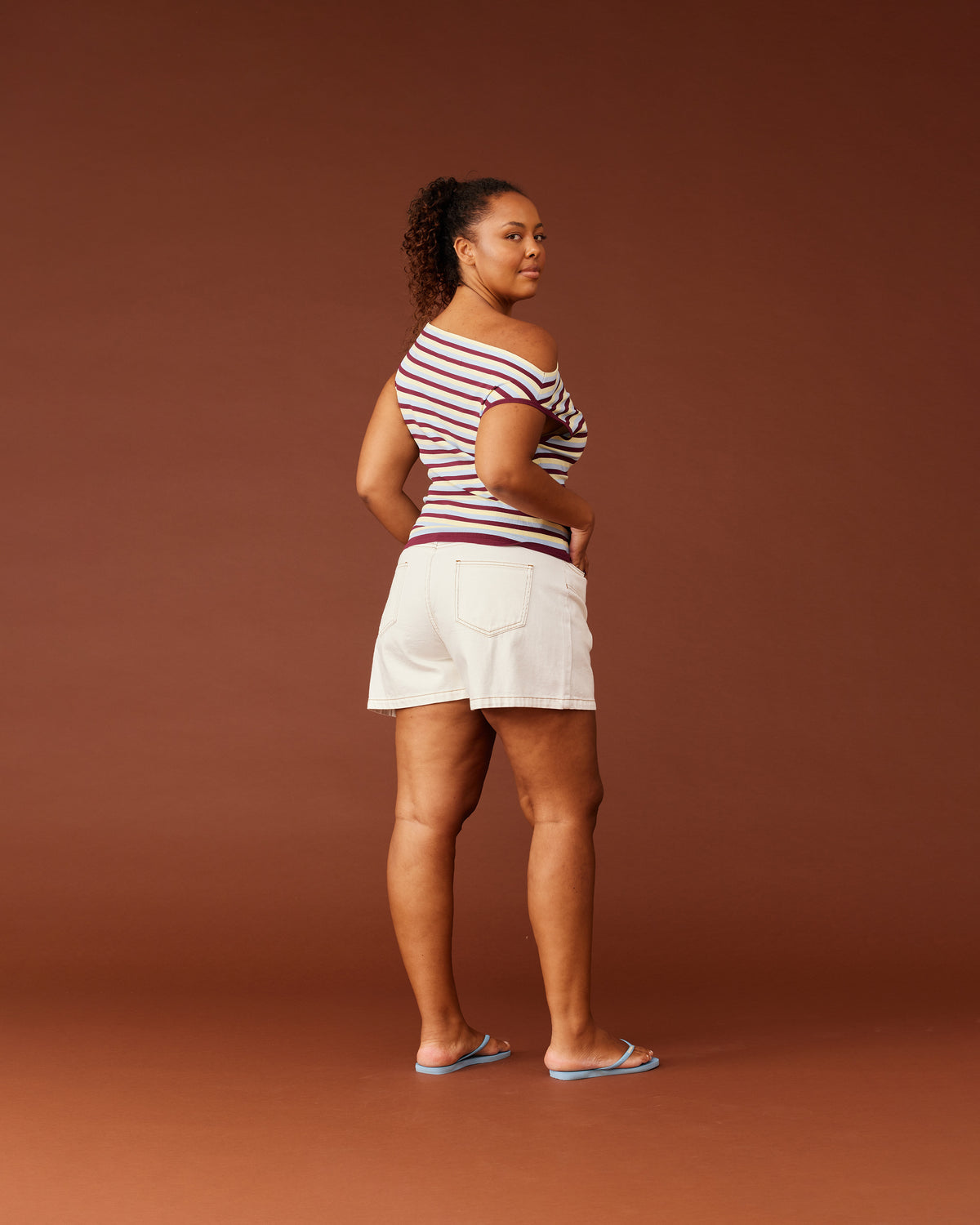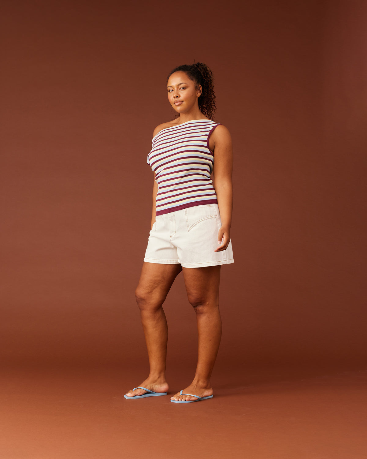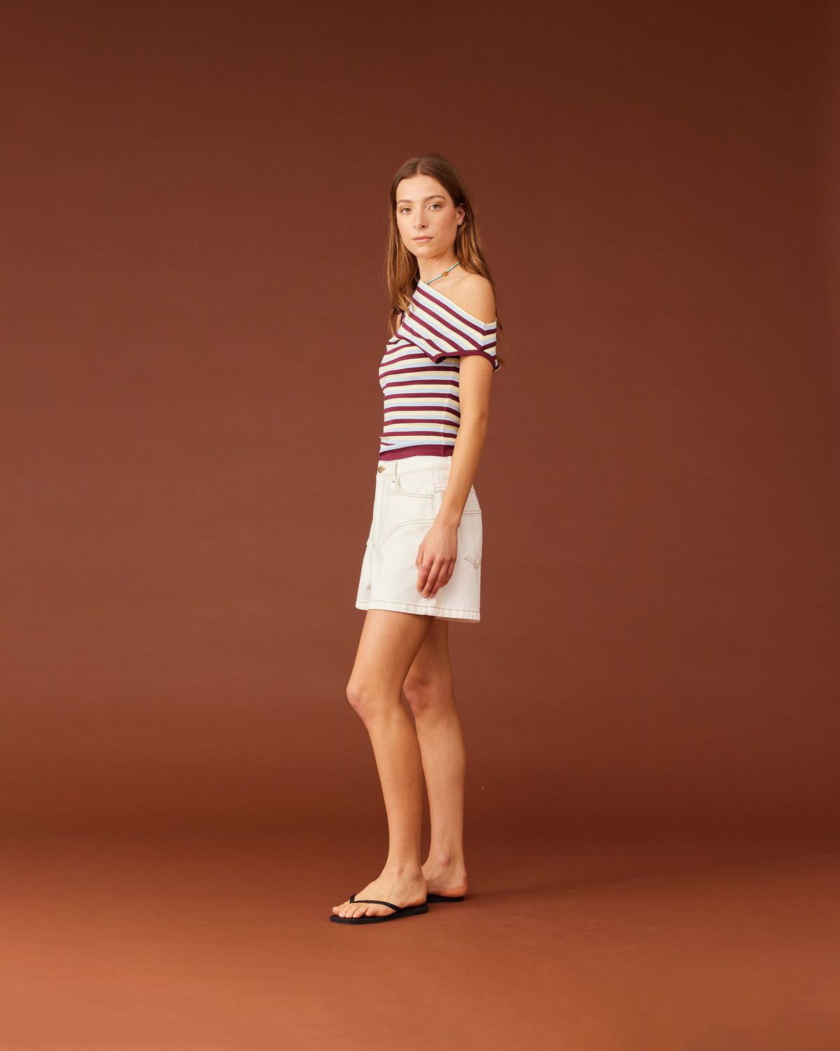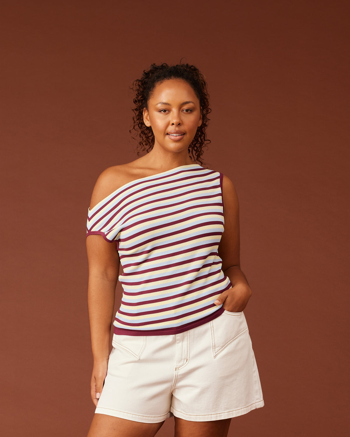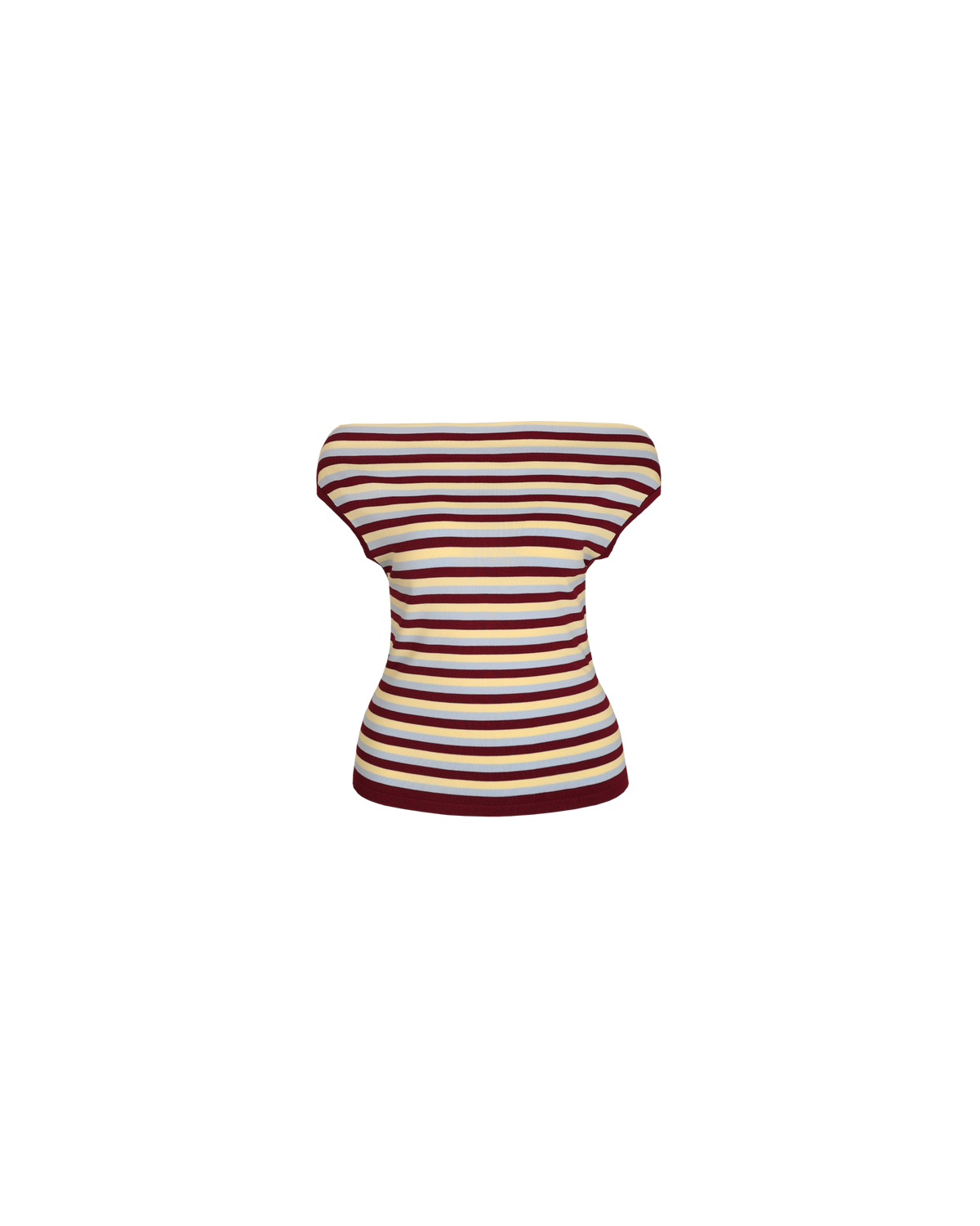 Off-shoulder knitted top crafted in a mid-weight burgundy butter blue striped knit. This top is simple yet elegant and can be worn on or off the shoulder.