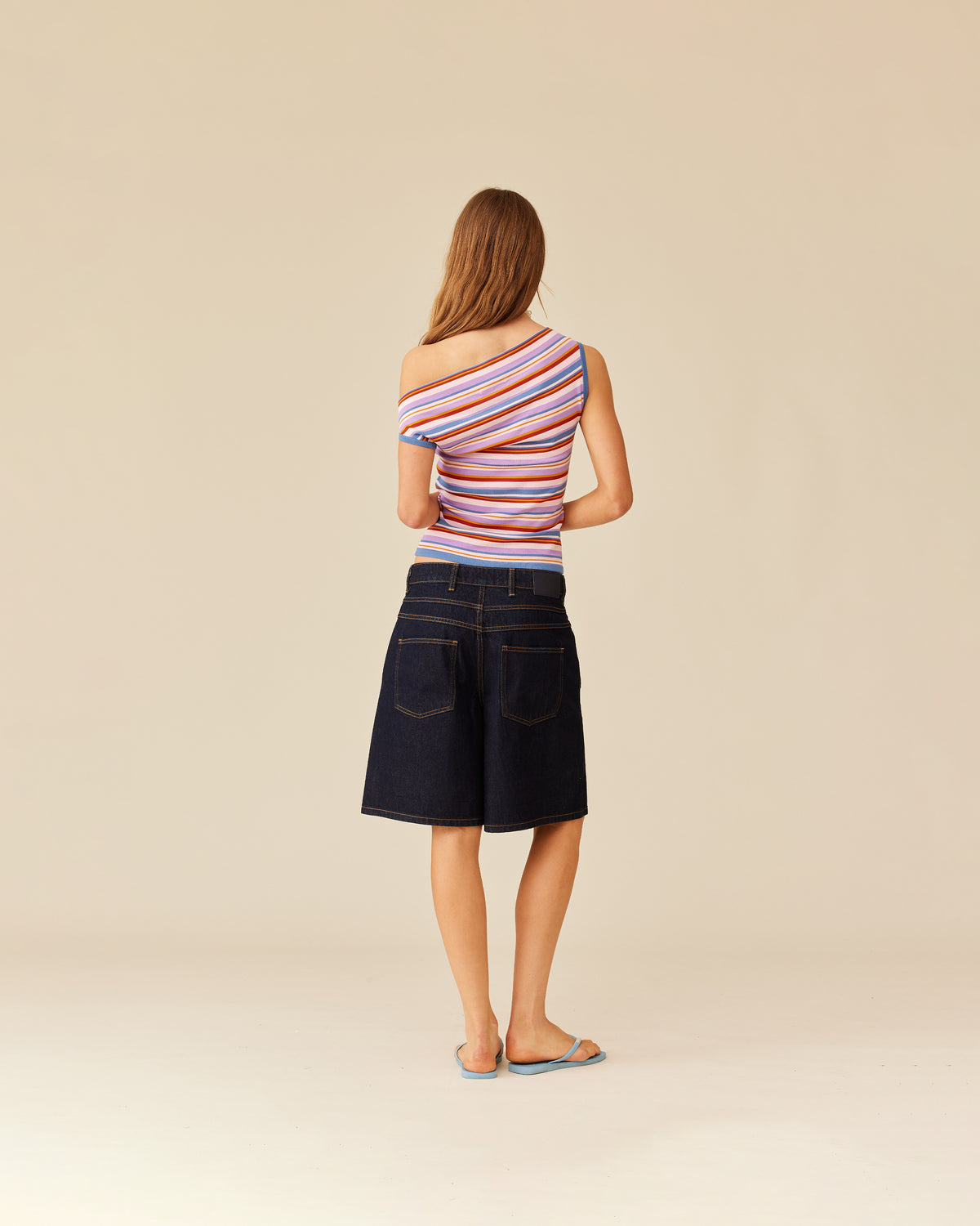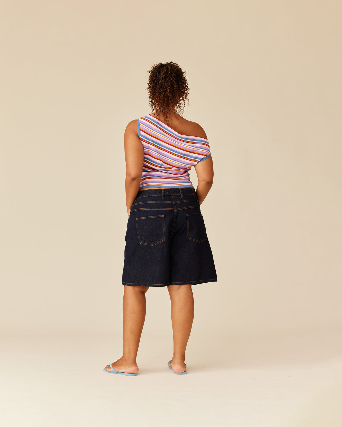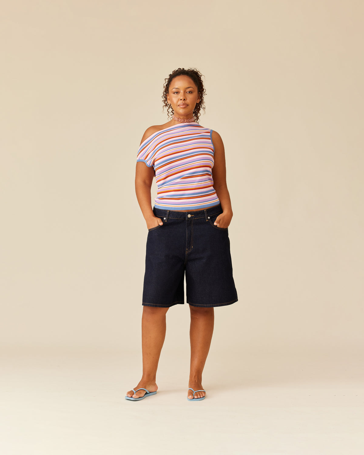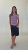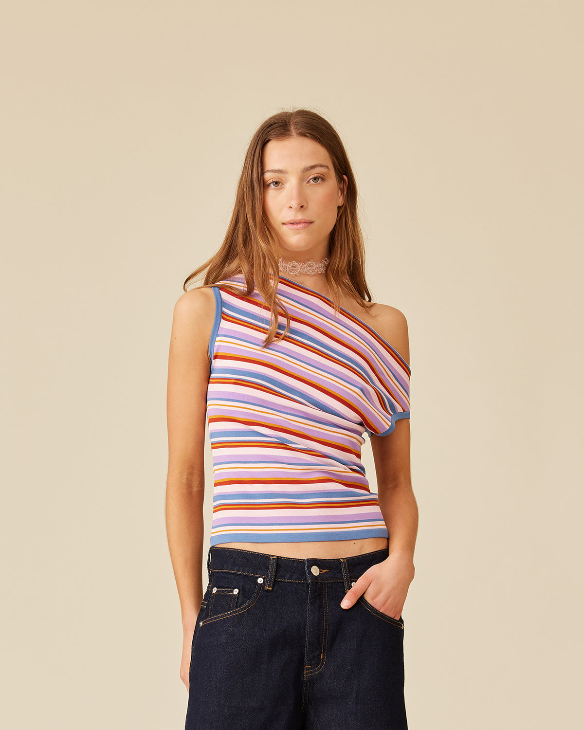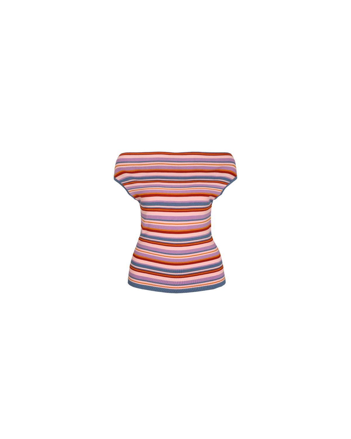 Off-shoulder knitted top crafted in a mid-weight lilac sunset striped knit. This top is simple yet elegant and can be worn on or off the shoulder.