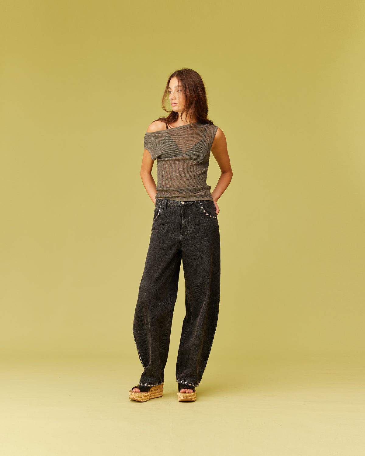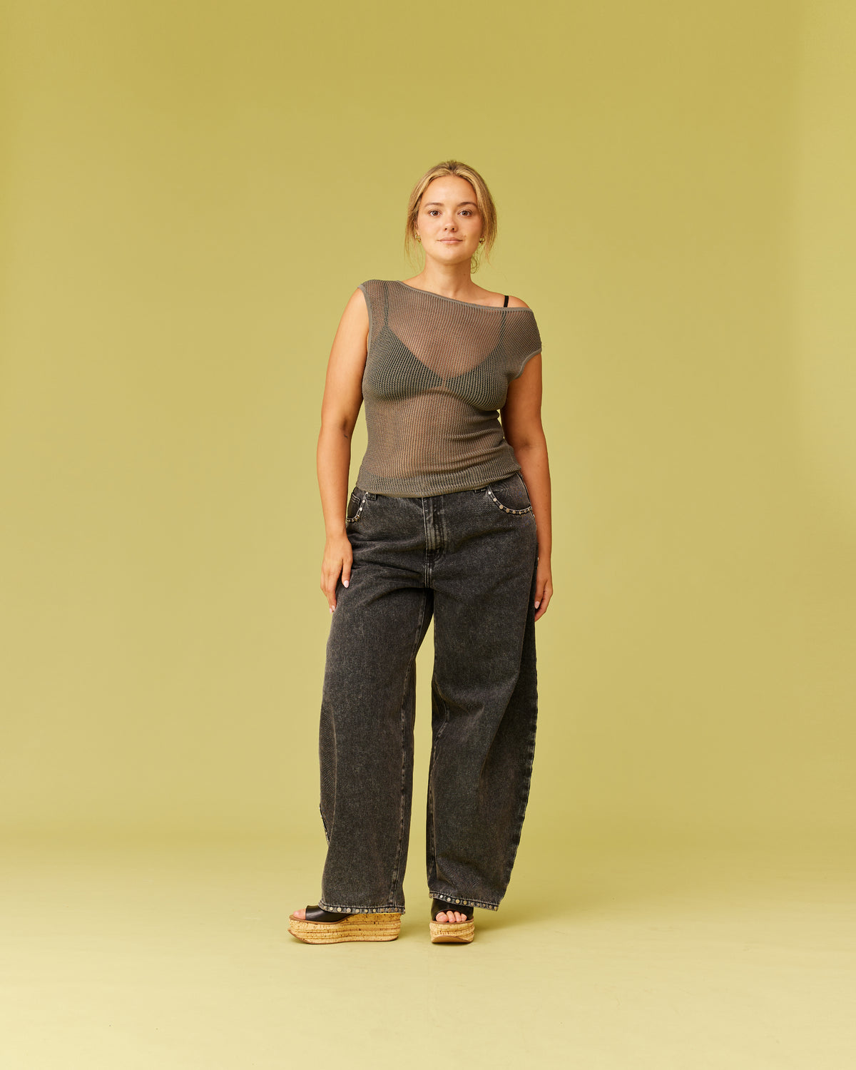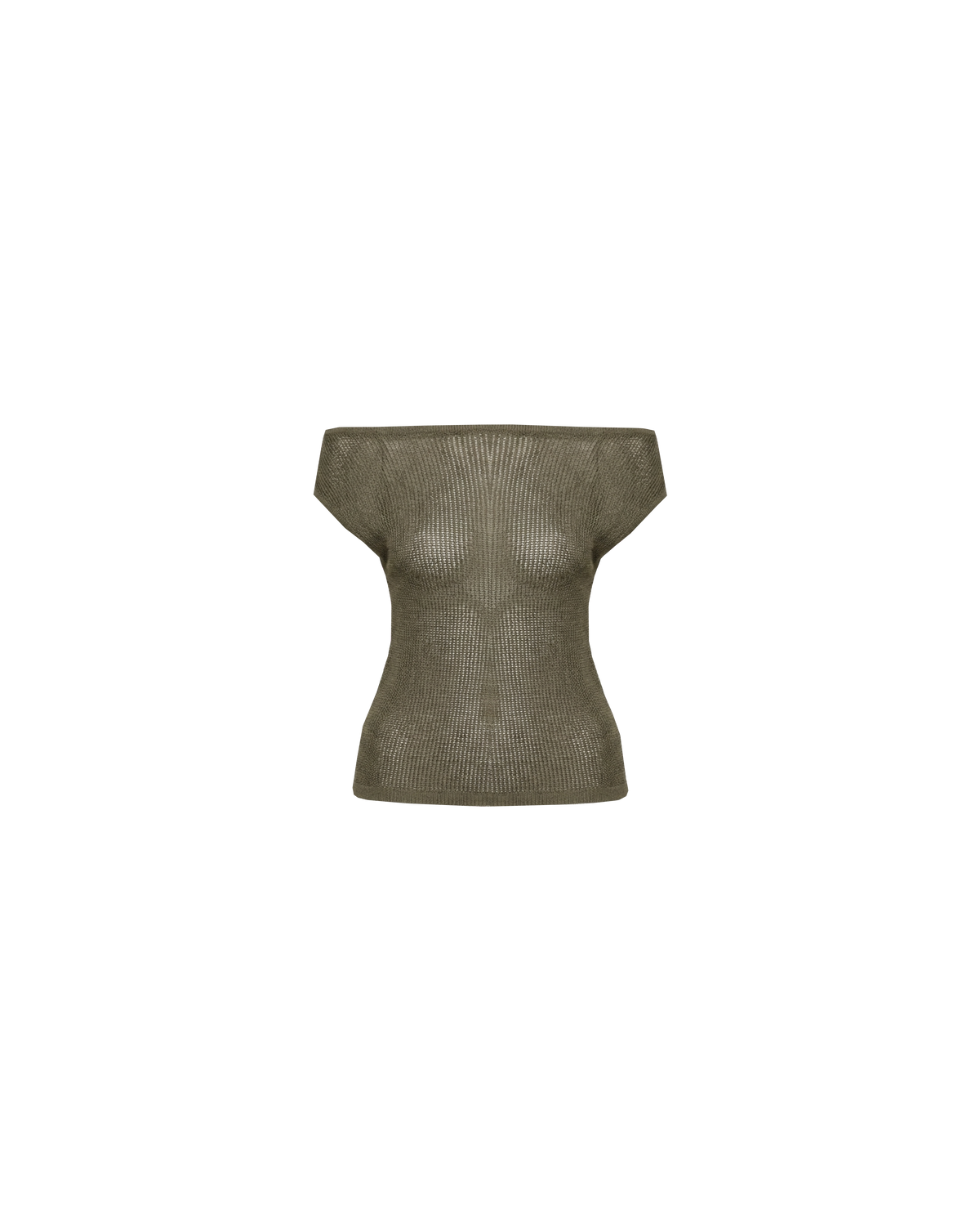 Off-shoulder knitted top crafted in a moss green crochet. This top is simple yet elevated and can be worn on or off the shoulder.