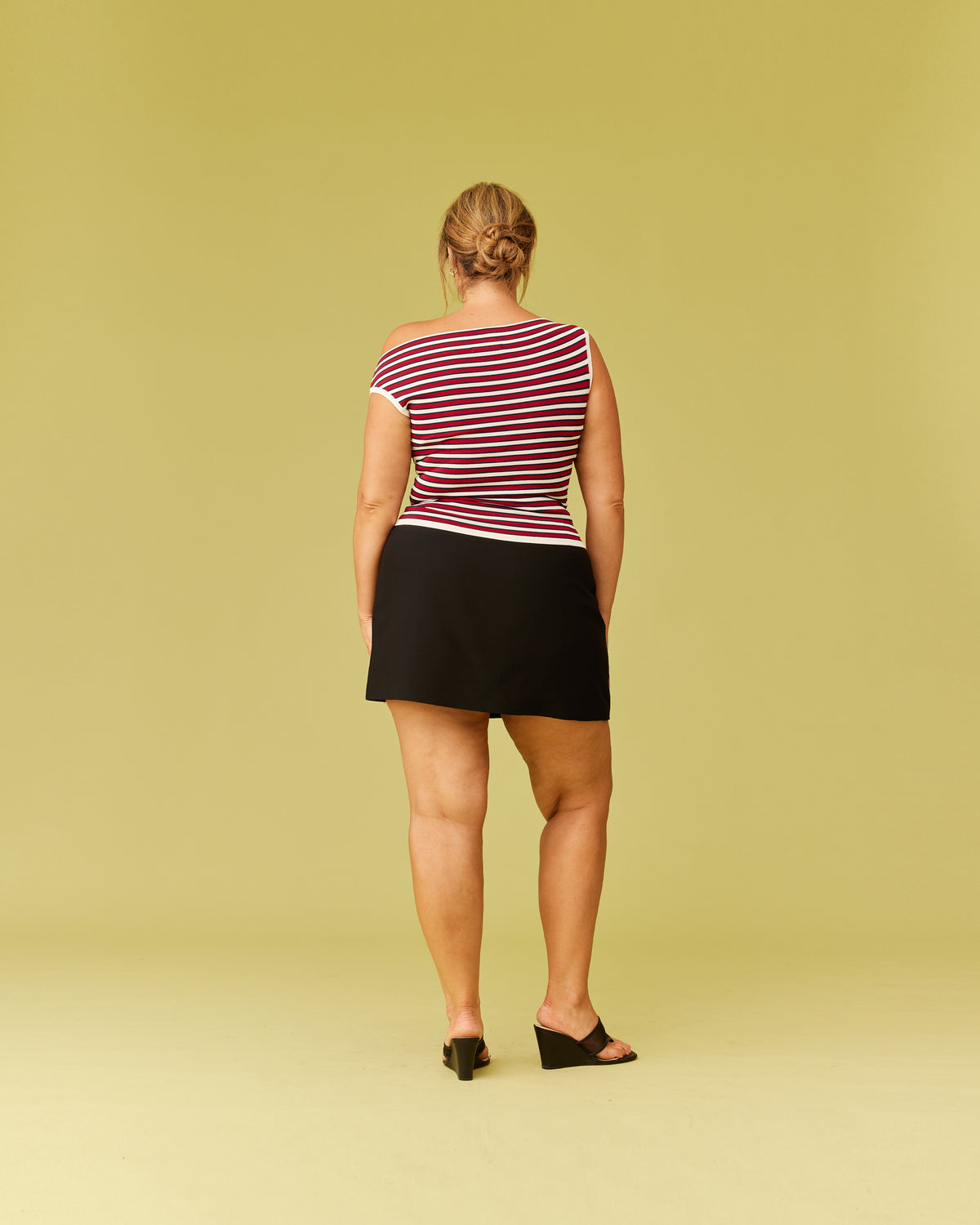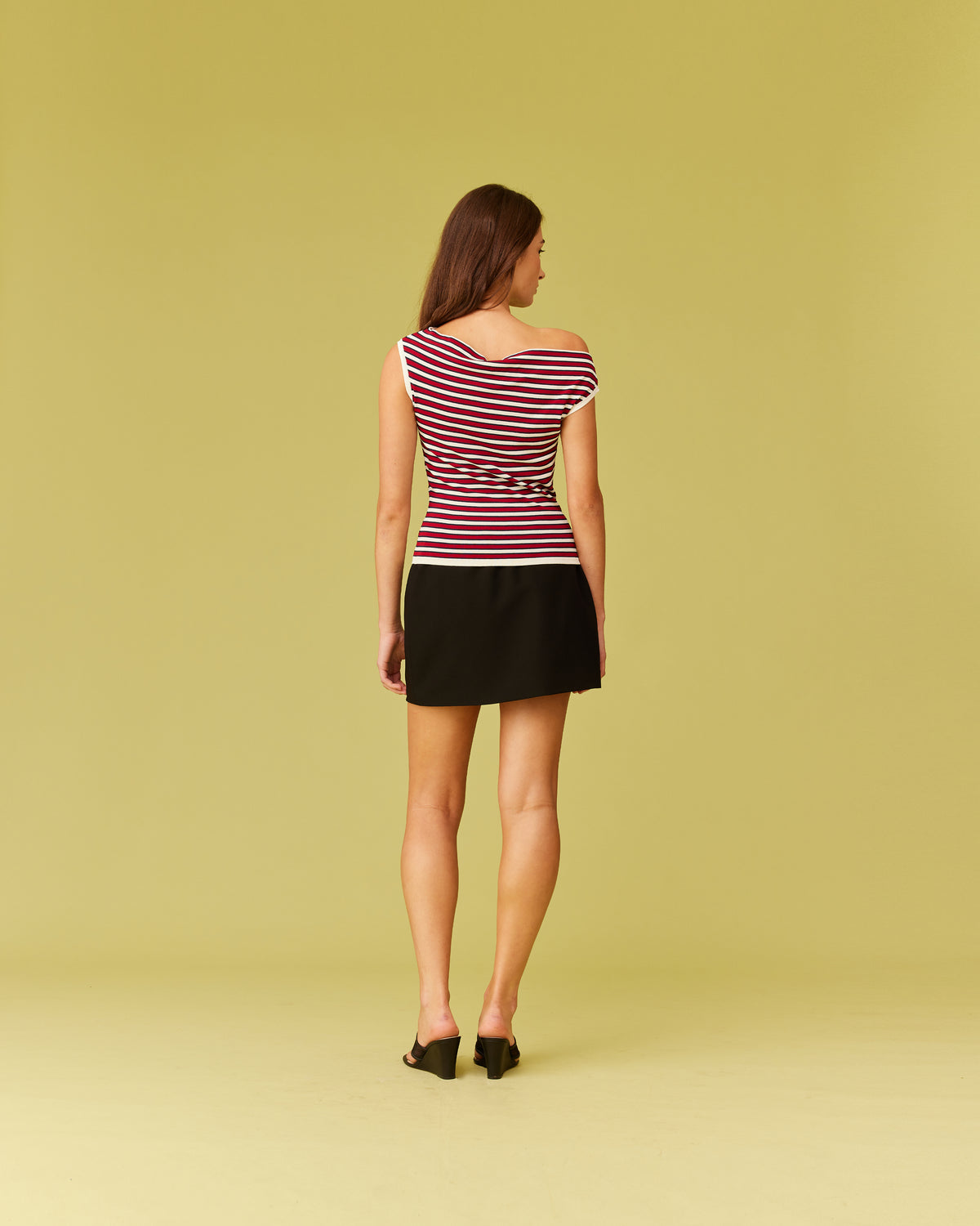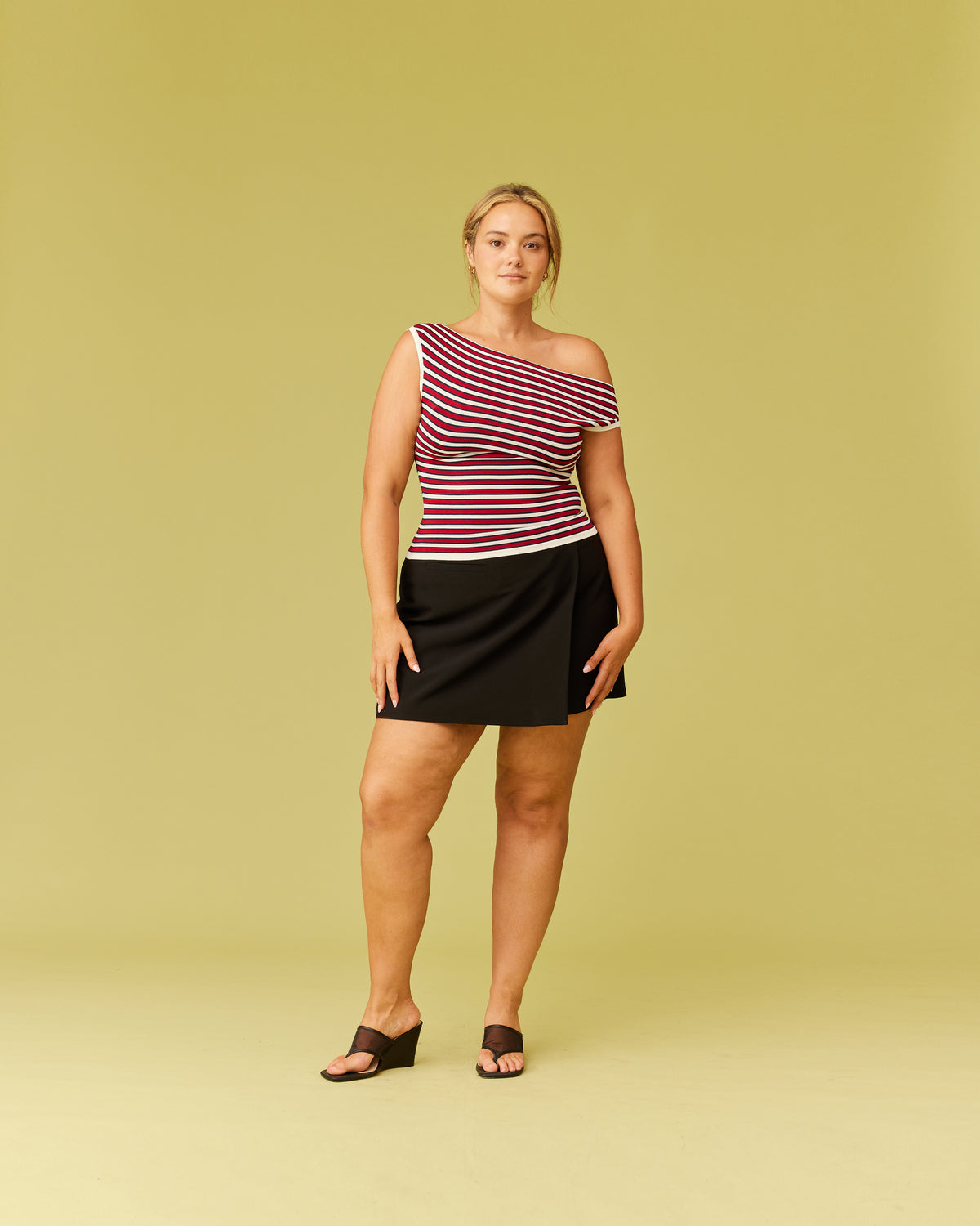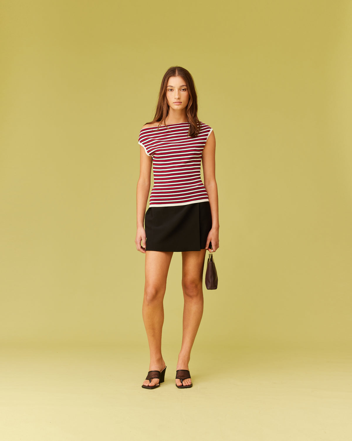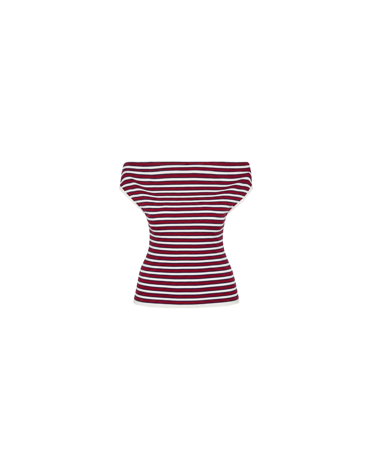Off-shoulder knitted top crafted in a mid-weight striped knit. This top is simple yet elegant and can be worn on or off the shoulder.