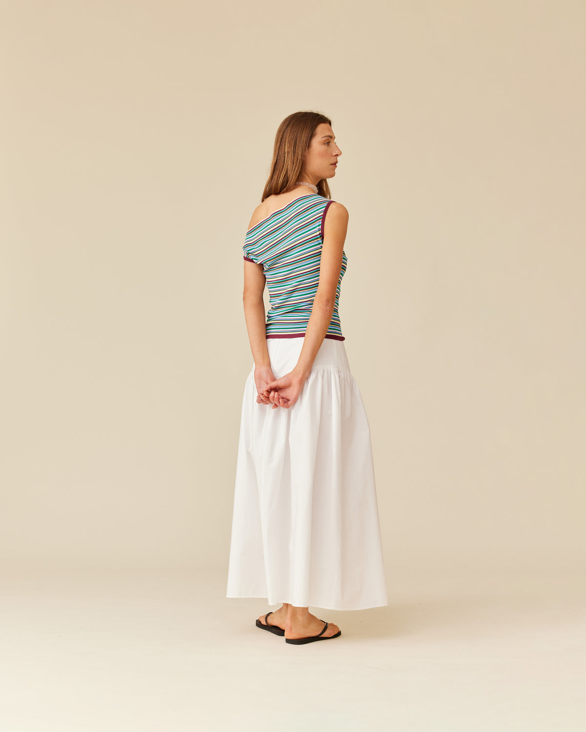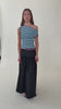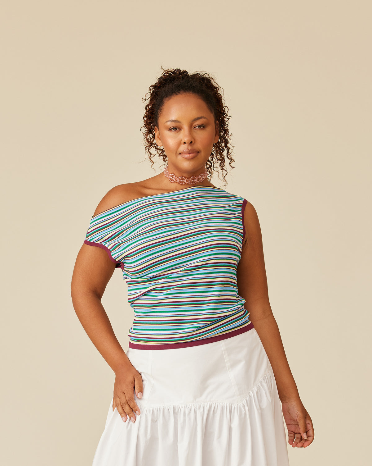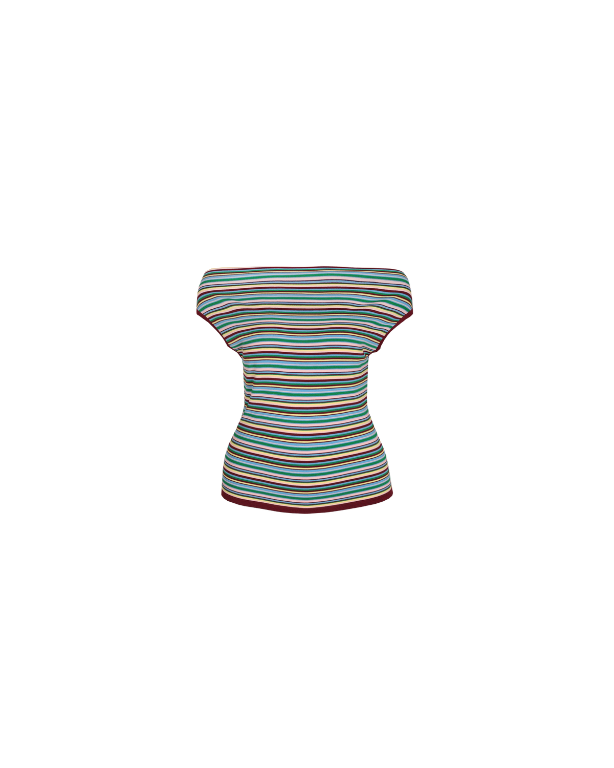 Off-shoulder knitted top crafted in a mid-weight pink fine line striped knit. This top is simple yet elegant and can be worn on or off the shoulder.