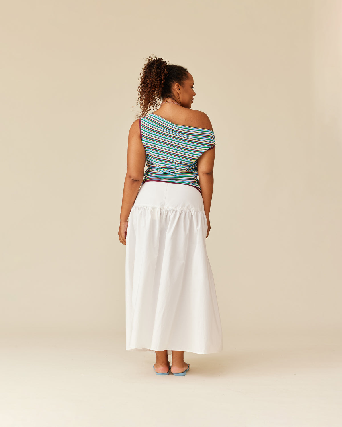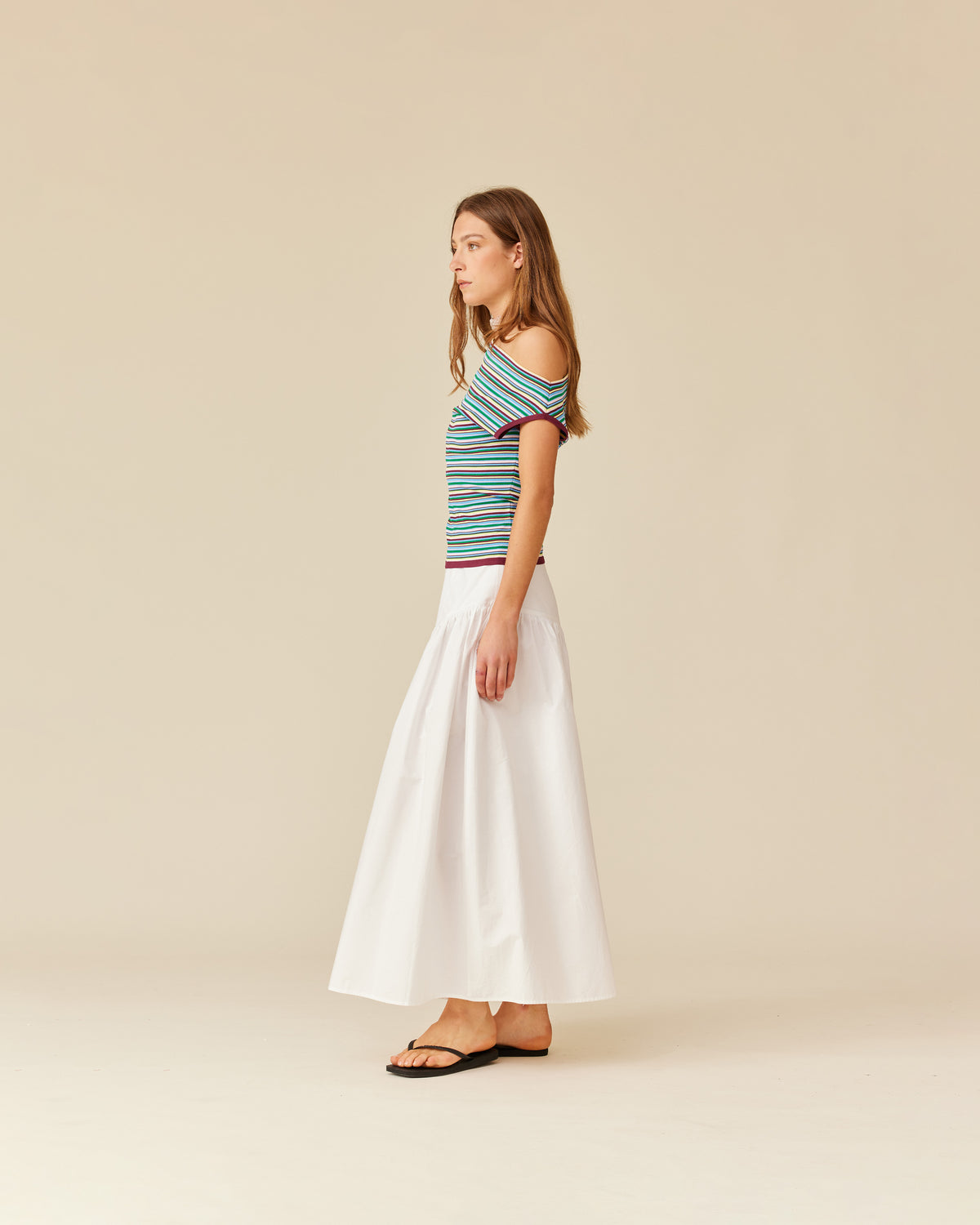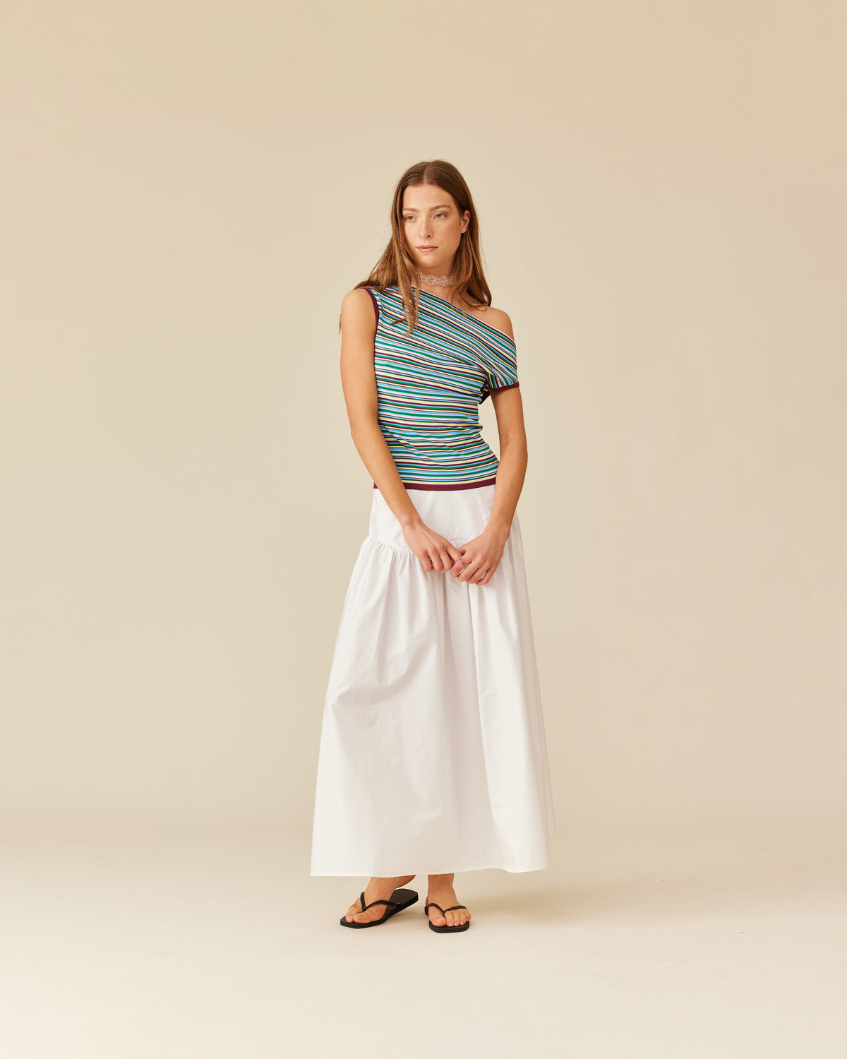 Off-shoulder knitted top crafted in a mid-weight pink fine line striped knit. This top is simple yet elegant and can be worn on or off the shoulder.