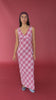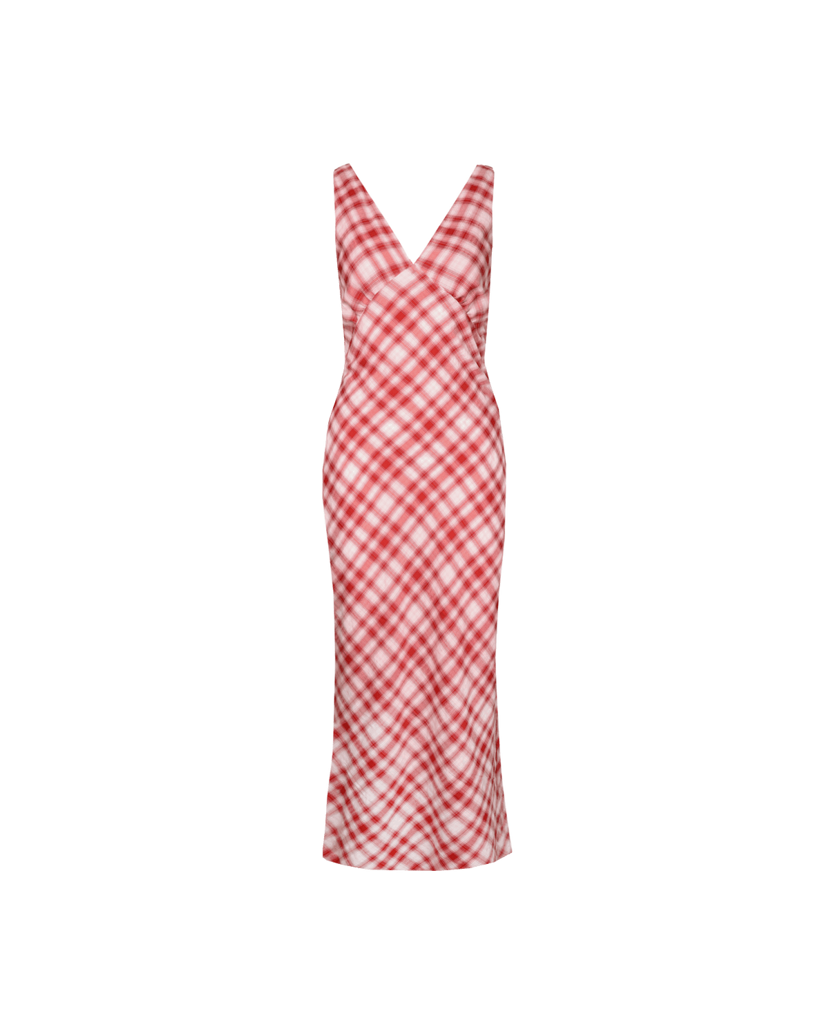 Bias cut midi dress in a red and white cotton gingham. Wide straps with a panelled V-neck front and back give this dress a vintage shape. Features a waist tie and side split for movement.