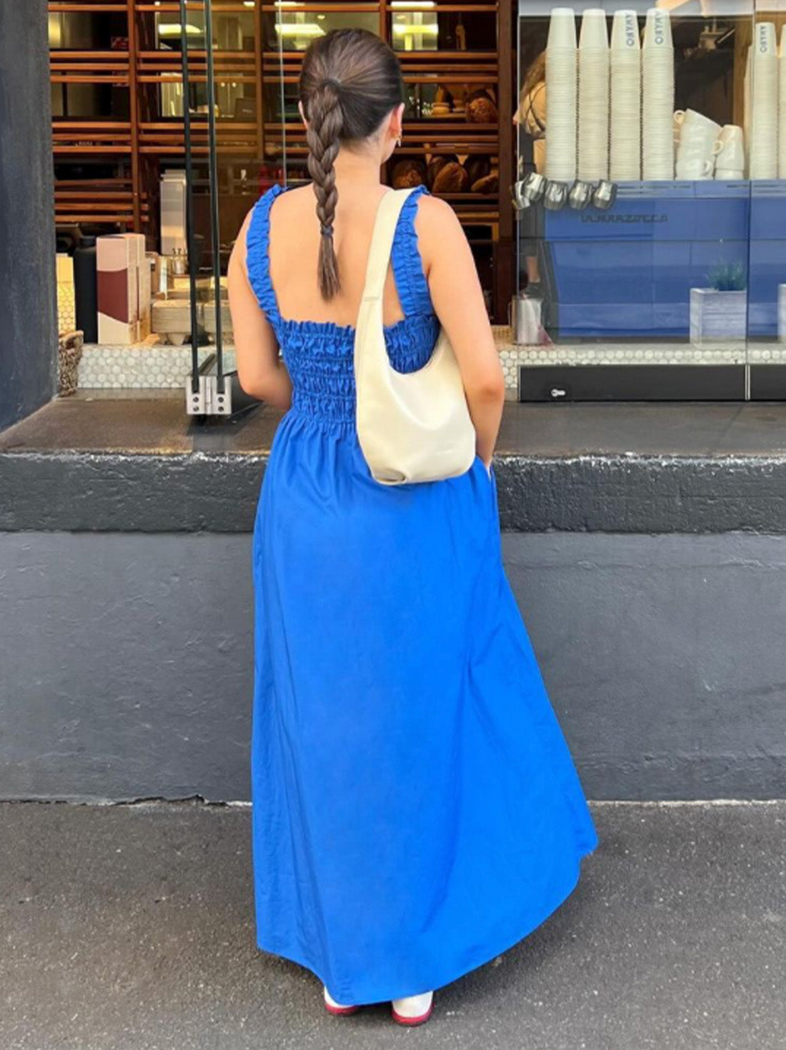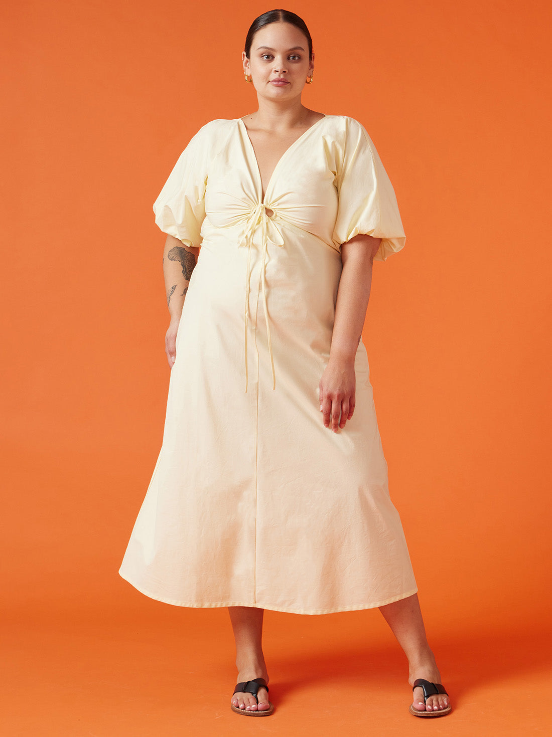 Bias cut midi dress in a soft pink linen. Wide straps and a paneled V-neck front and back give this dress a vintage shape. Features a waist tie and side split for movement.