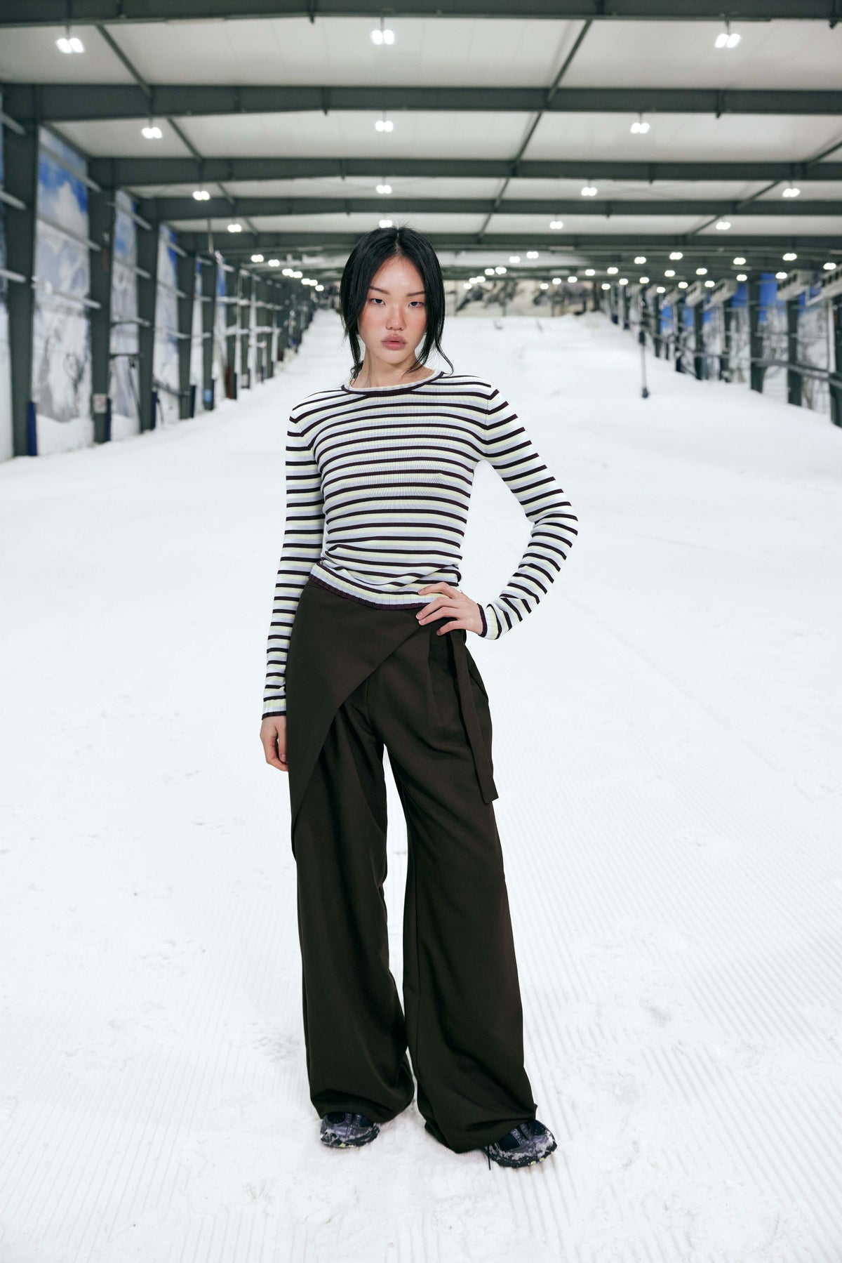 Long sleeve burgundy and aqua striped top, with a super soft hand feel in a mid-weight viscose blend knit. This piece will become an everyday staple.