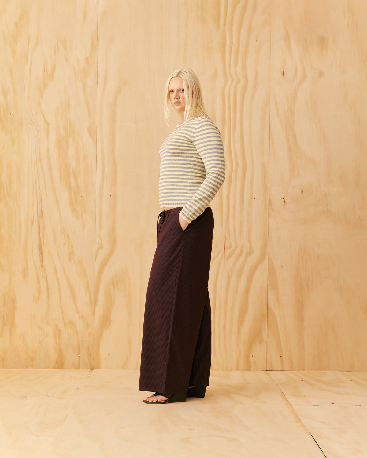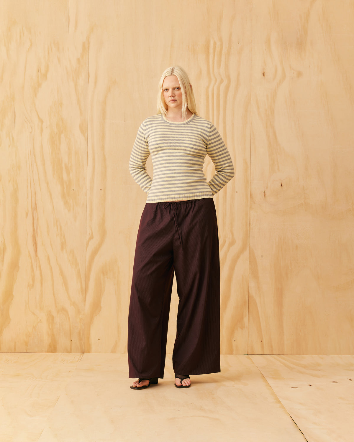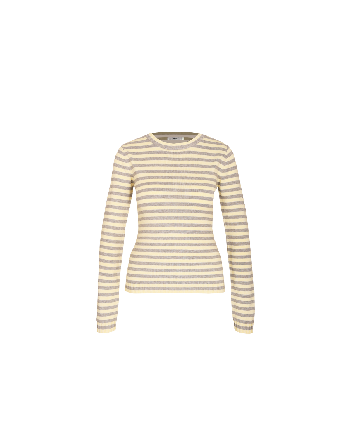 Long sleeve grey and butter striped top, with a soft hand feel in a mid-weight viscose blend knit. This piece will become an everyday staple.