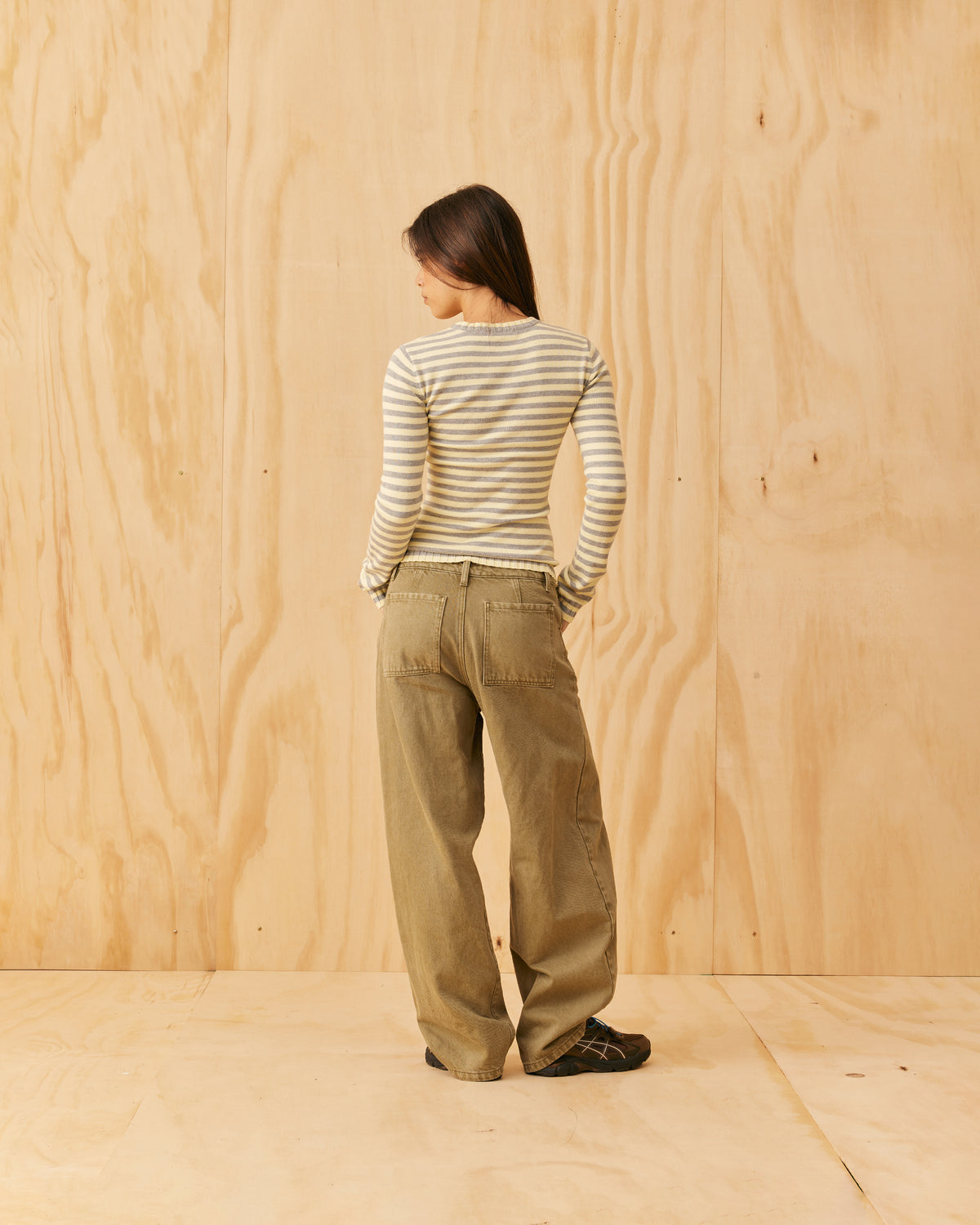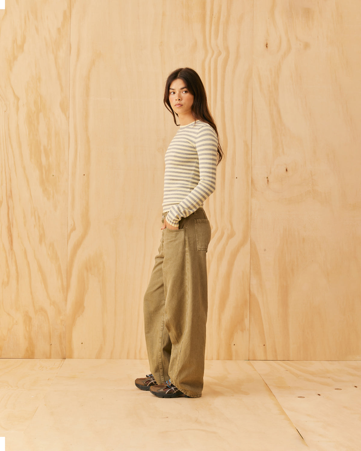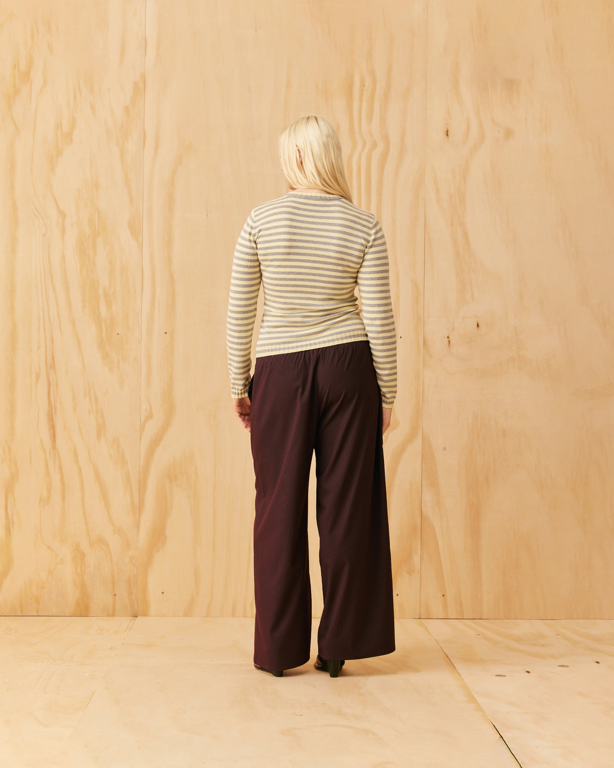 Long sleeve grey and butter striped top, with a soft hand feel in a mid-weight viscose blend knit. This piece will become an everyday staple.