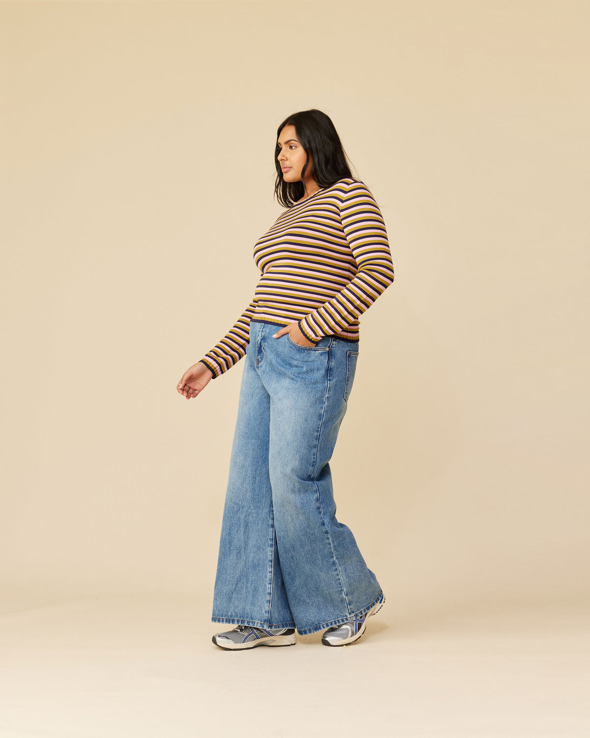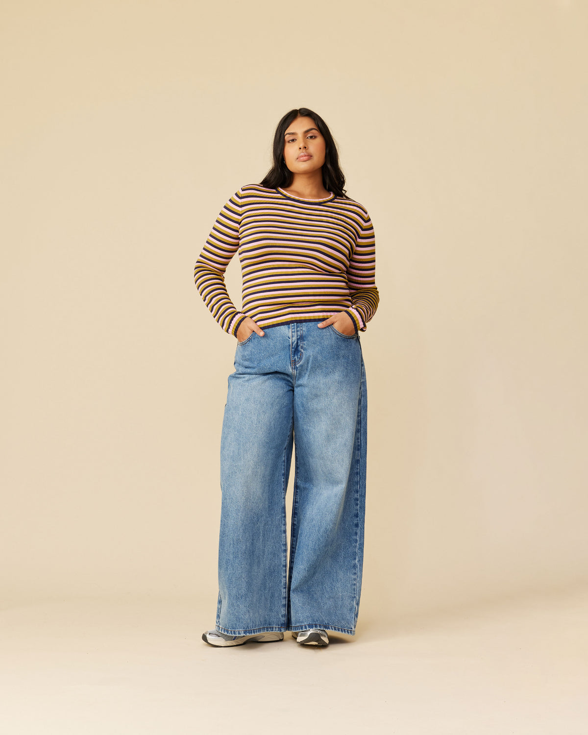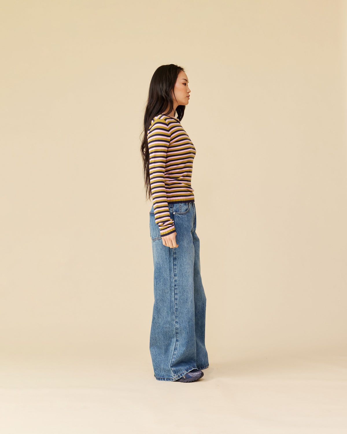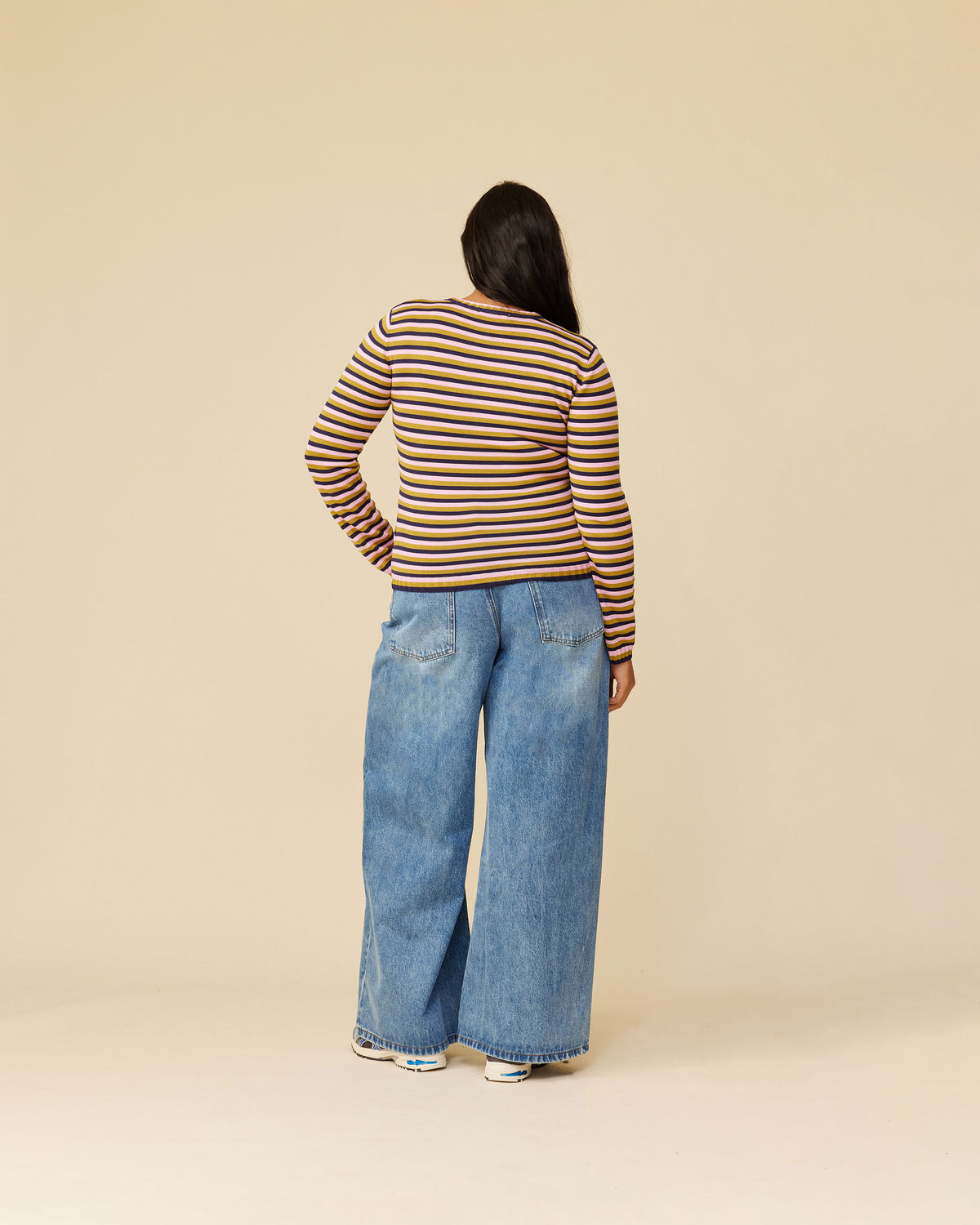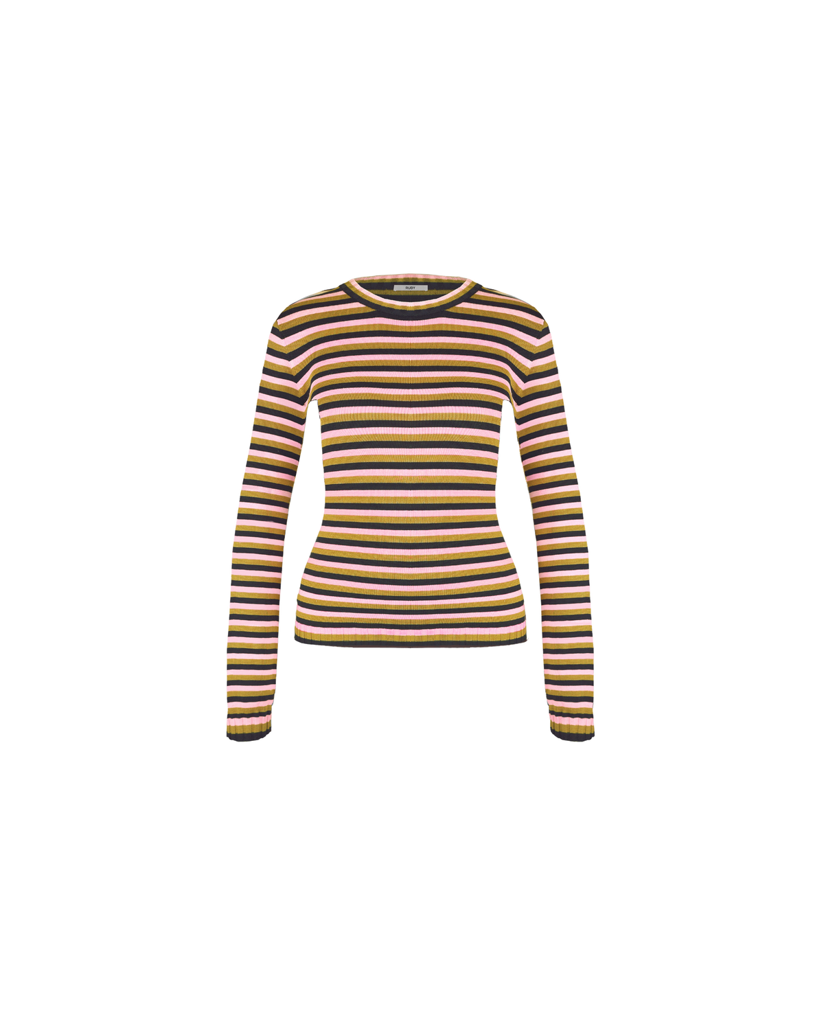 Long sleeve navy, pink, and gold striped top, with a super soft hand feel in a mid-weight viscose blend knit. This piece will become an everyday staple.