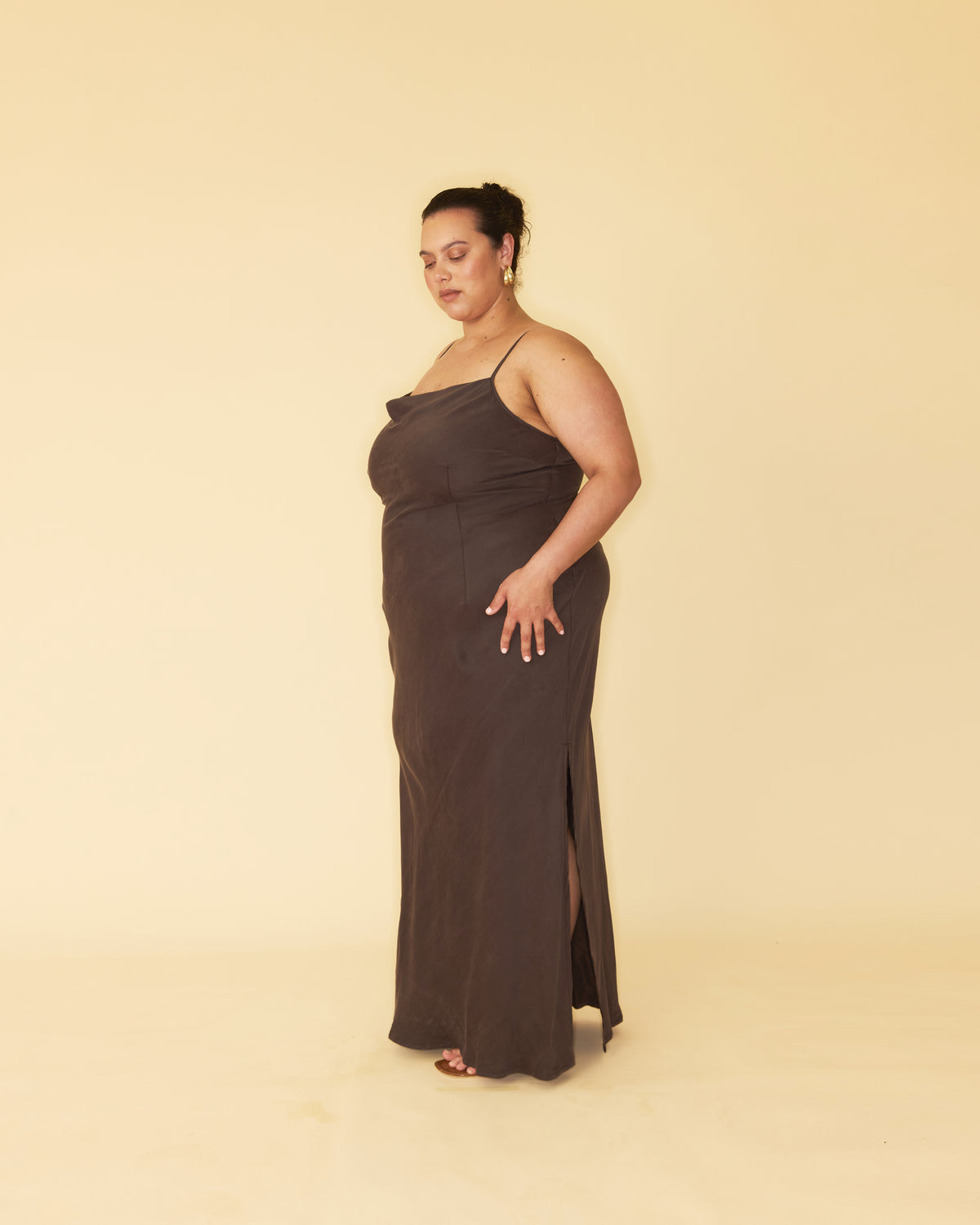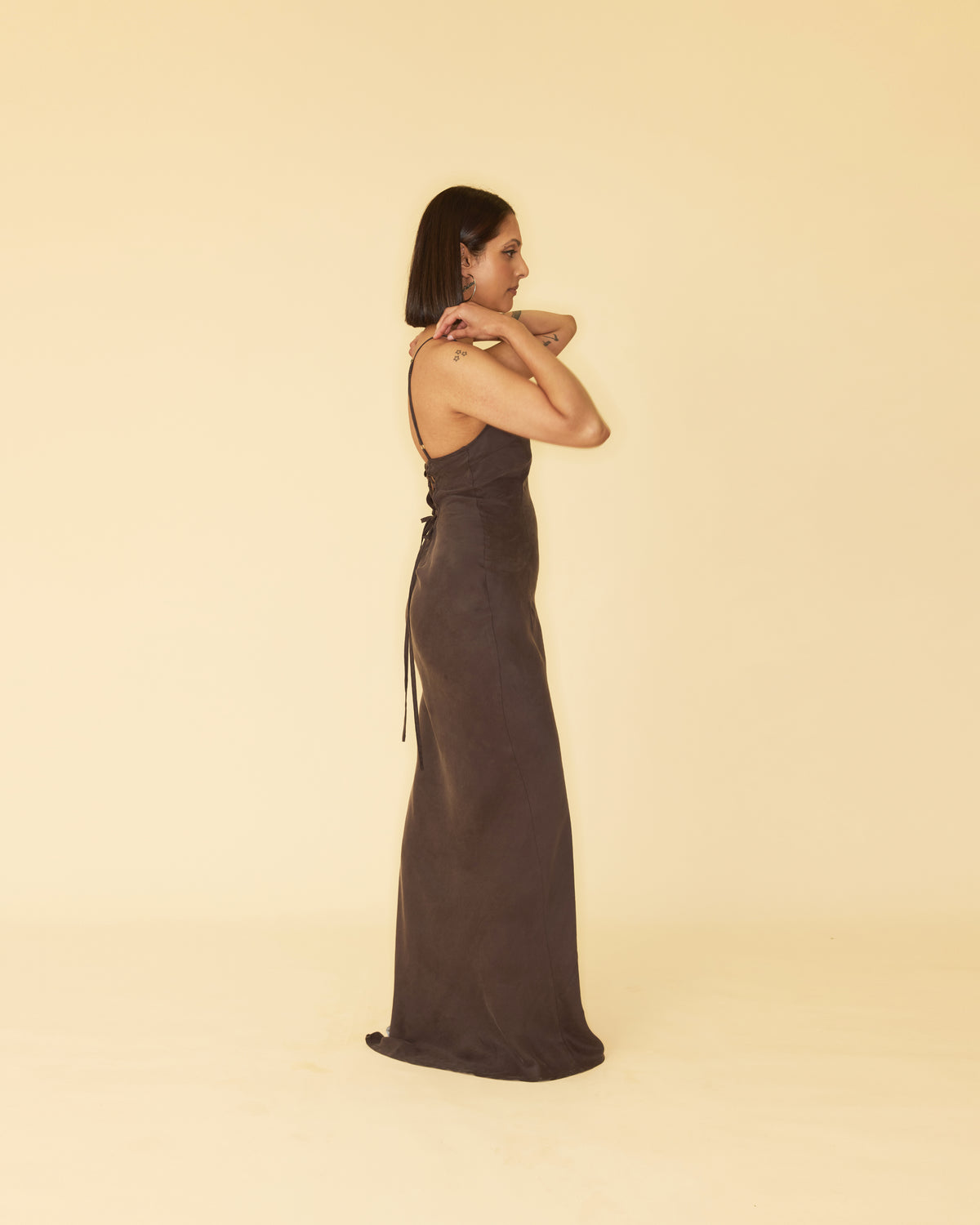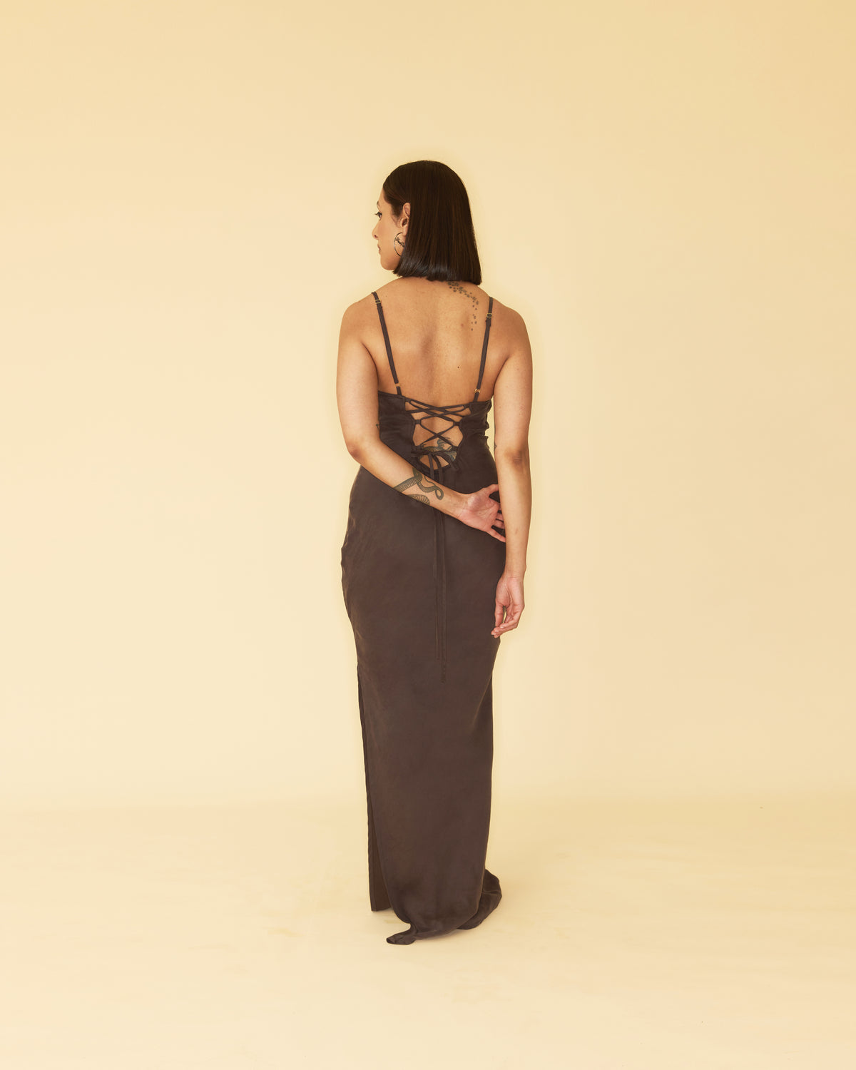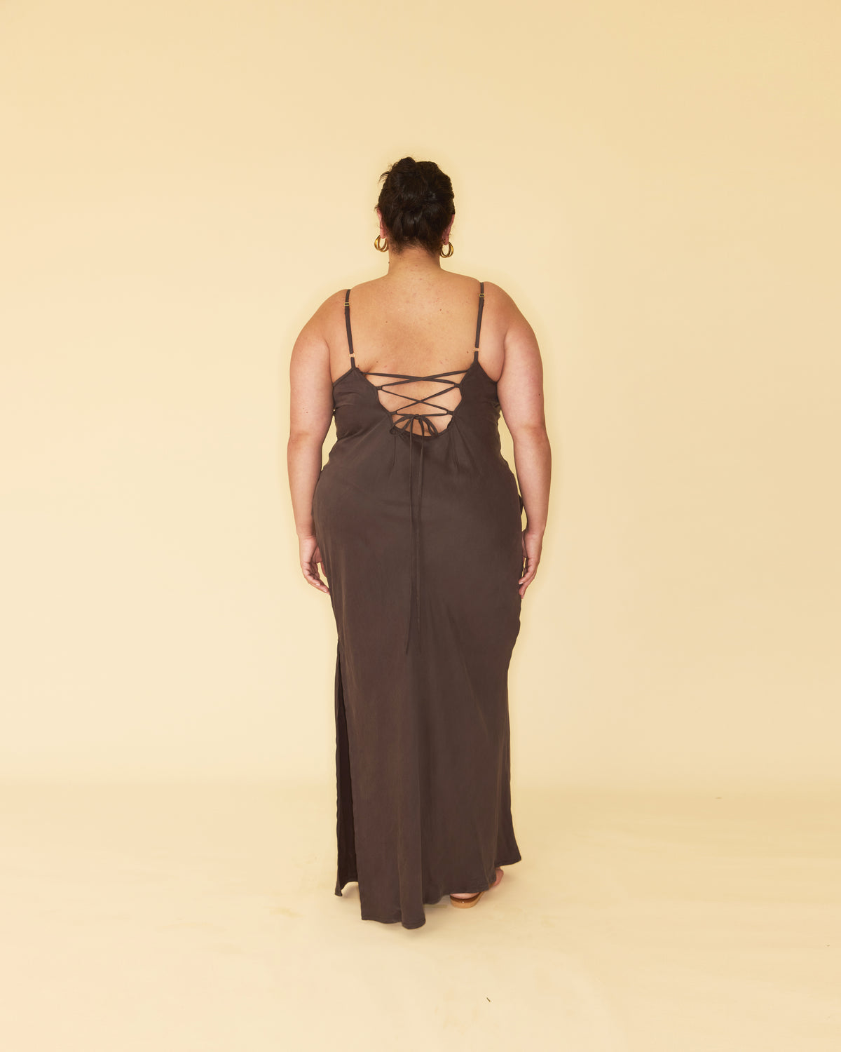 Bias cut slip dress designed in a buttery chocolate cupro. Featuring a built in shelf bra, corset style lace up back, and a side split on one side for ease of movement.