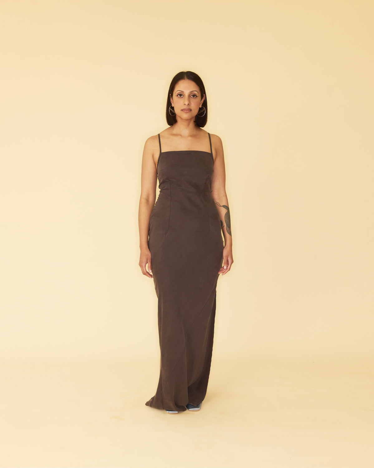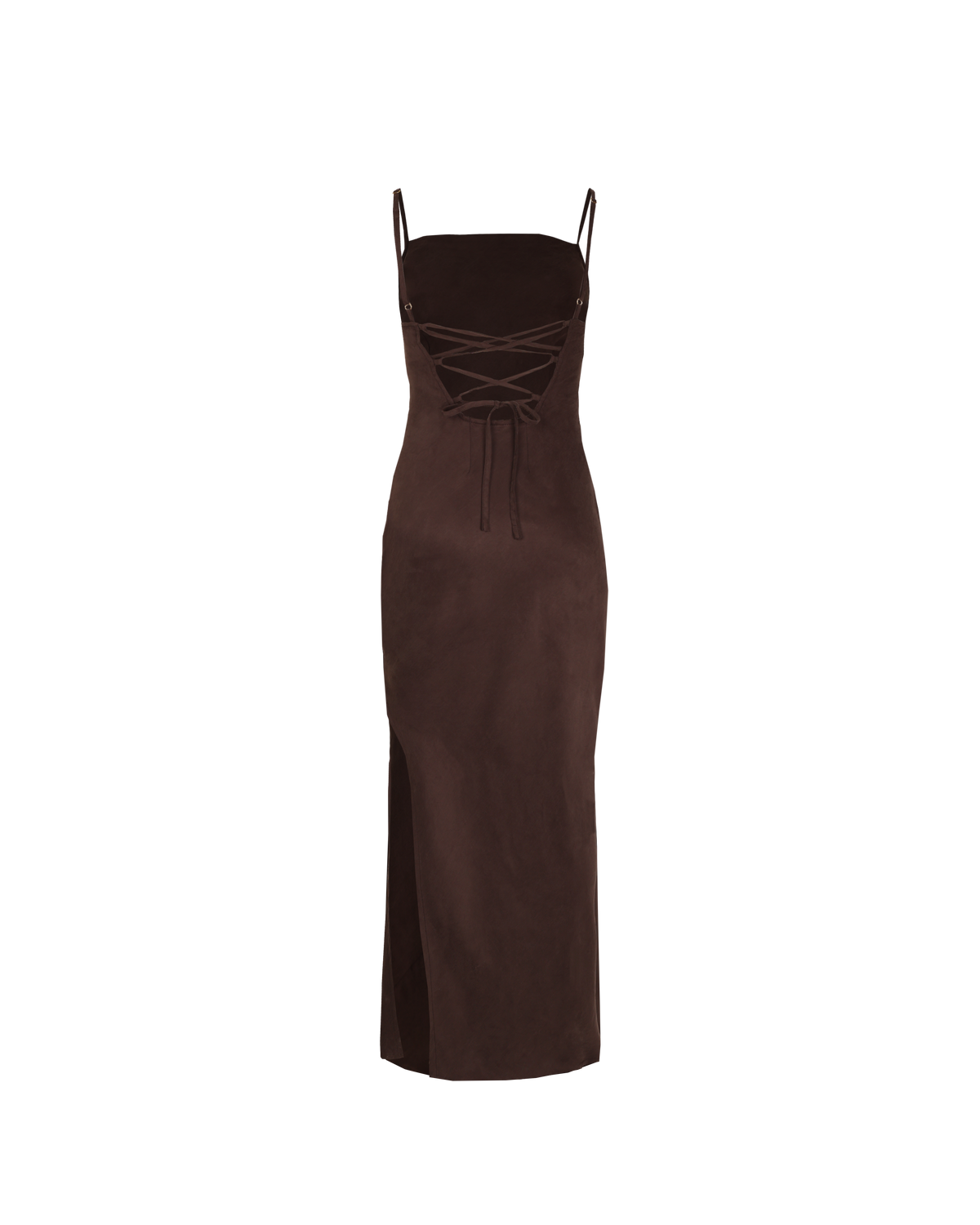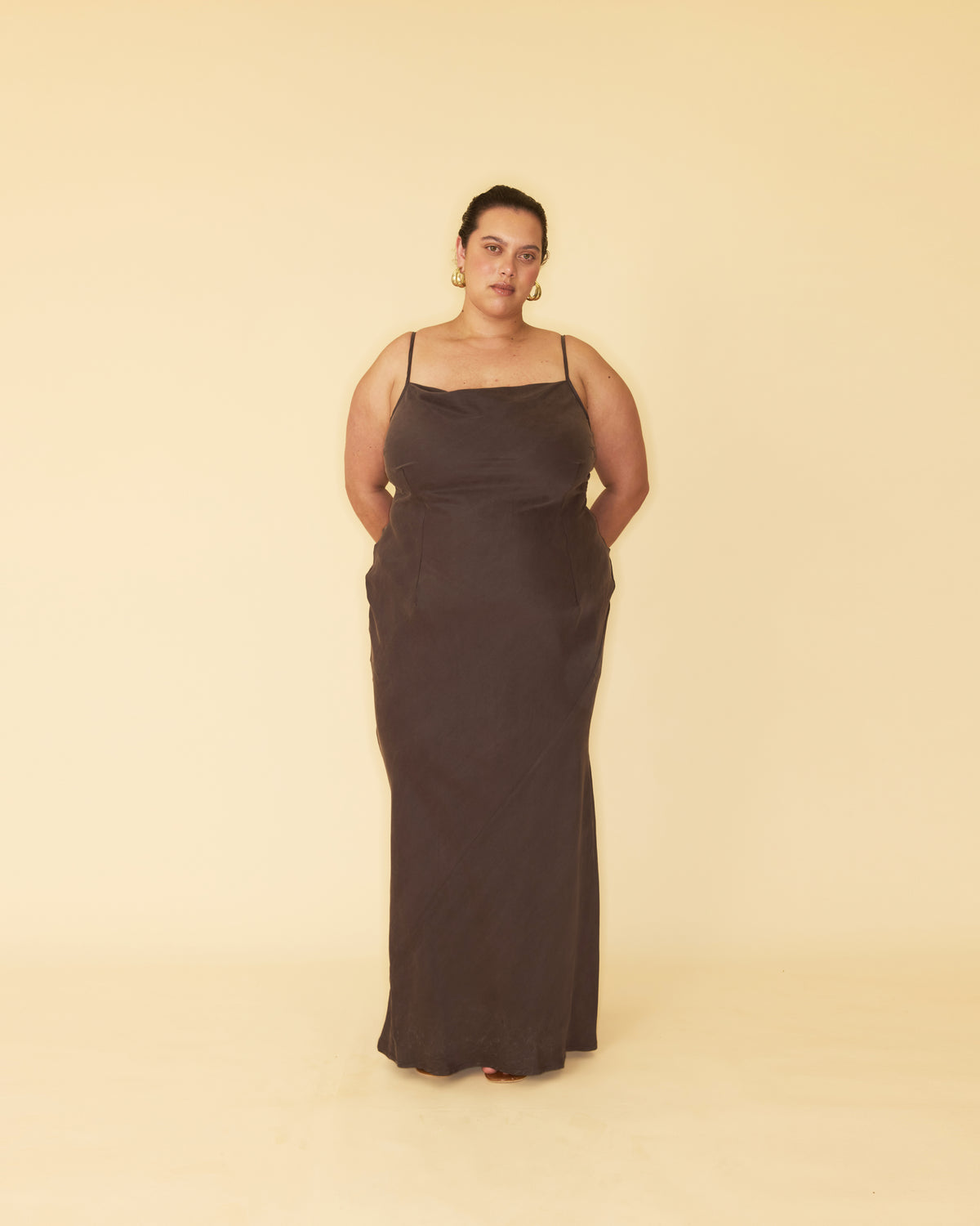 Bias cut slip dress designed in a buttery chocolate cupro. Featuring a built in shelf bra, corset style lace up back, and a side split on one side for ease of movement.