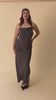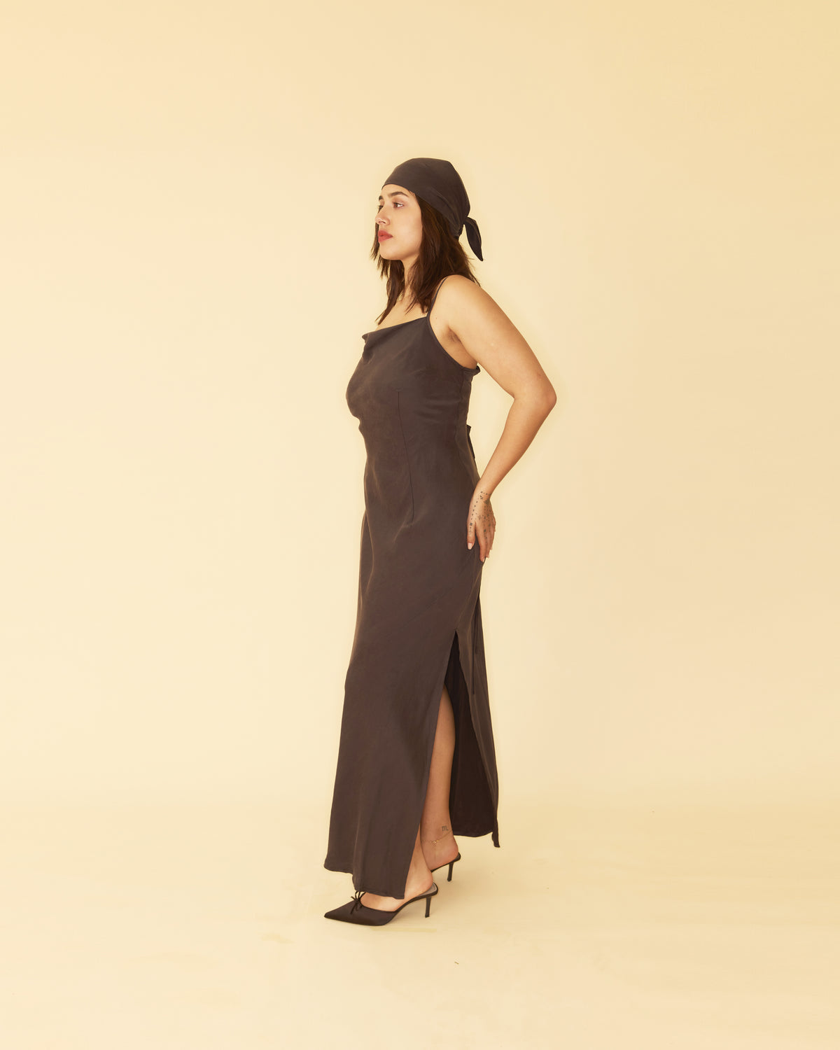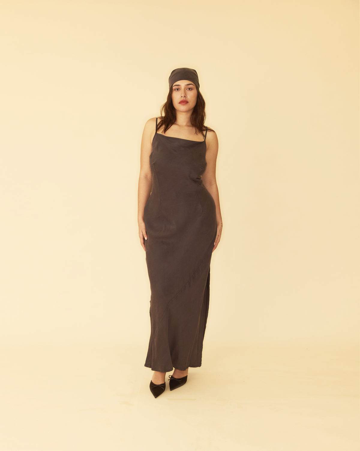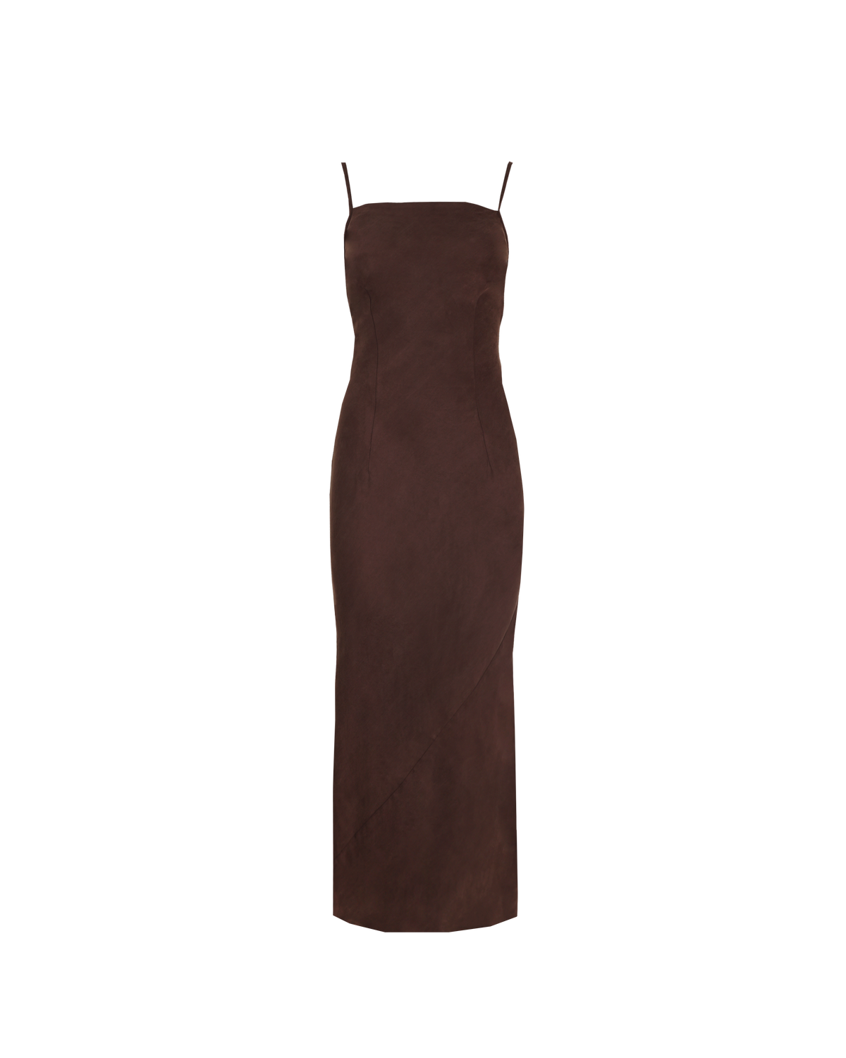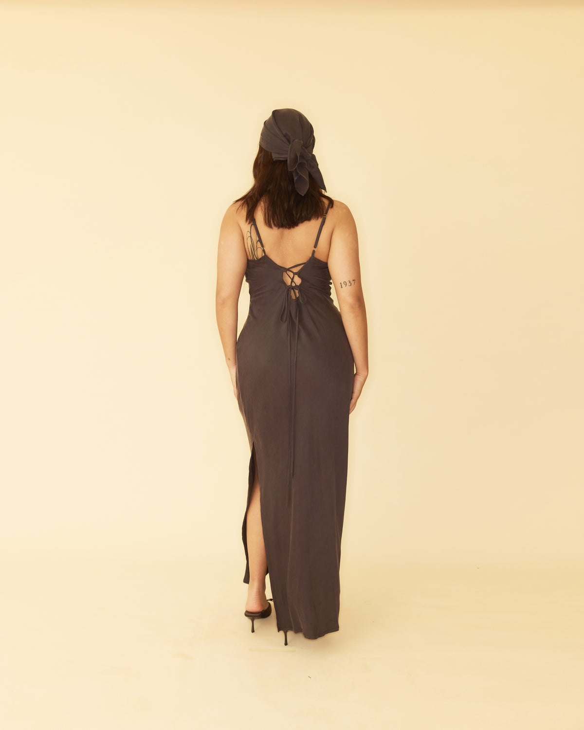 Bias cut slip dress designed in a buttery chocolate cupro. Featuring a built in shelf bra, corset style lace up back, and a side split on one side for ease of movement.