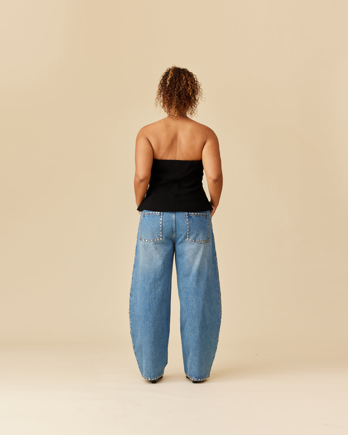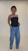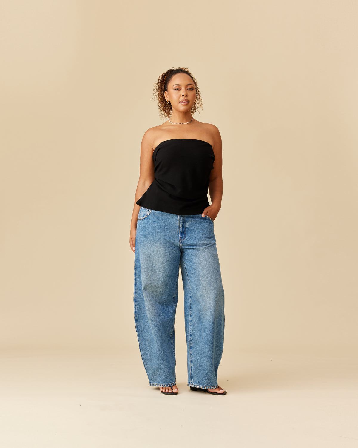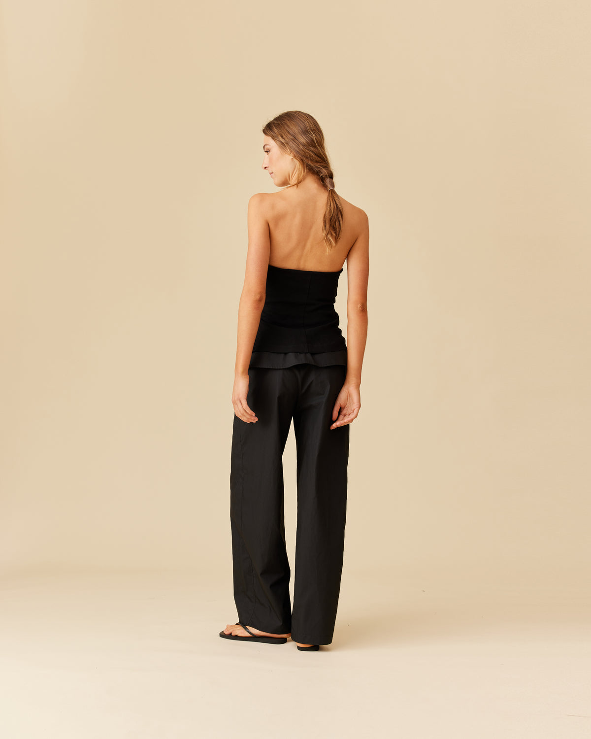 Bodice style top with pleated detail down the front, crafted in a crepe fabric that adds to the structure of the piece. In a strapless silhouette, this piece is darted and slightly fluted at the hem to highlight the nipped-in waist.