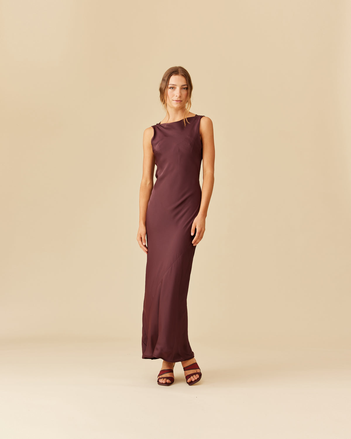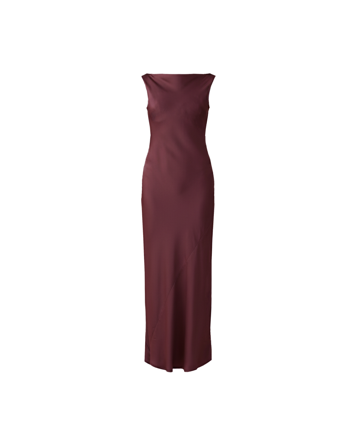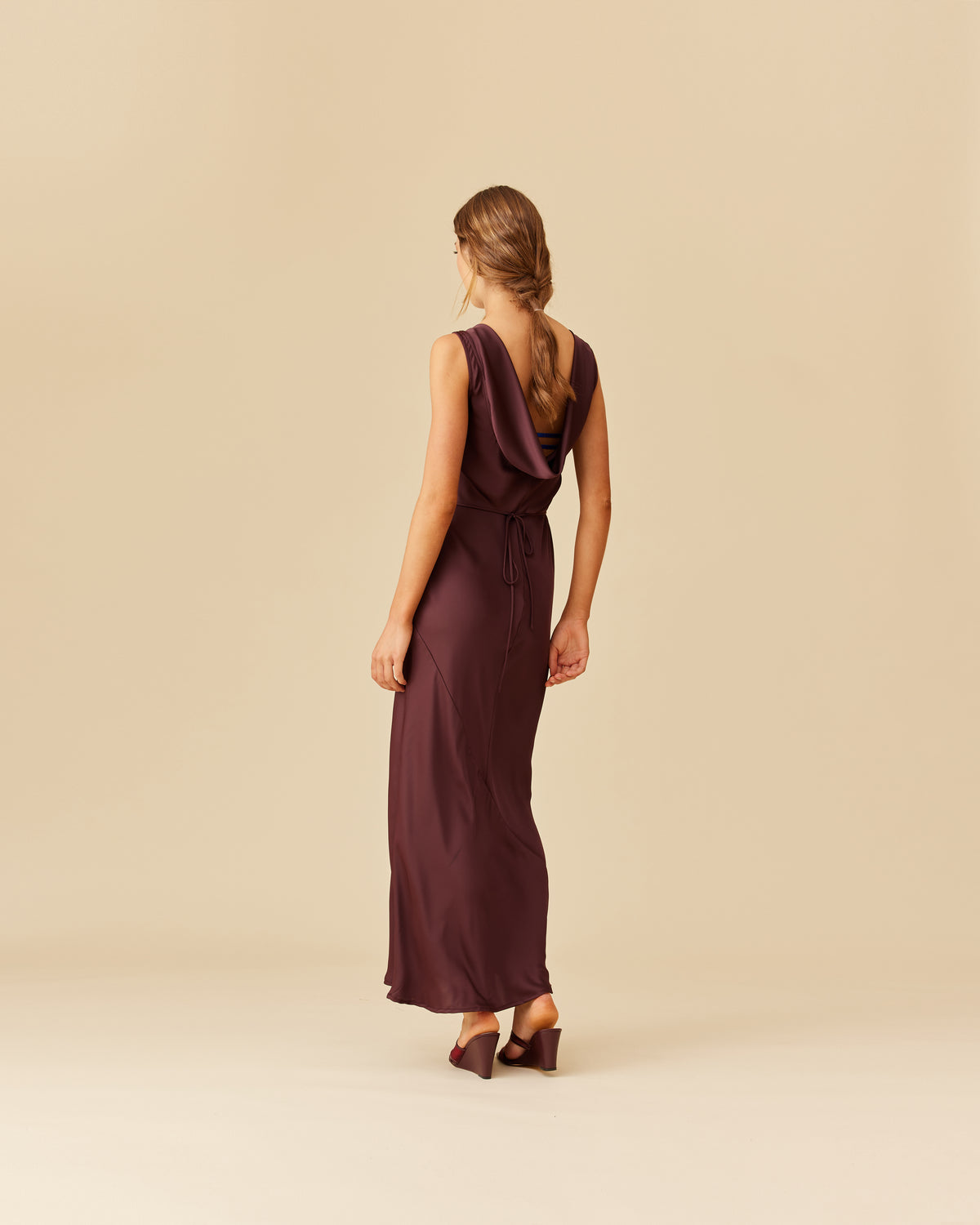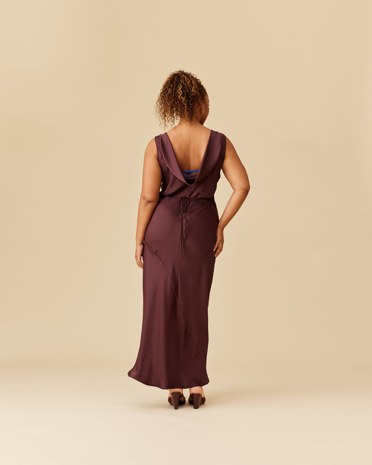 Sleeveless midi dress crafted in rich wine coloured satin. Features a minimal silhouette with a cowl back detail and a tie to cinch in the waist.