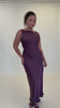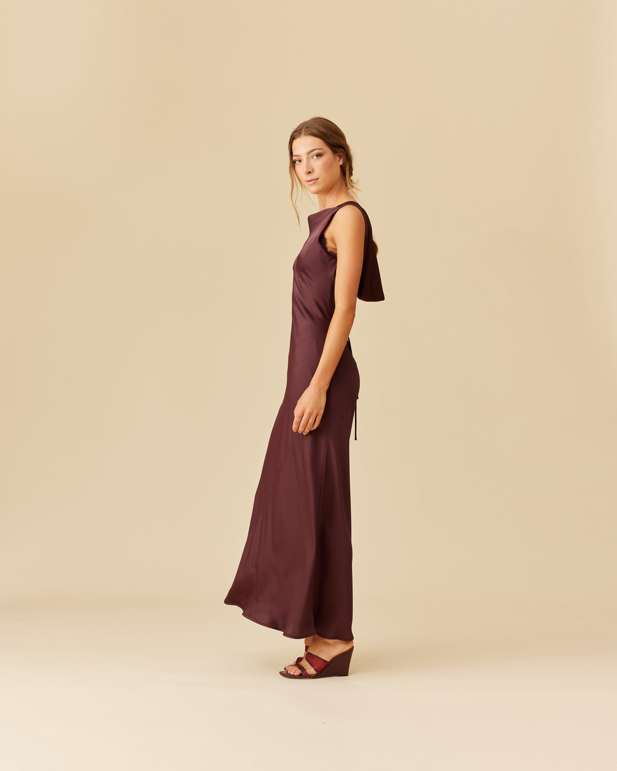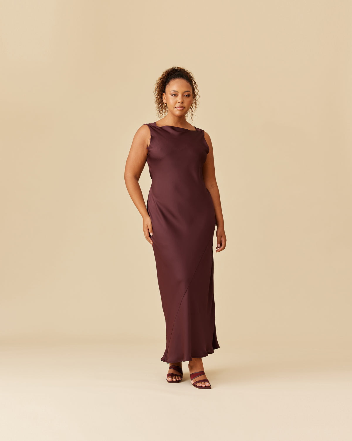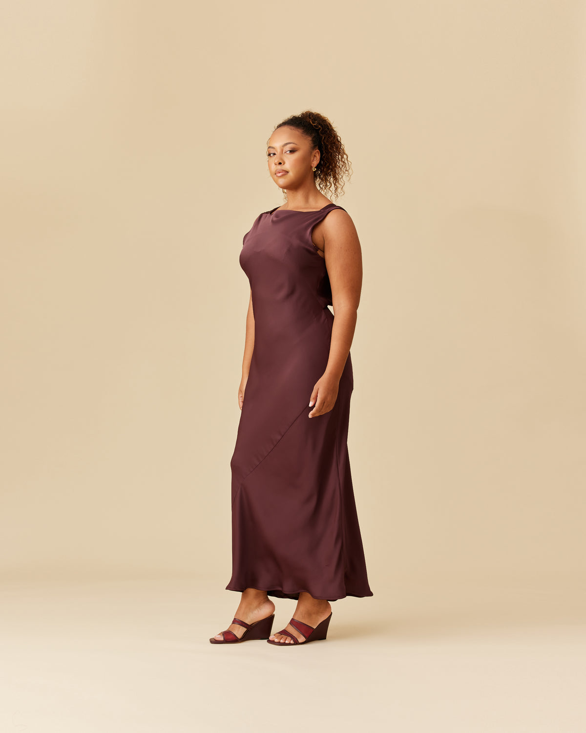 Sleeveless midi dress crafted in rich wine coloured satin. Features a minimal silhouette with a cowl back detail and a tie to cinch in the waist.