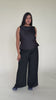 Sleeveless top crafted in a luxe black satin. Features a minimal silhouette with a cowl back detail and a tie to cinch in the waist.