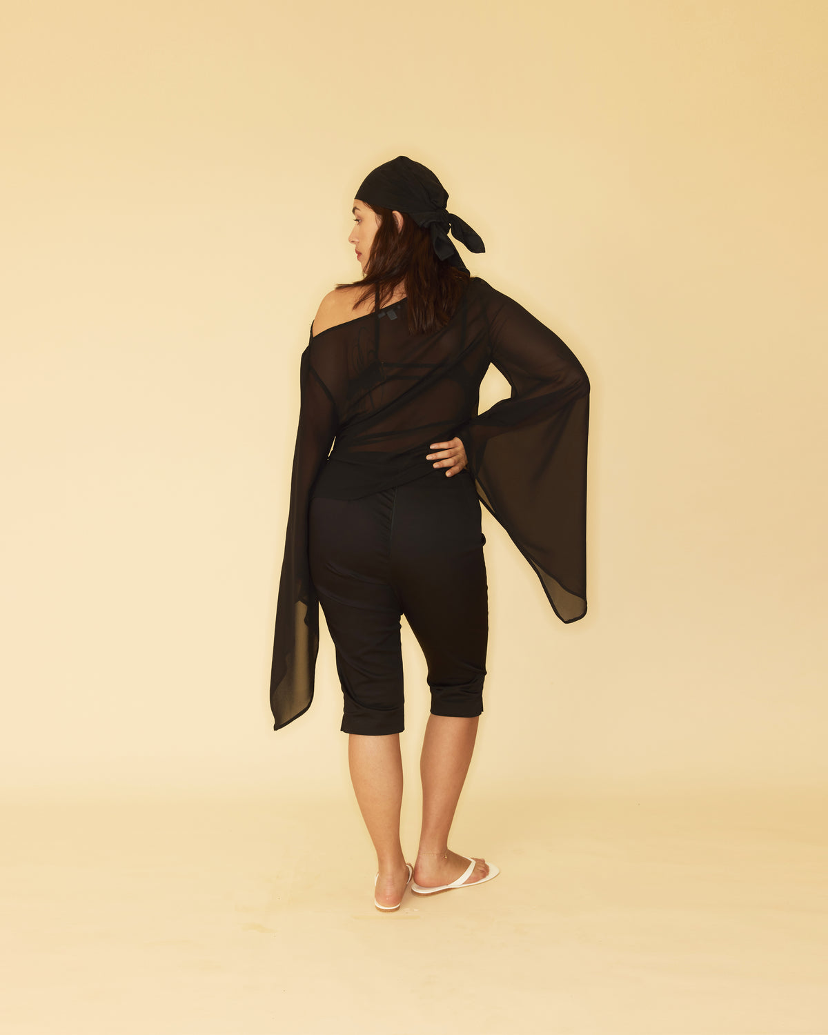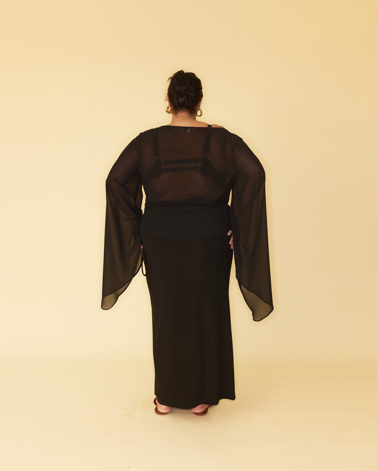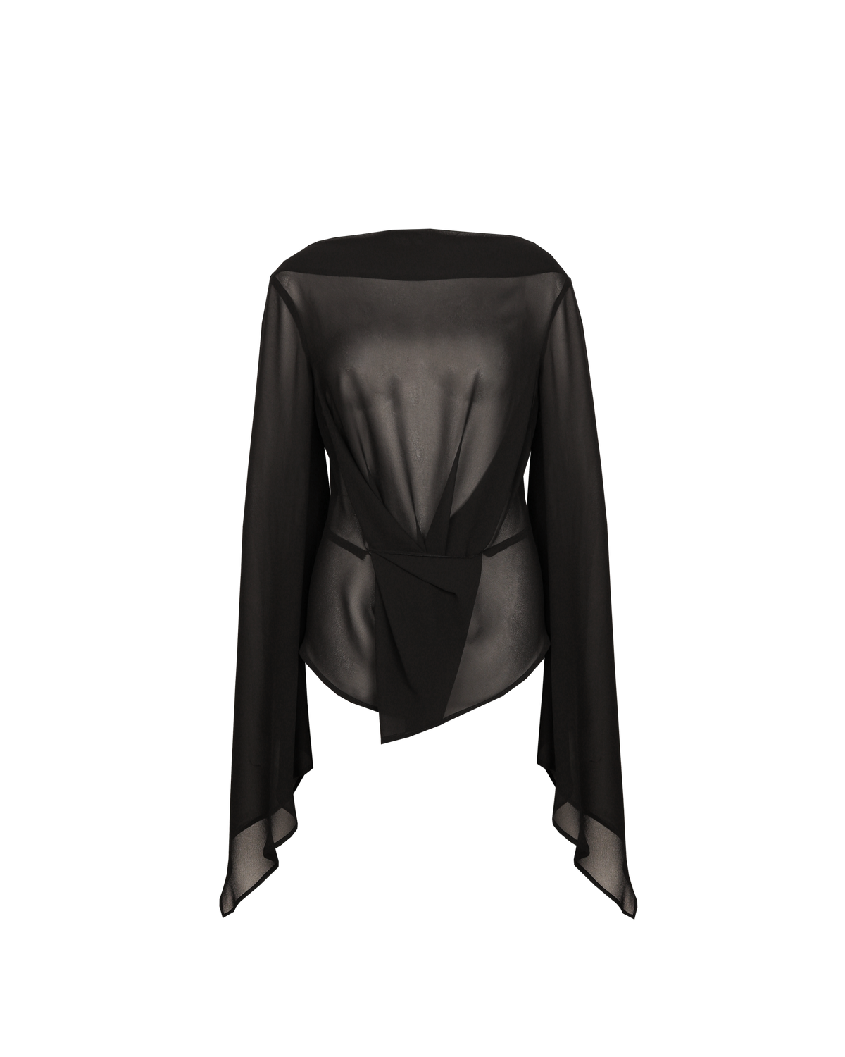 Floaty long sleeve blouse designed in a sheer black chiffon. Featuring a boat neckline, exaggerated bell sleeves, and a flipped detail at the waist that creates a soft draping effect across the body.