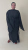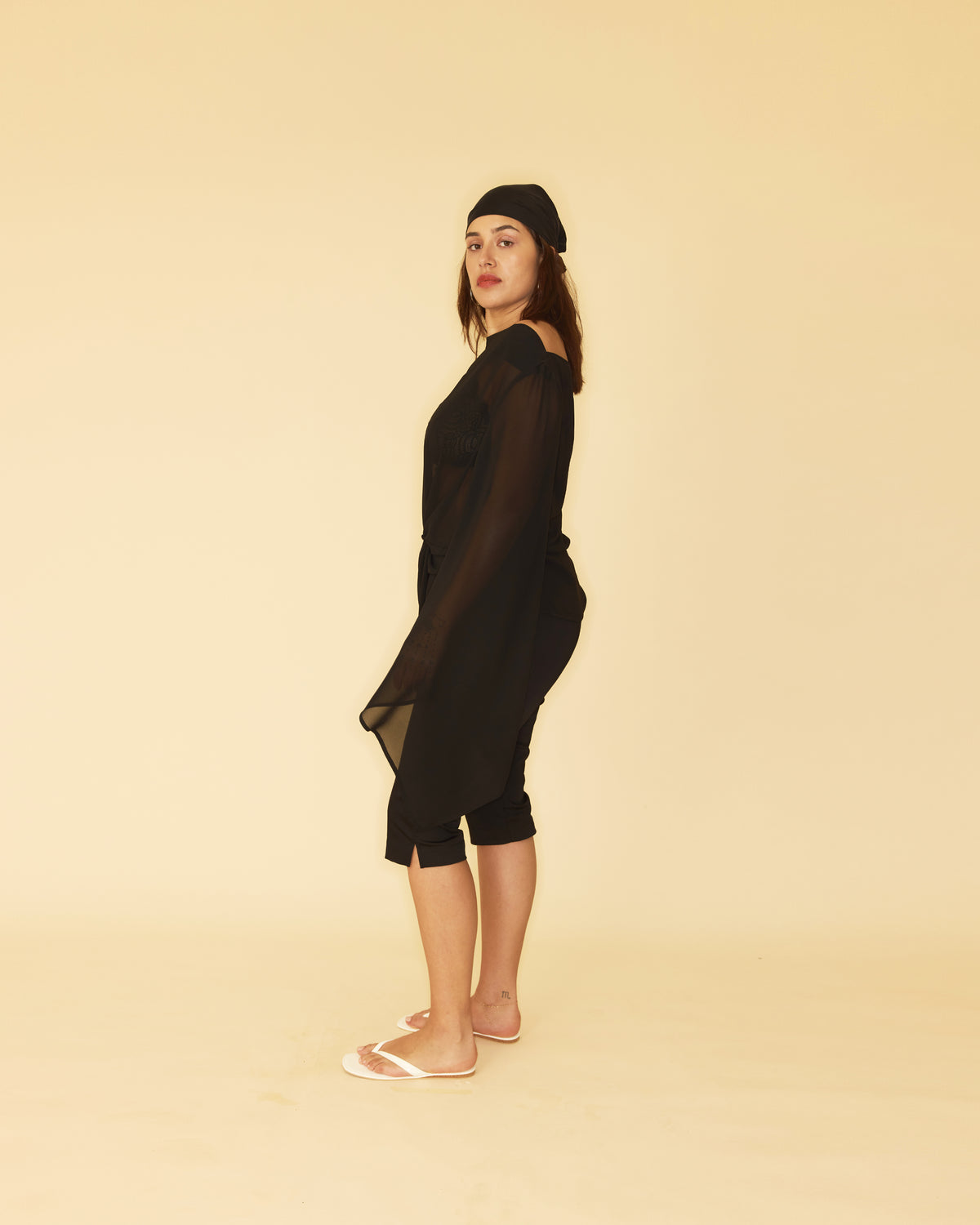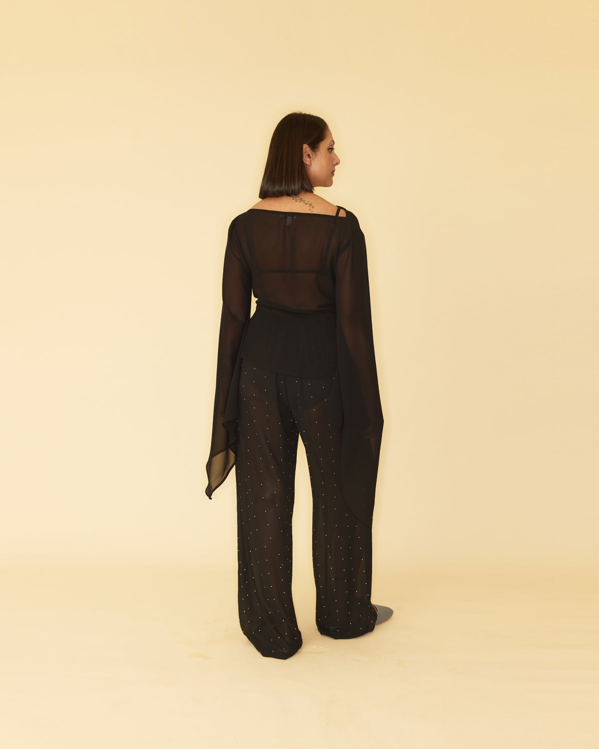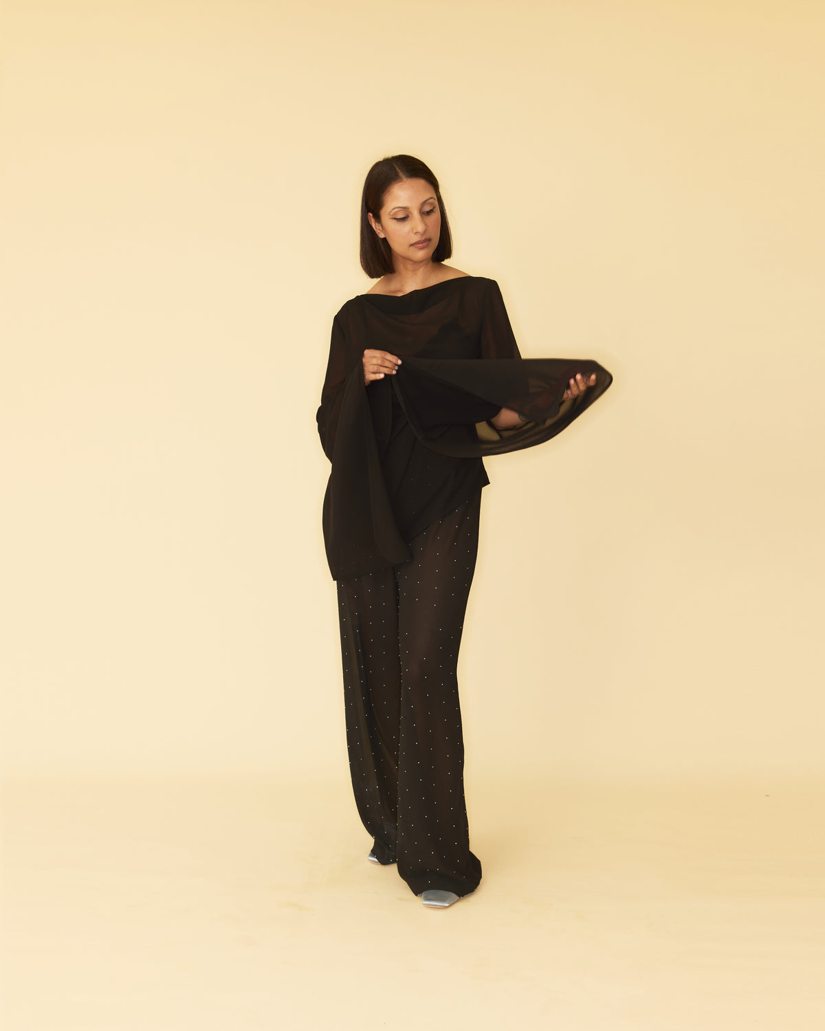 Floaty long sleeve blouse designed in a sheer black chiffon. Featuring a boat neckline, exaggerated bell sleeves, and a flipped detail at the waist that creates a soft draping effect across the body.