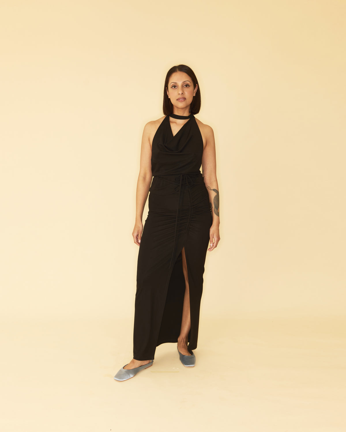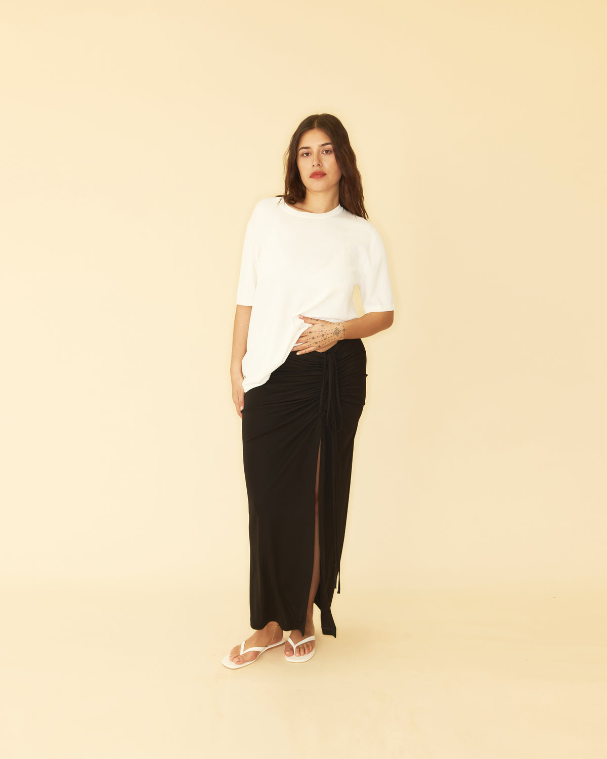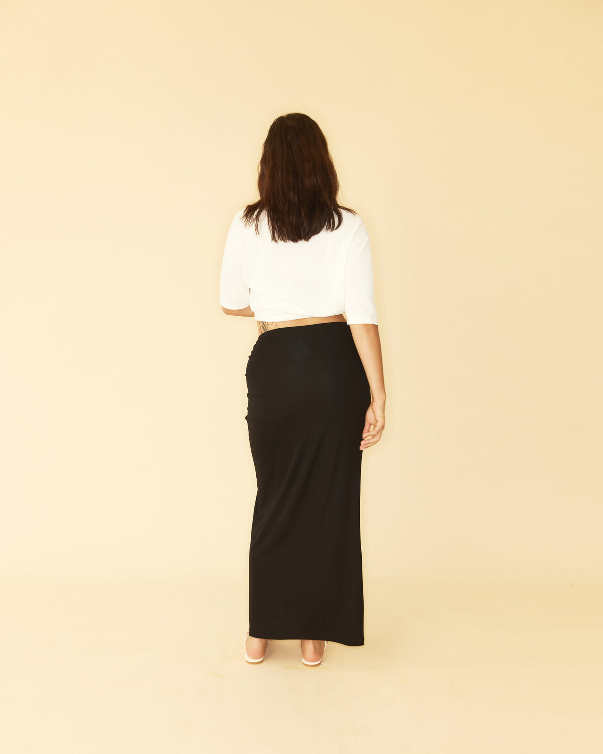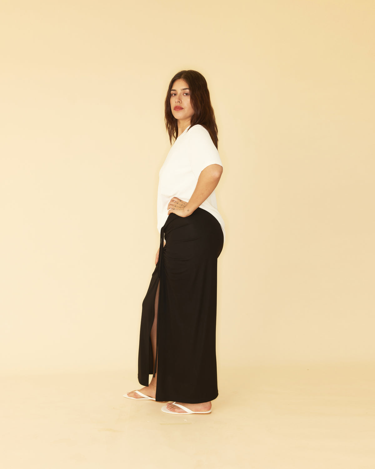 Maxi skirt designed in a black knit stretch viscose. Features an adjustable drawstring tie to gather one side of the skirt. Make it a set with the Flip Knit Halter.