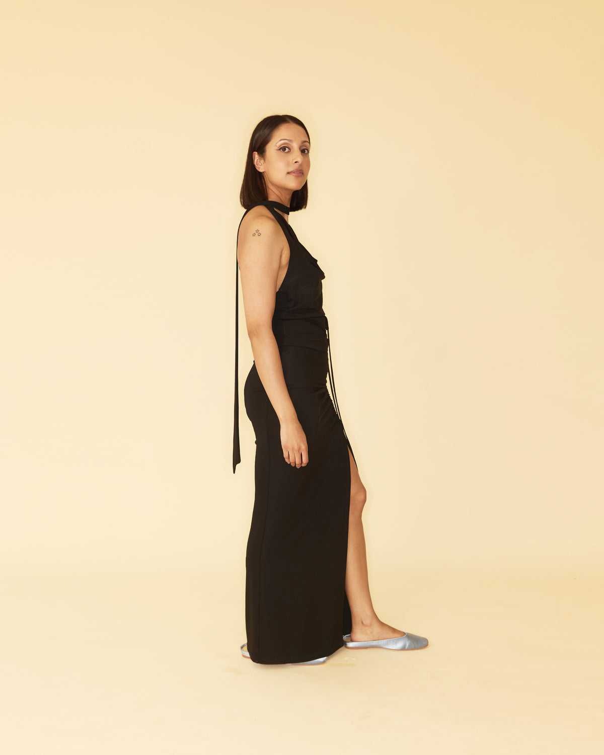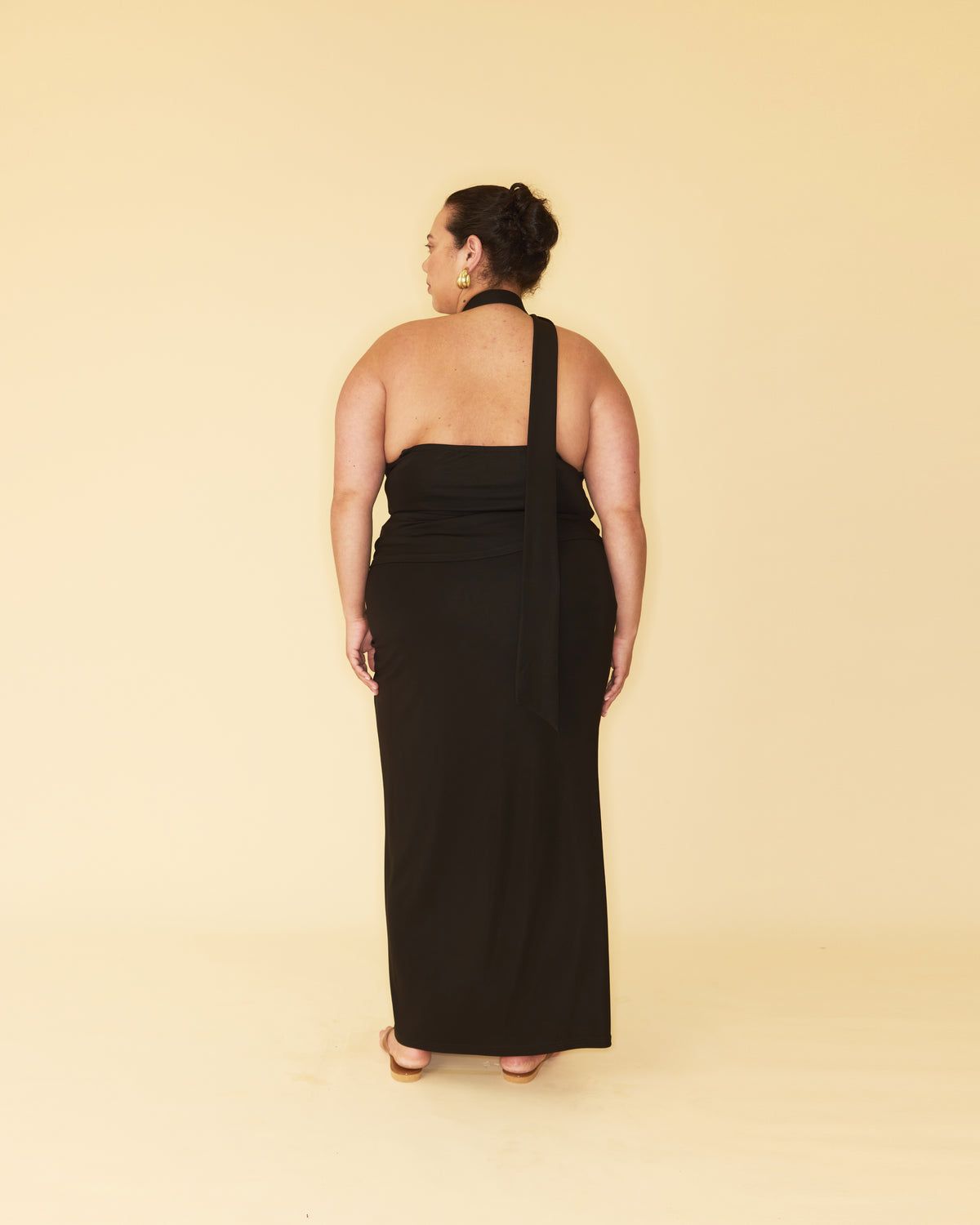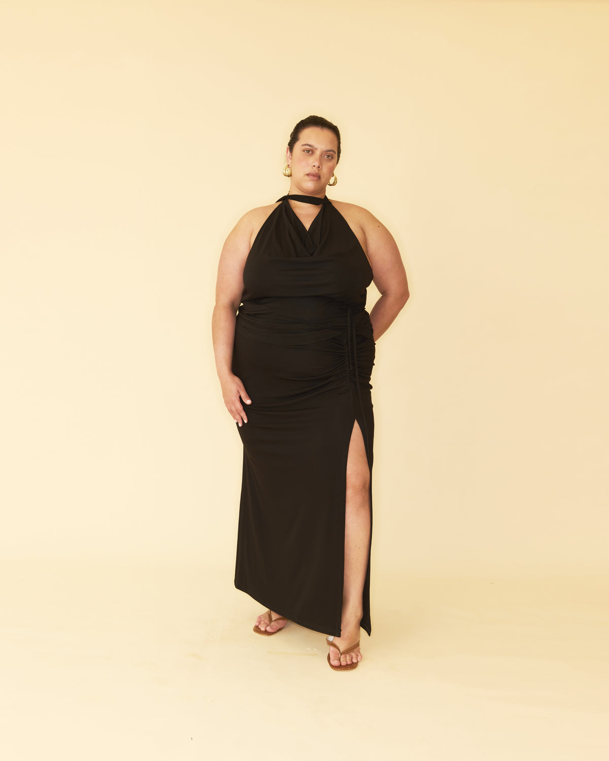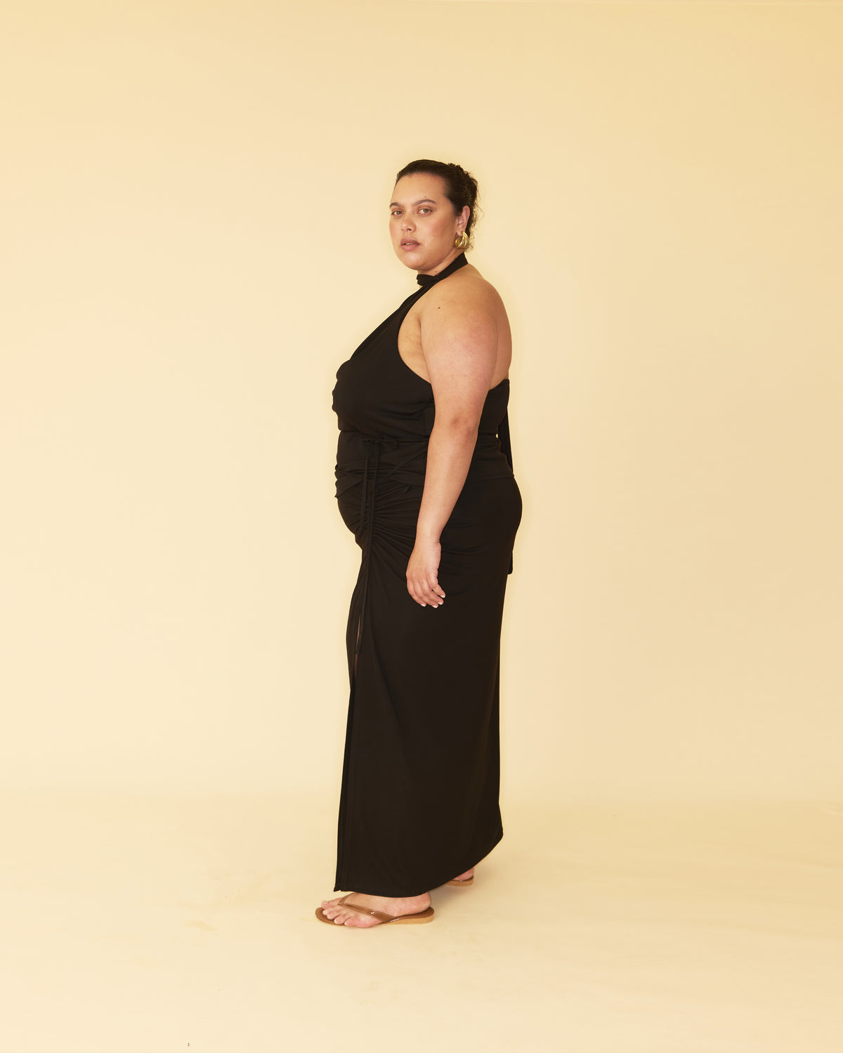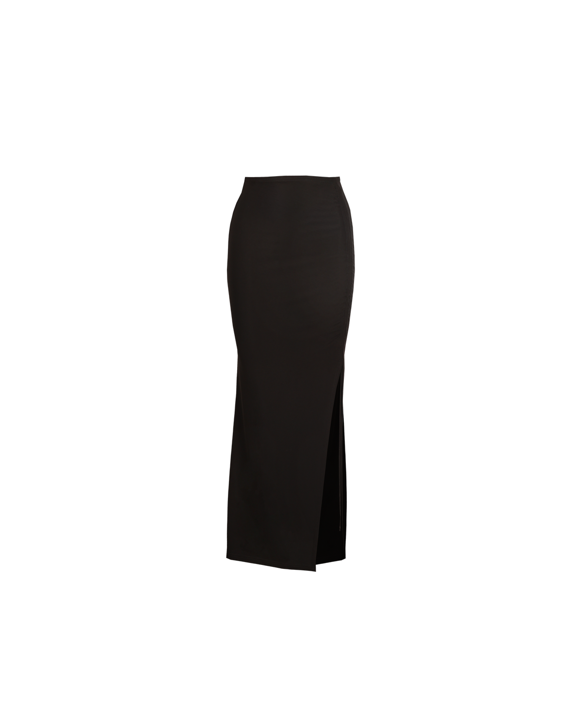 Maxi skirt designed in a black knit stretch viscose. Features an adjustable drawstring tie to gather one side of the skirt. Make it a set with the Flip Knit Halter.