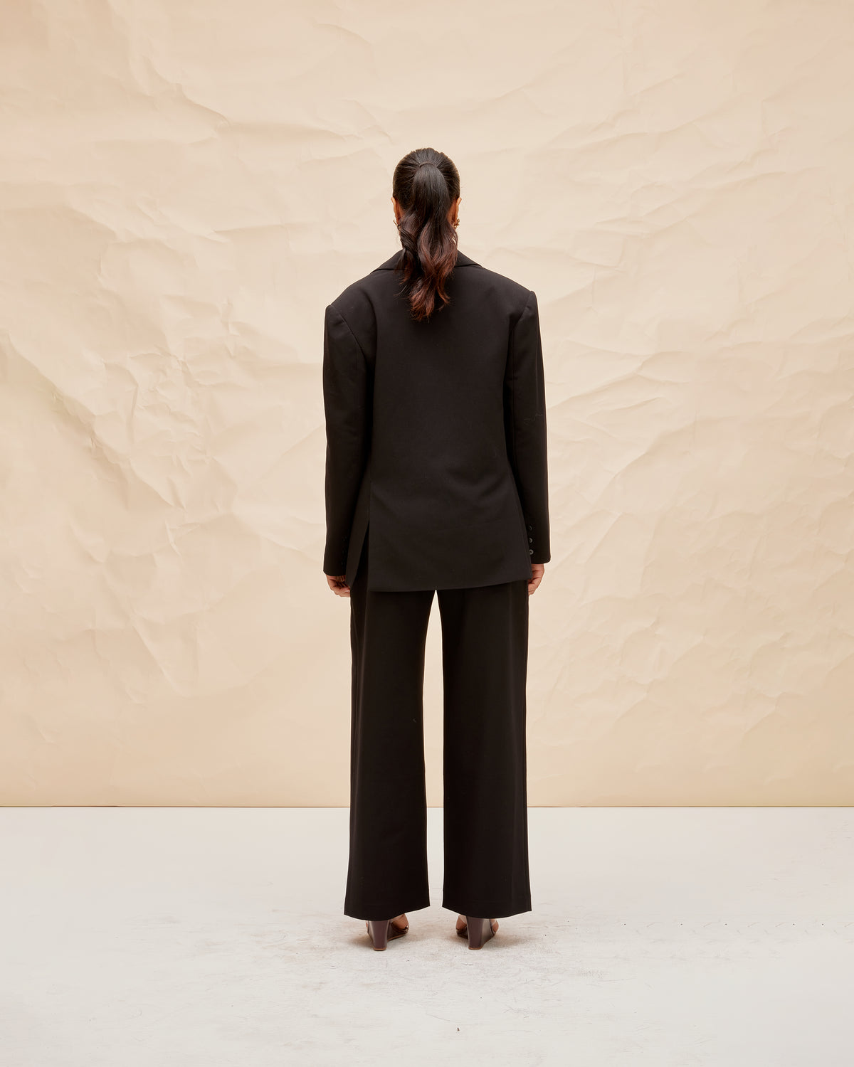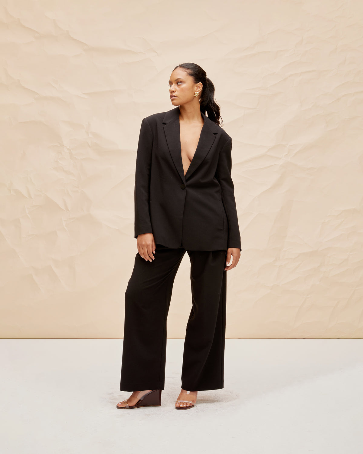 Highwaisted wide leg pant with a crossover waistband in our petite length. The waistband is thick and fits closely to the form, while our new suiting fabric creates structure in the leg.
