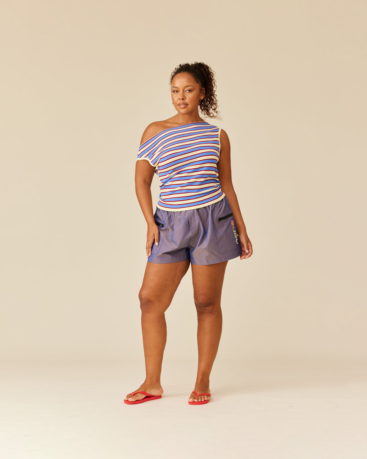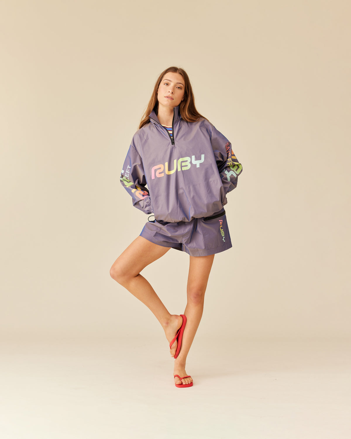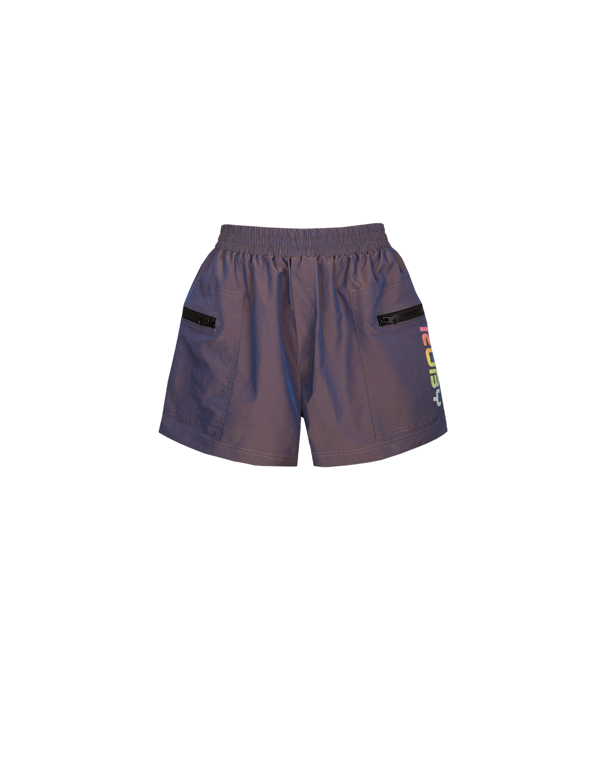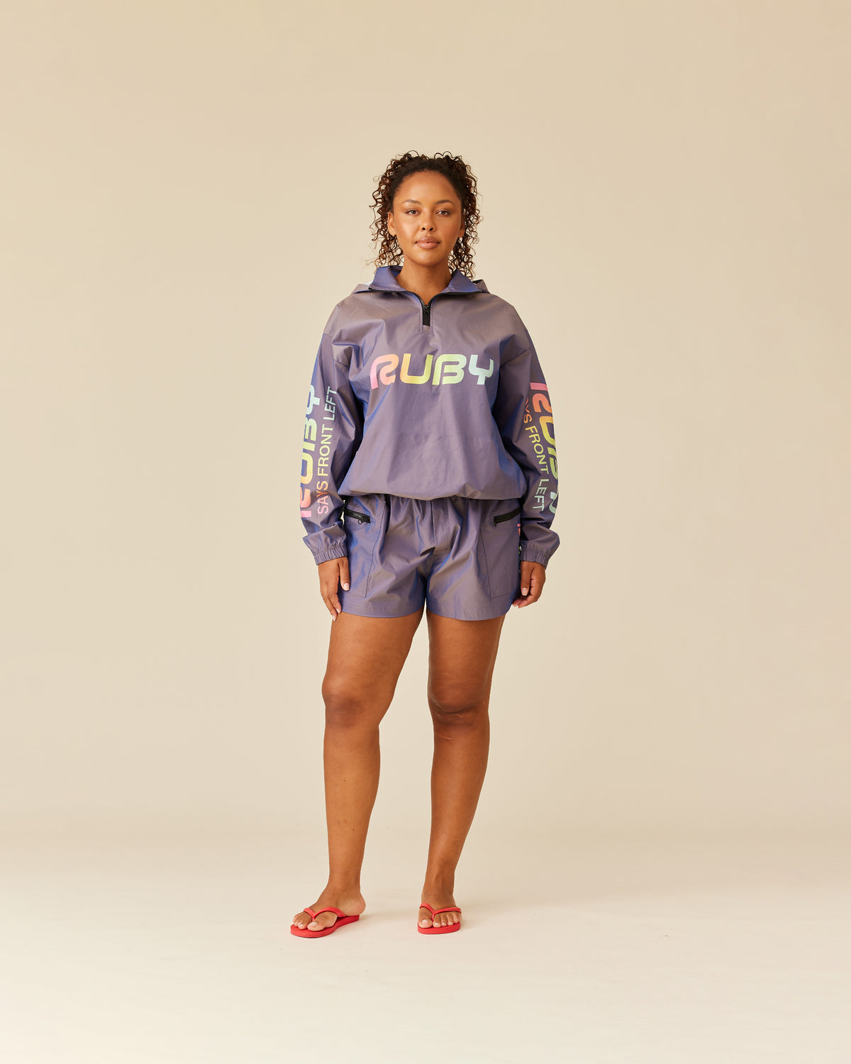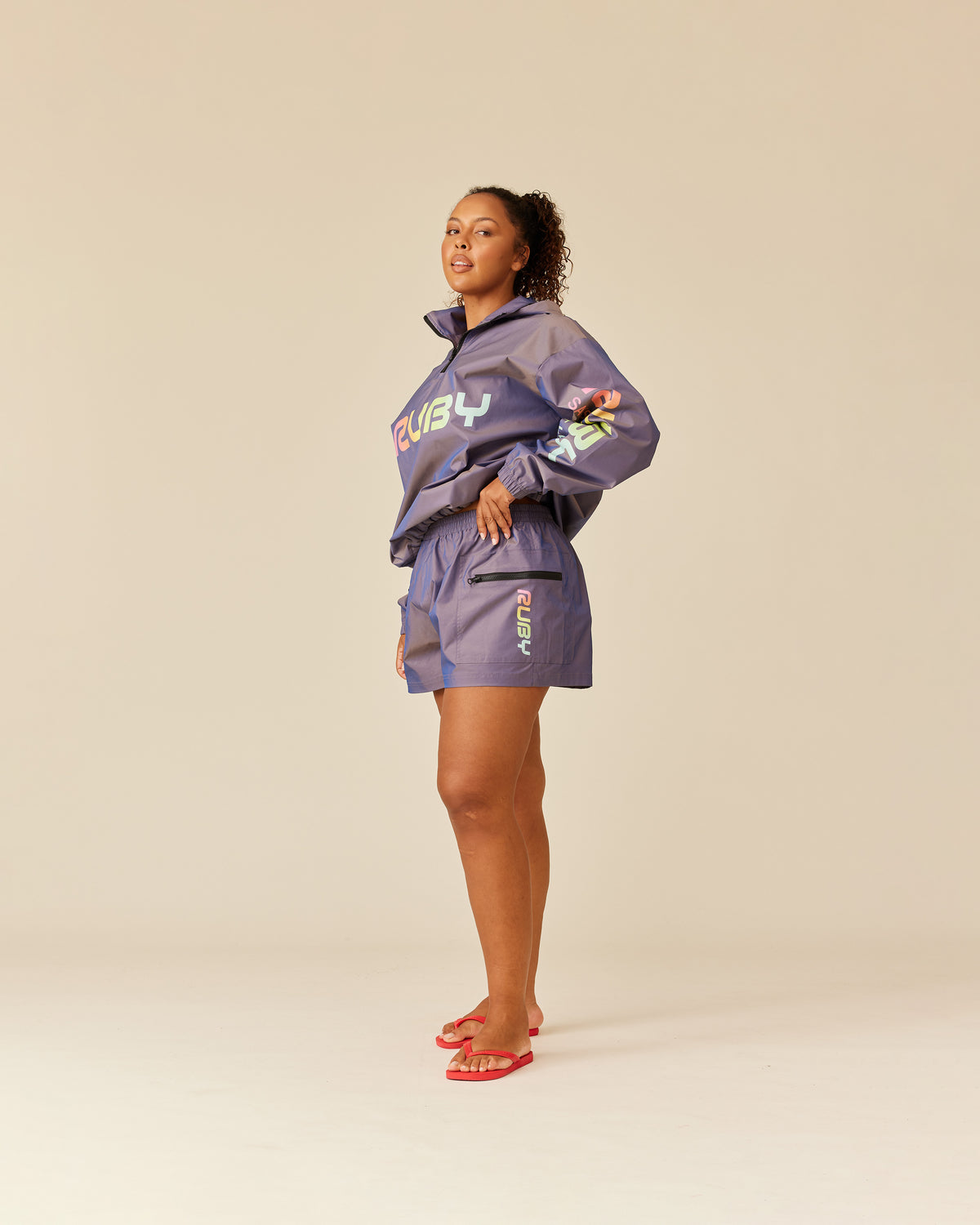 RUBY Says Front Left ~ stand out in the crowd with the ultimate festival short, designed in a showerproof iridescent fabric. With secure zip pockets and an elastic waistband, these shorts can take you from a weekend walk to front of stage. Make it a set with our matching Front Left Parka.