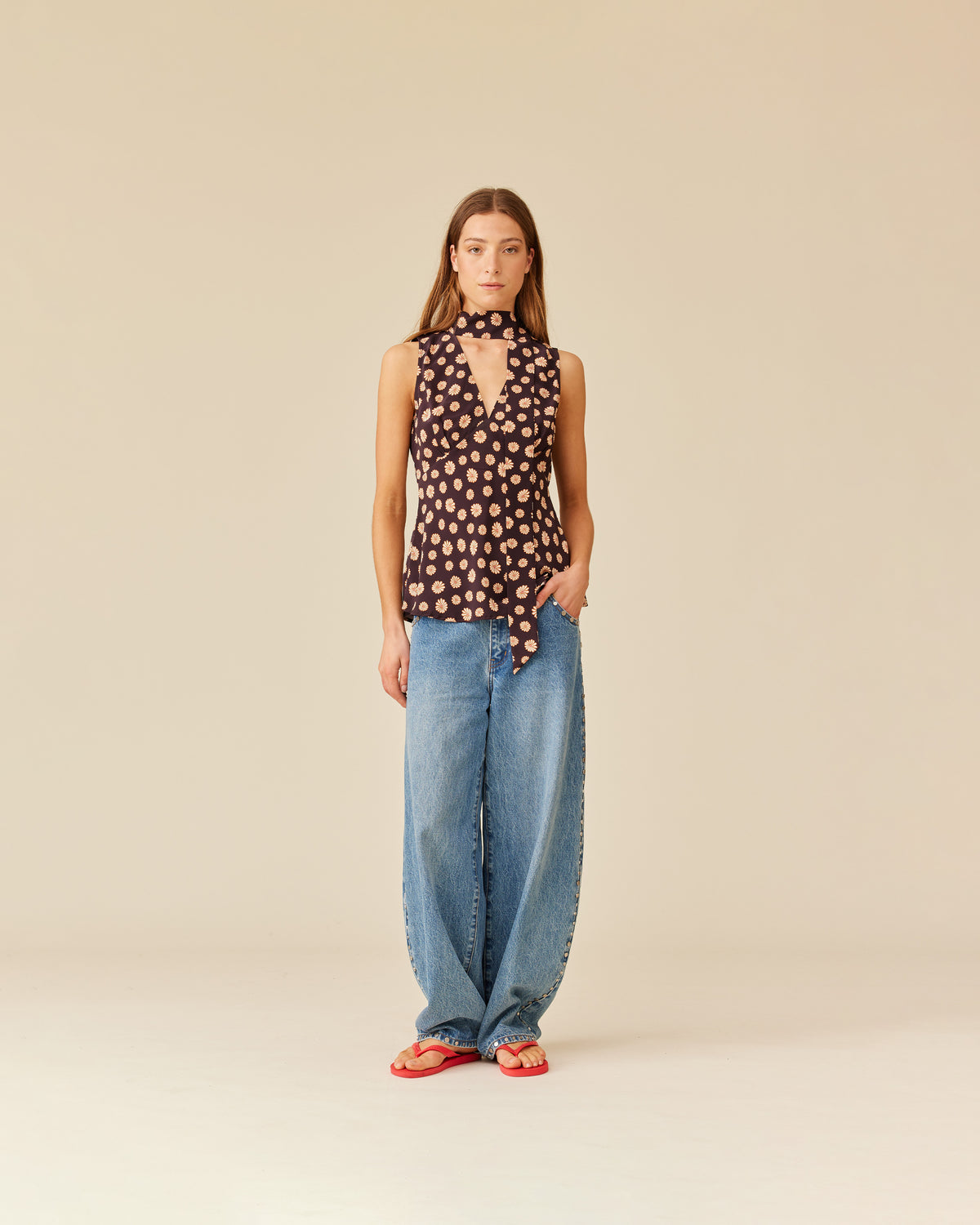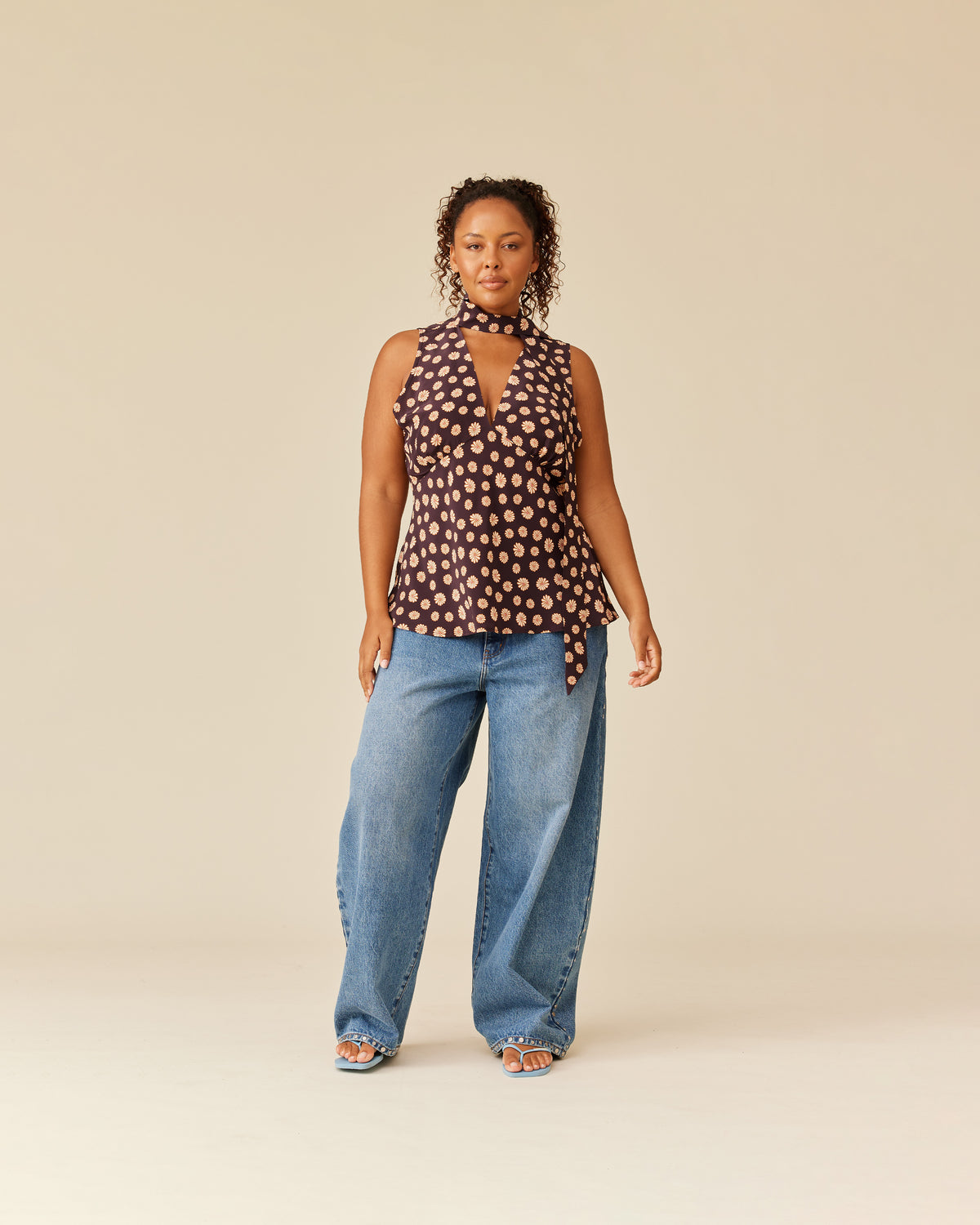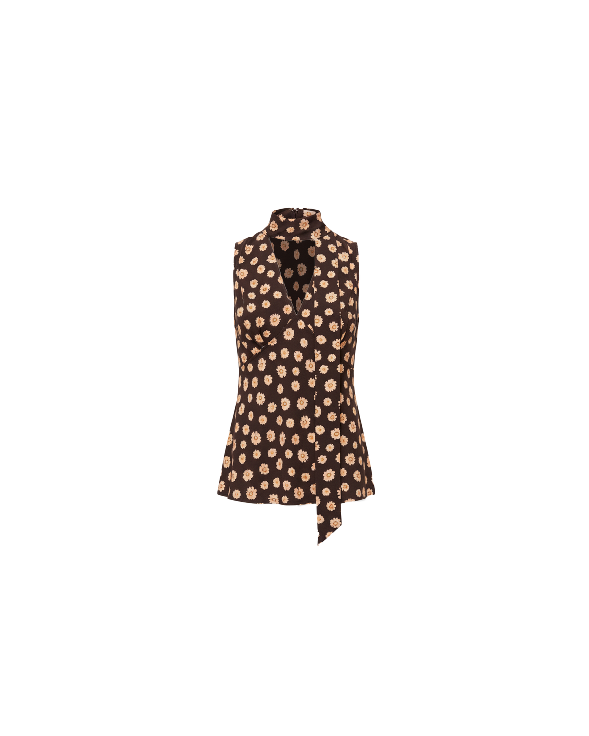 Sleeveless top designed in our brown ditzy floral. This top features a built-in neck scarf that you can wear draped at the front, tied as a neck scarf to the back or tied in a bow at the front.