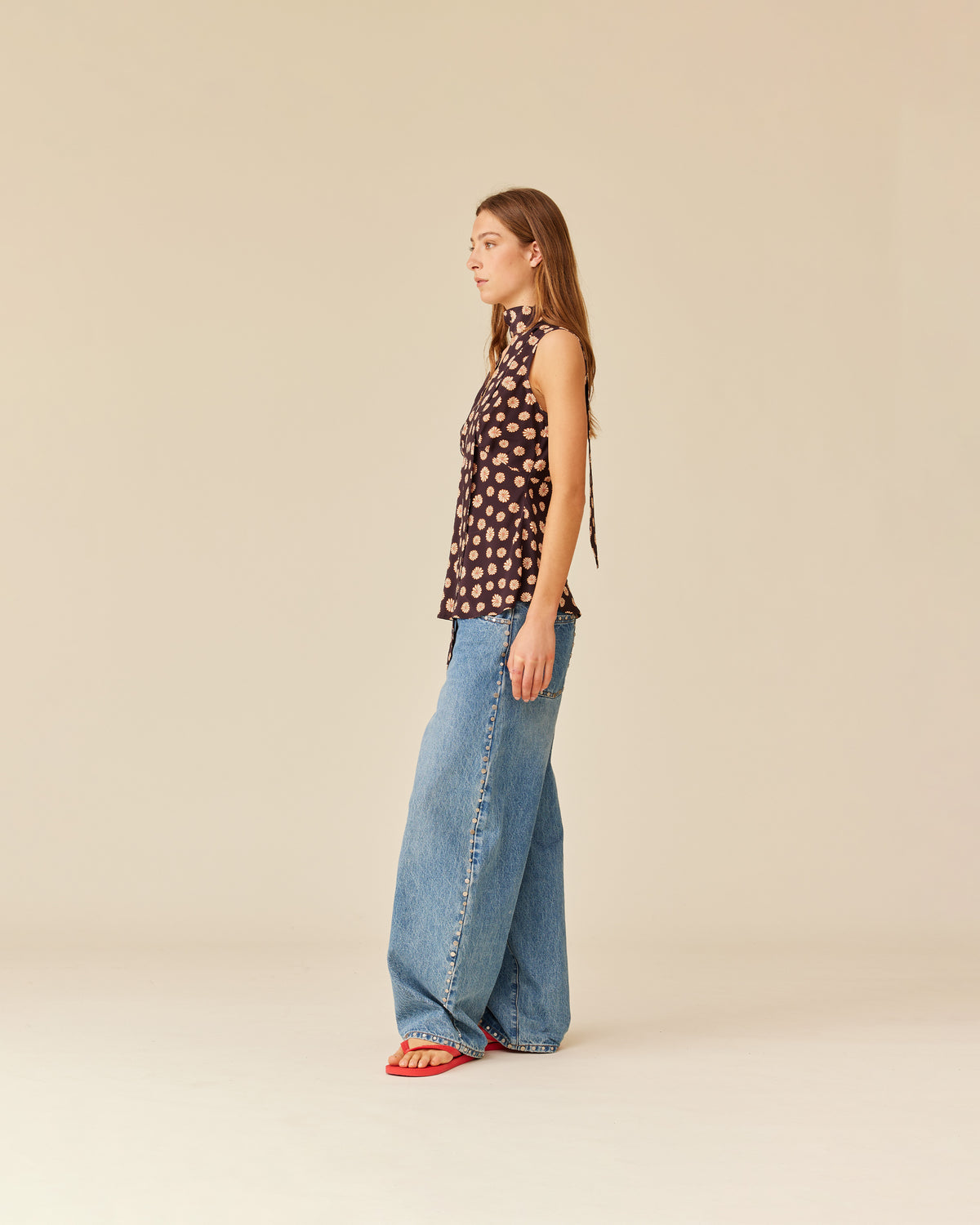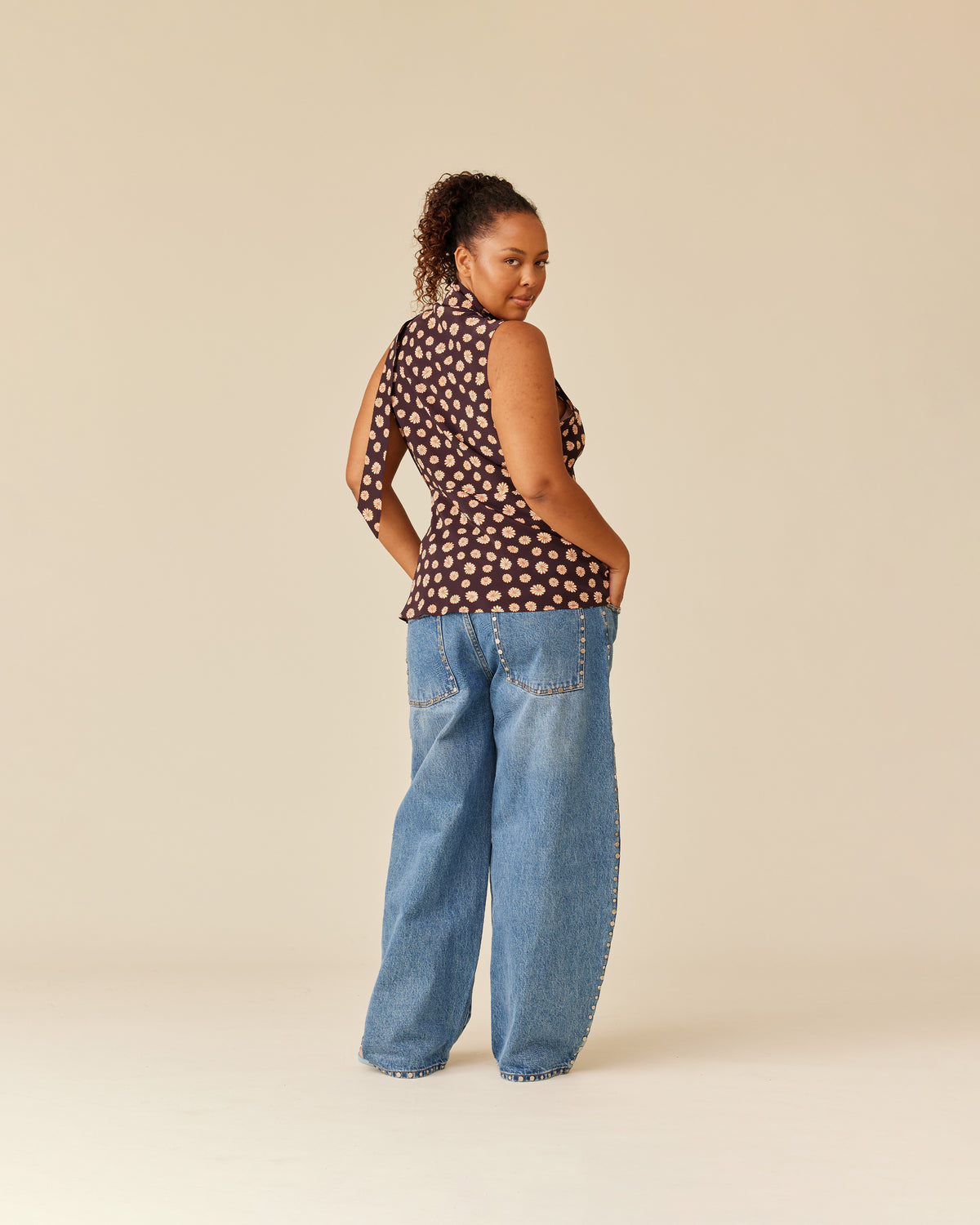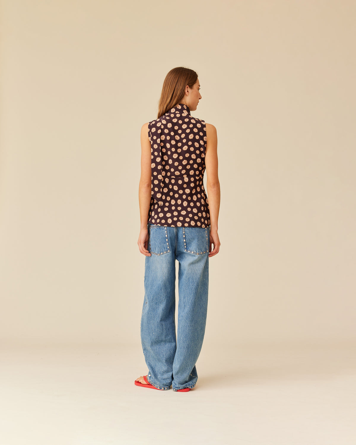 Sleeveless top designed in our brown ditzy floral. This top features a built-in neck scarf that you can wear draped at the front, tied as a neck scarf to the back or tied in a bow at the front.