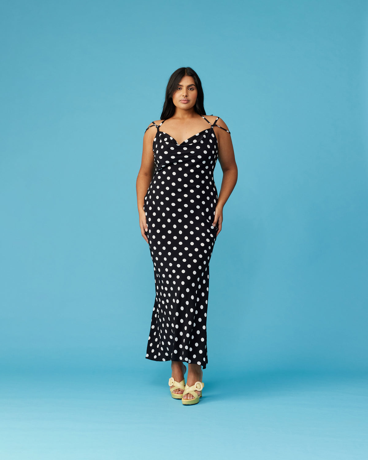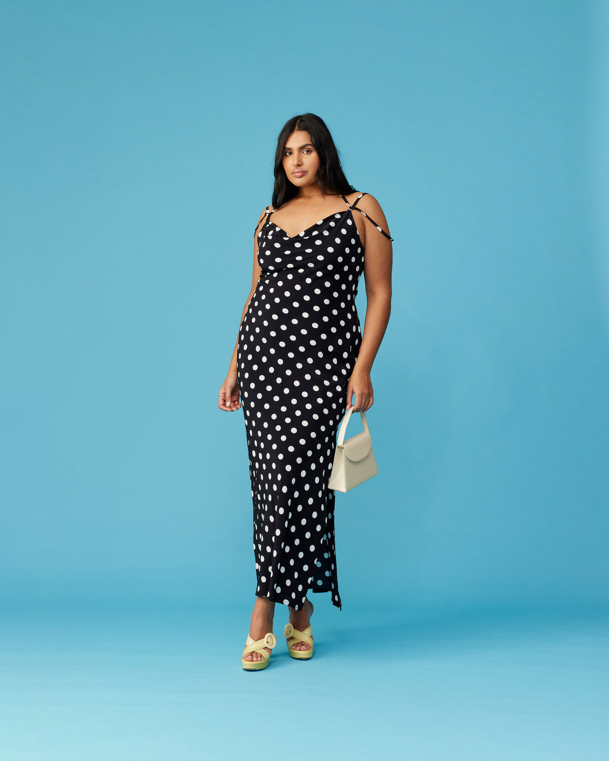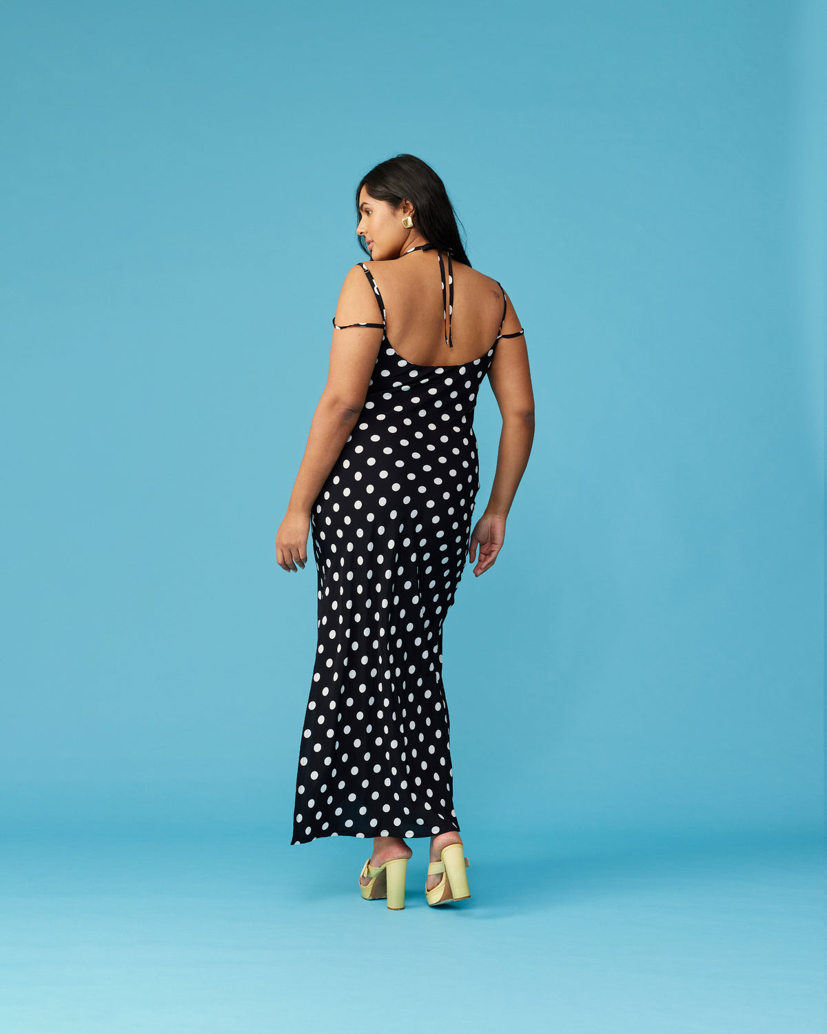 Bias cut cowl neck slip with a double strap detail and halter neck tie. Imagined in a black and white polka dot crepe with a silk-like feel, this slip will be a forever item in your wardrobe.