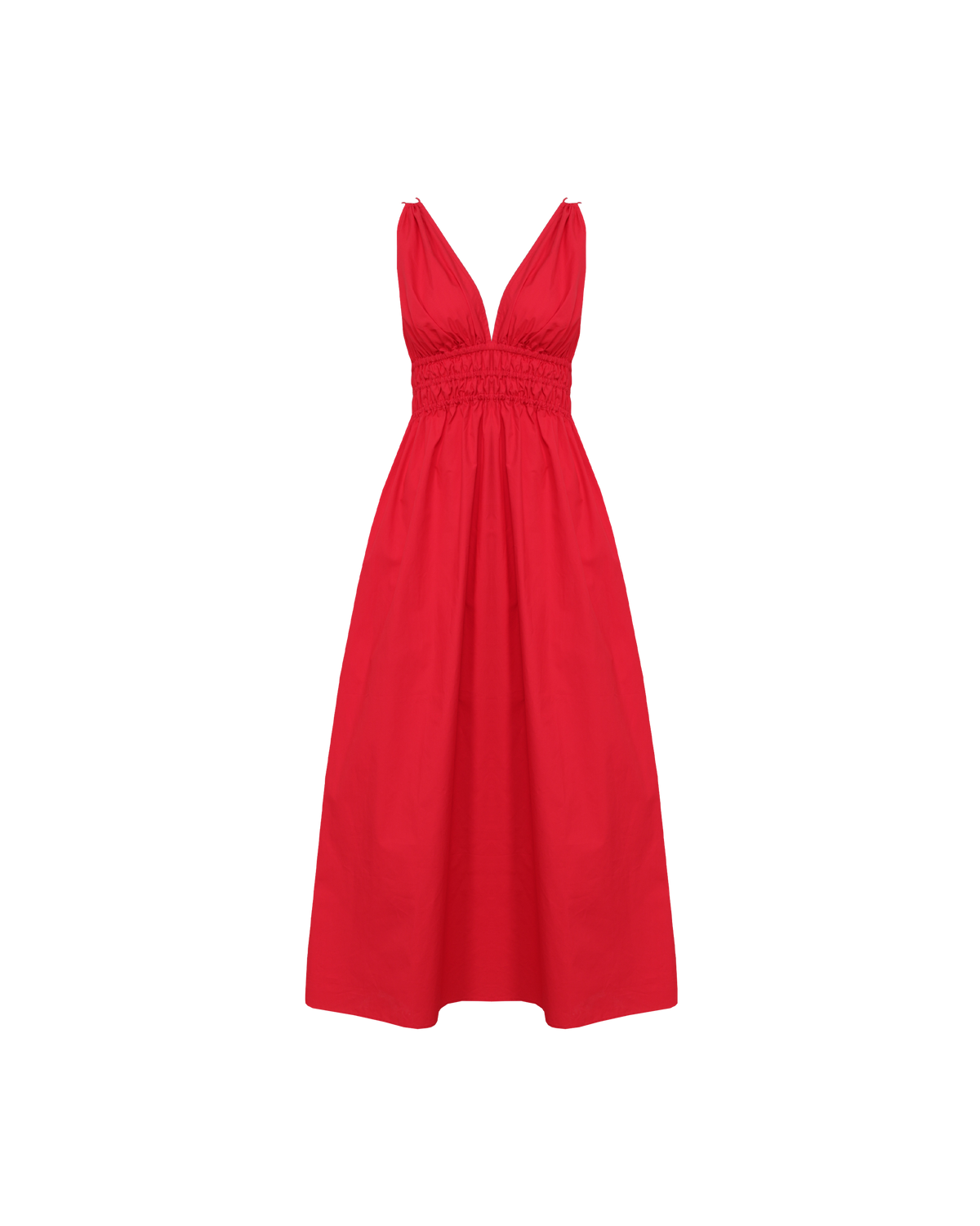 Double strap maxi dress with a plunge neckline, shirred waist detail, and side split in a cherry red cotton. The shirring at the waist accentuates the full skirt.