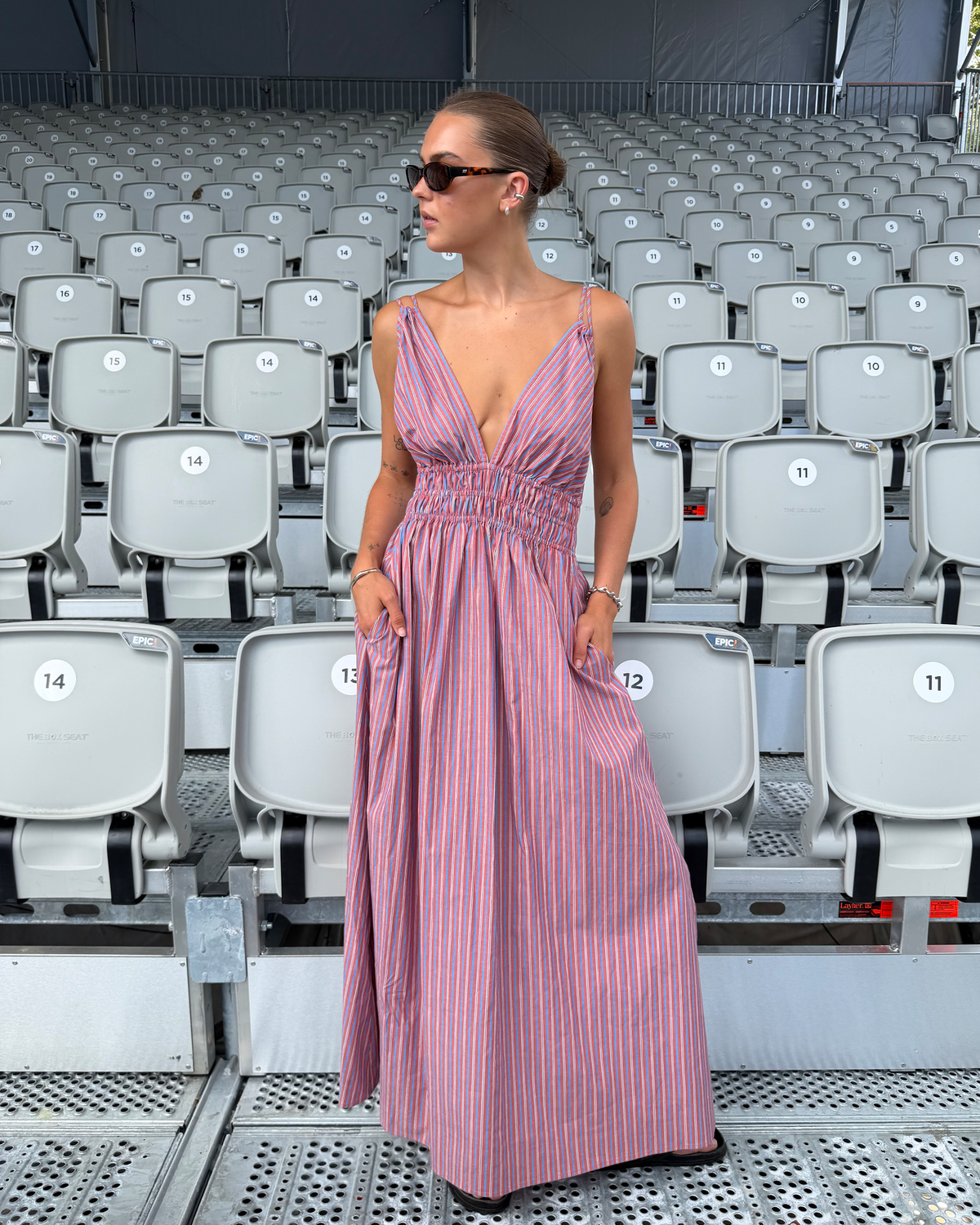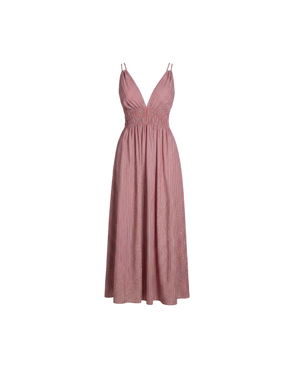 Double strap maxi dress with a plunge neckline, shirred waist detail, and side split in an organic striped cotton. The shirring at the waist accentuates the full skirt.