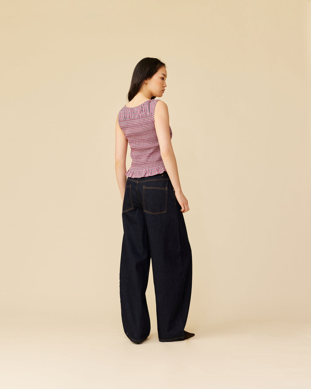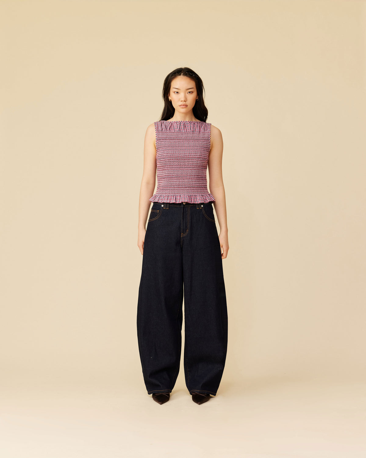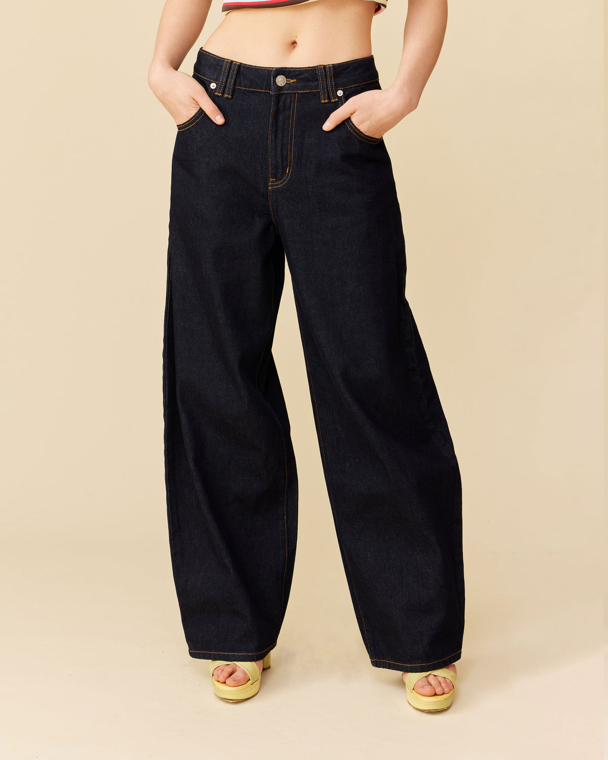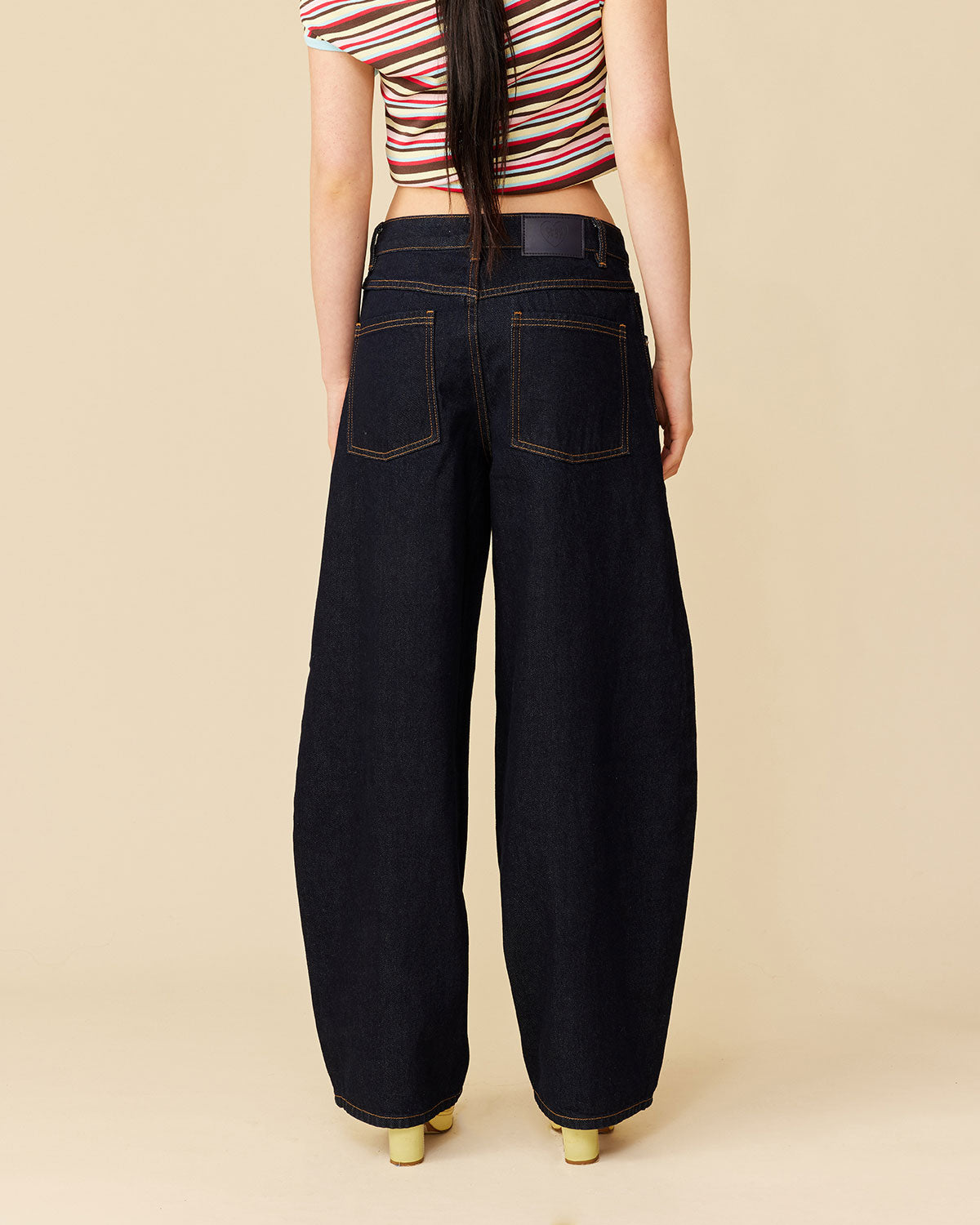Barrel-leg jean designed in our signature un-washed denim. Sits mid-waisted with classic 5 pocket and waistband detailing. A pared back version of our Buzz Jean.