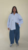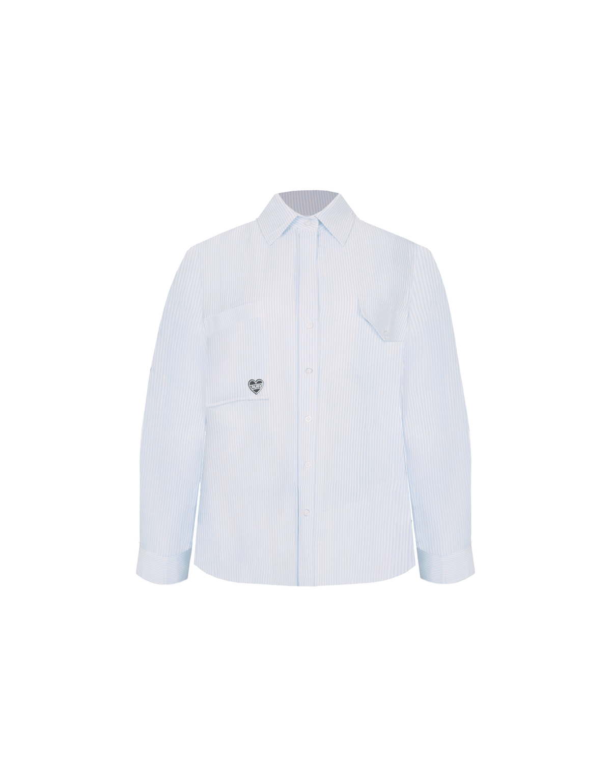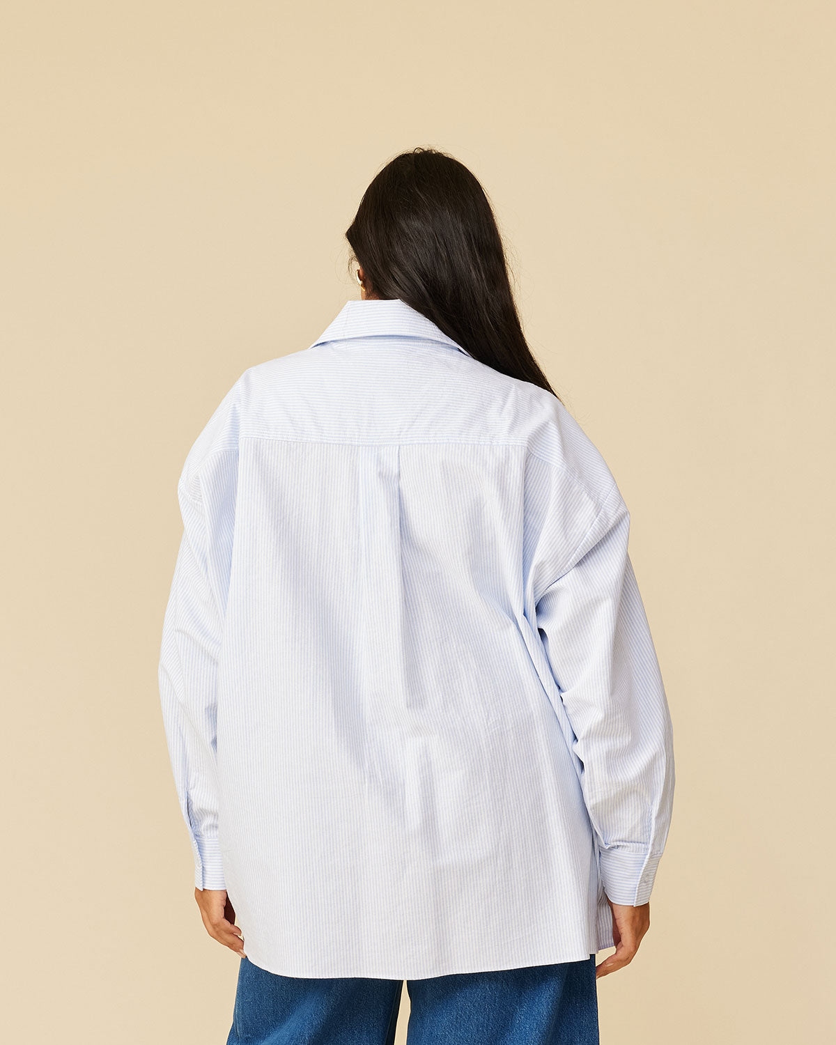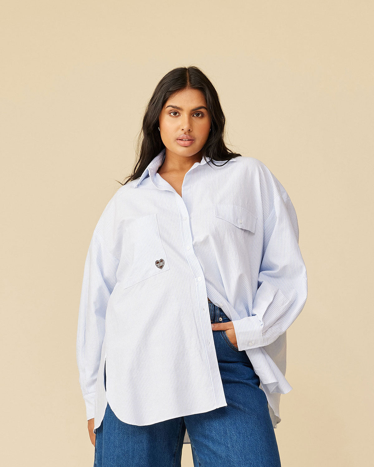 Classic slouchy shirt in a crisp blue striped cotton, an update on our Ida Shirt. Featuring a RUBY heart patch on the pocket, this shirt is a timeless wardrobe staple.