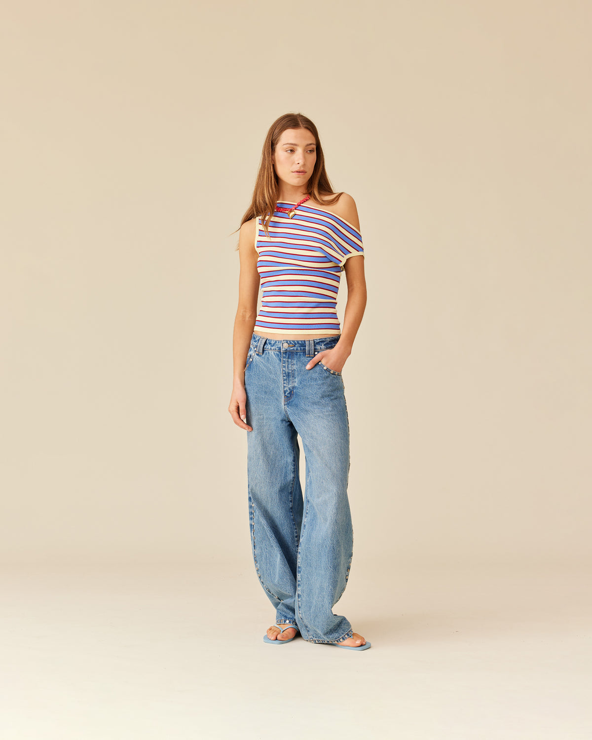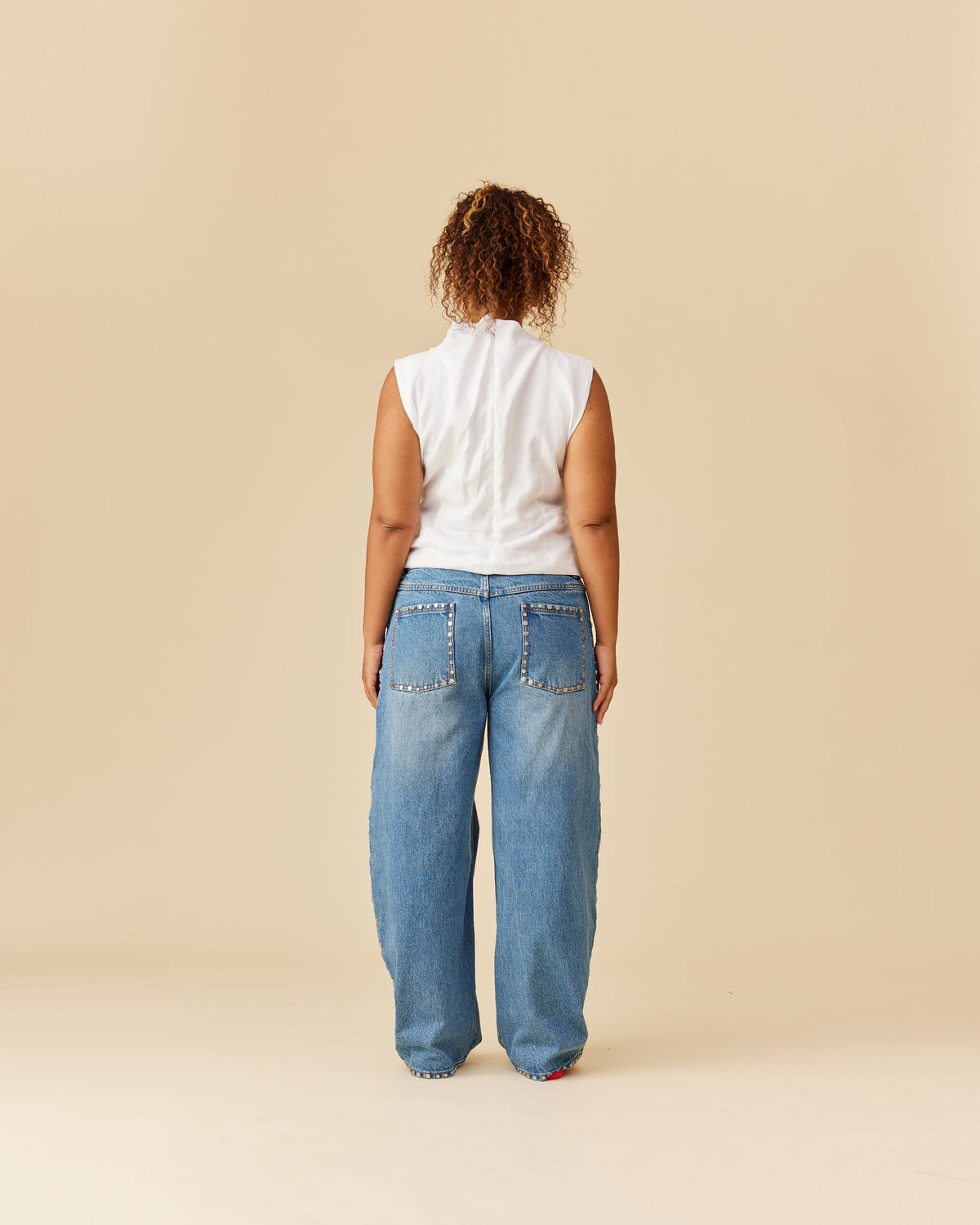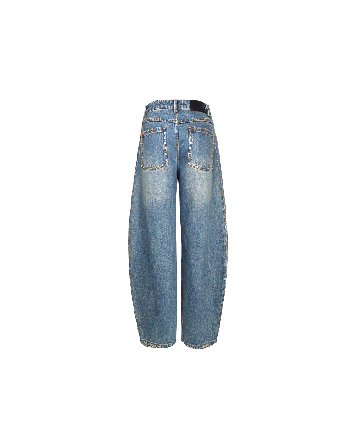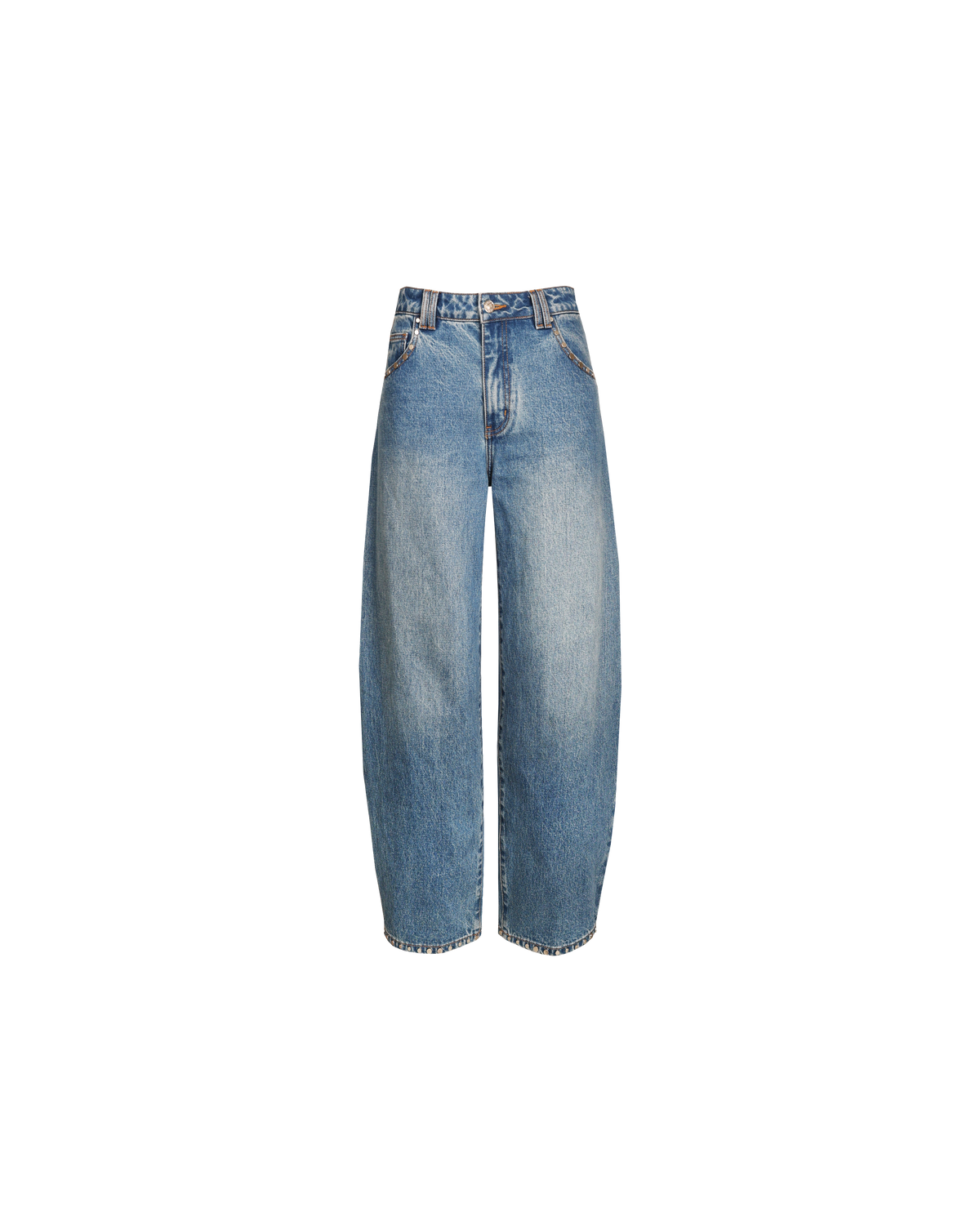 Barrel-leg jean designed in our signature midtown blue wash denim with studded seams. Sits mid-waisted with classic 5 pocket and waistband detailing. An updated version of our Icon Jean.