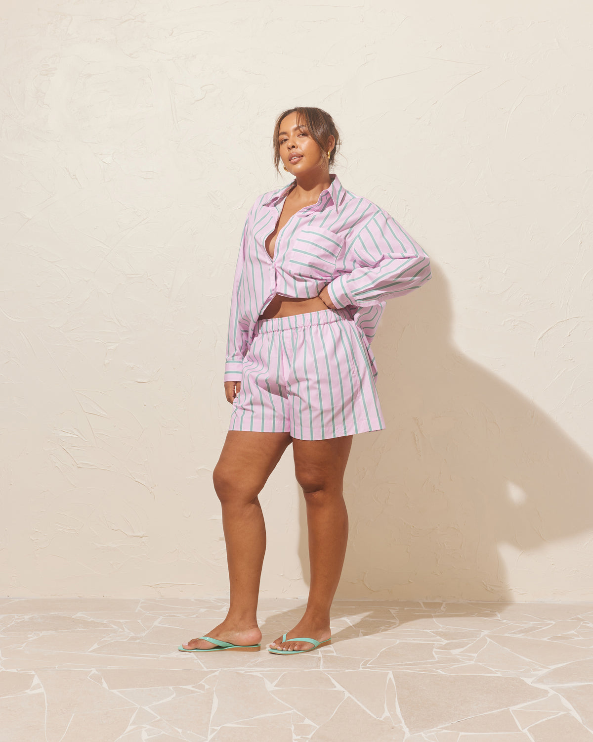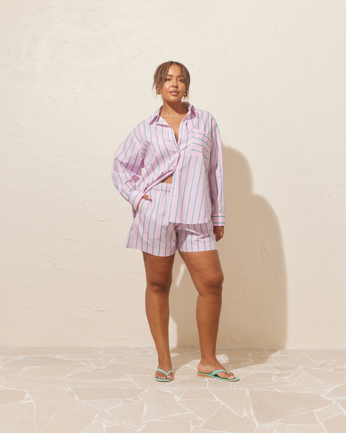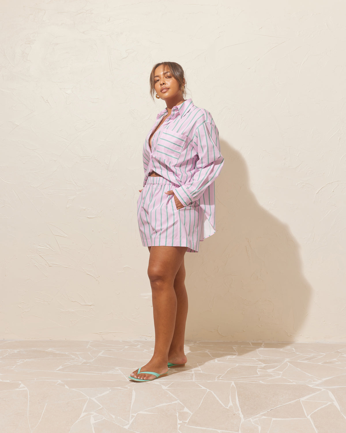 Relaxed crisp shirt with classic shirt detailing and a large contrast stripe pocket, designed in fun pink and apple striped cotton. This piece is a timeless wardrobe staple that you will wear for years to come. Make it a set by pairing this shirt with our Ida Short.
