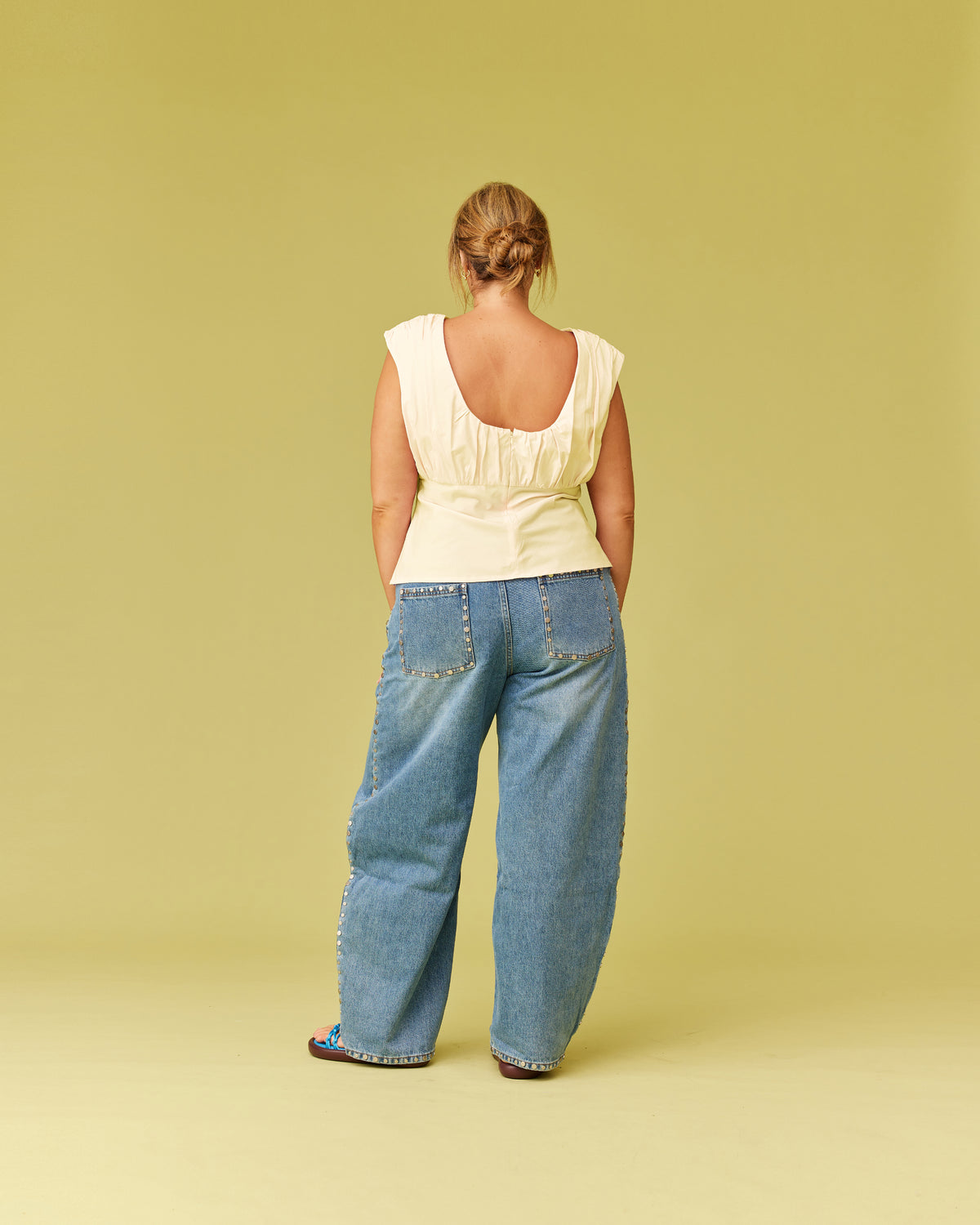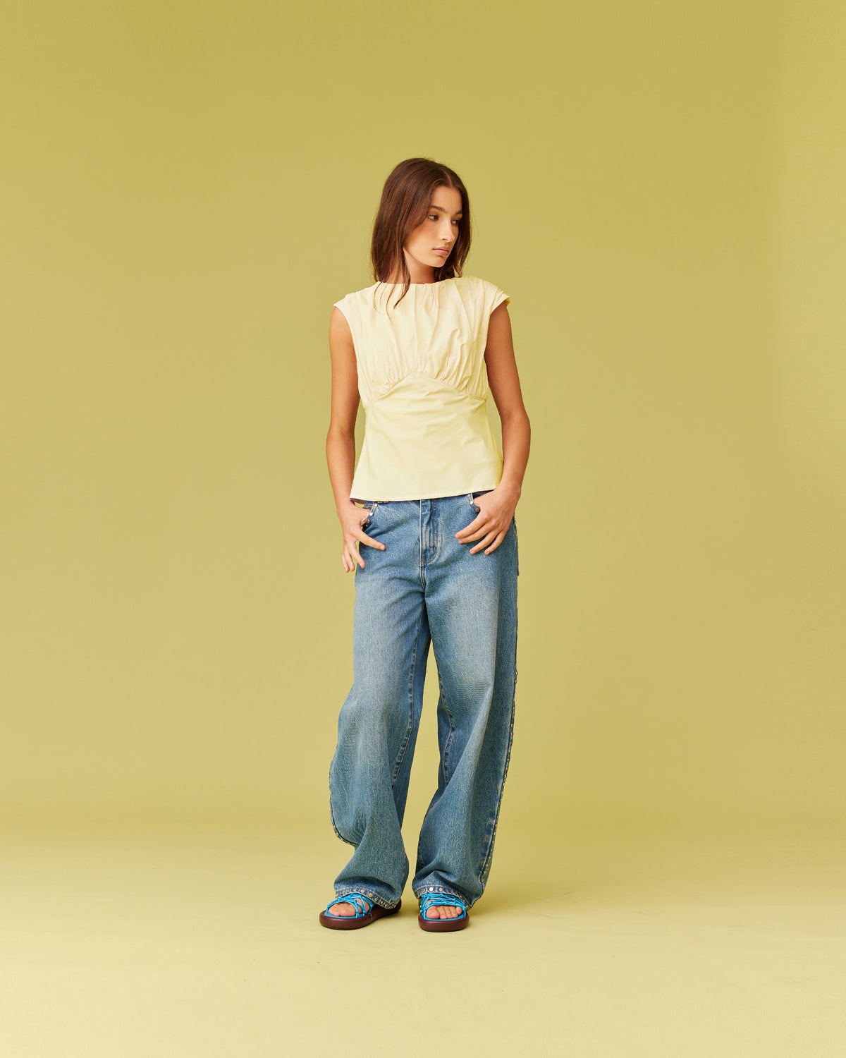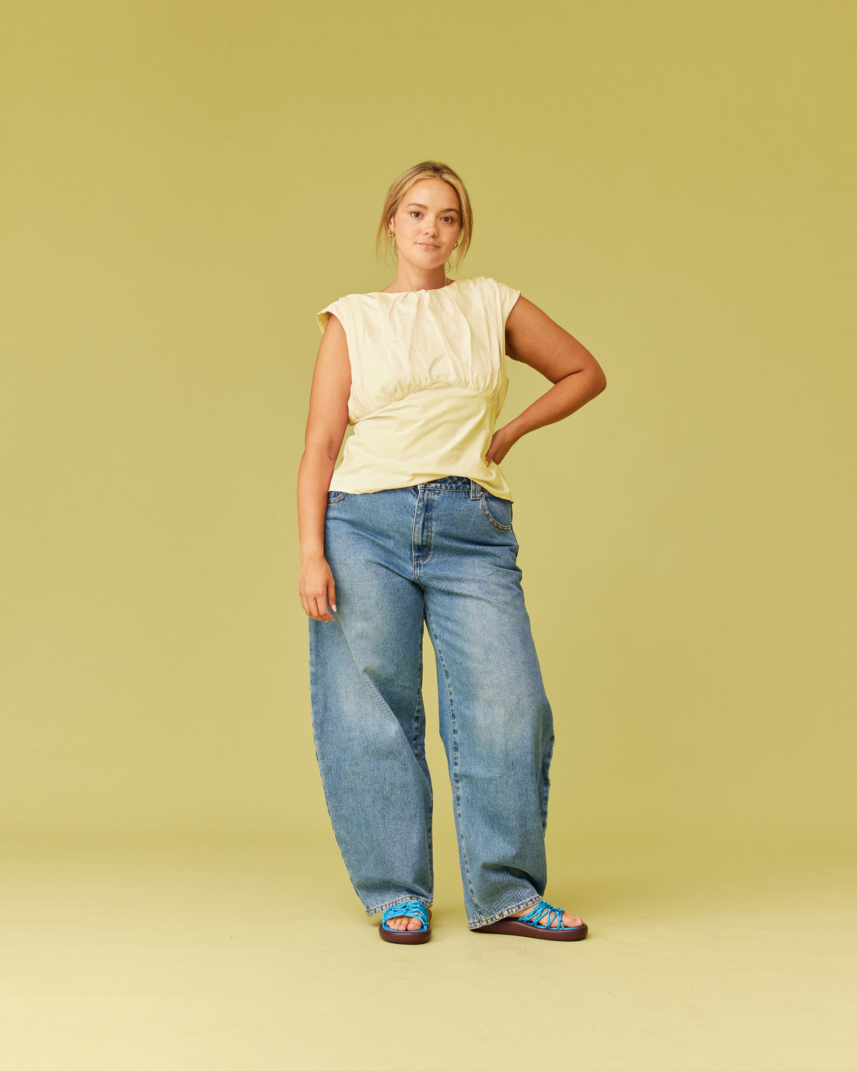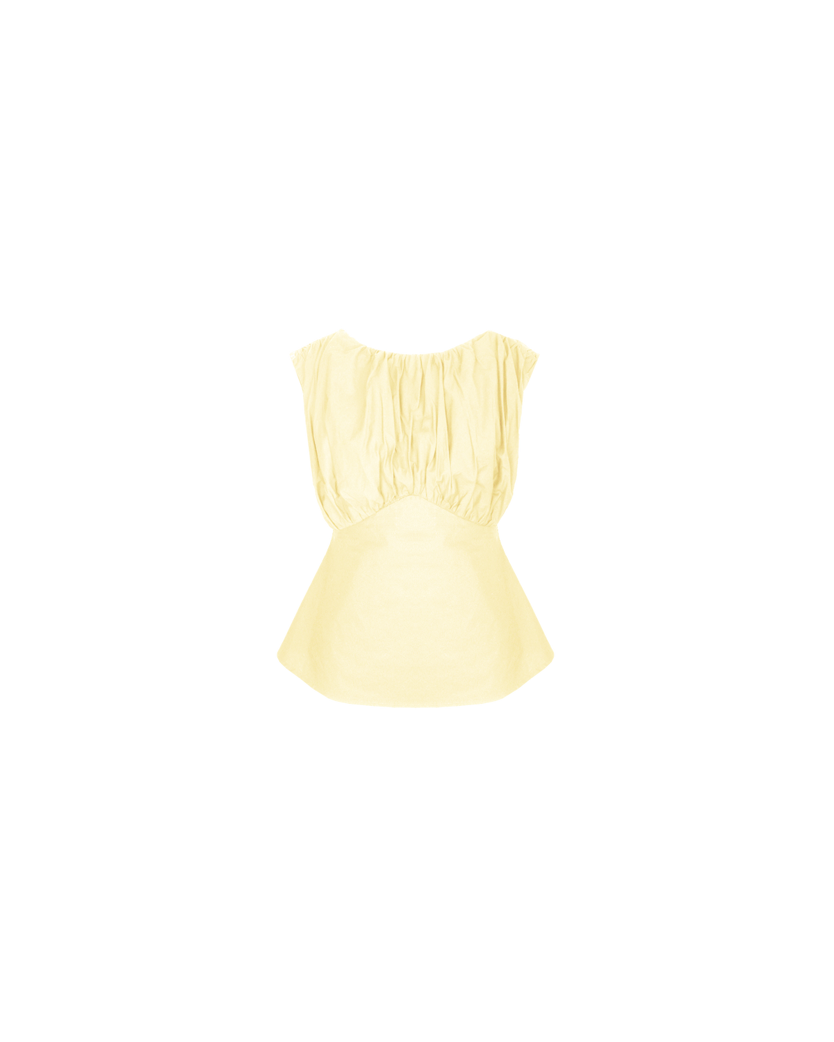 An update on our Raquel Top, crafted in a butter organic cotton. Features a high boat neckline and a scooped back, with ruched detailing at the bust. The tailored fit is designed to sit close to your body without feeling too tight.