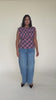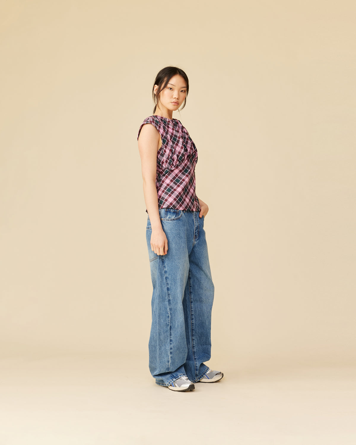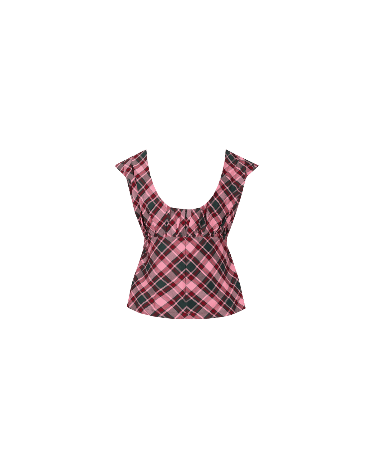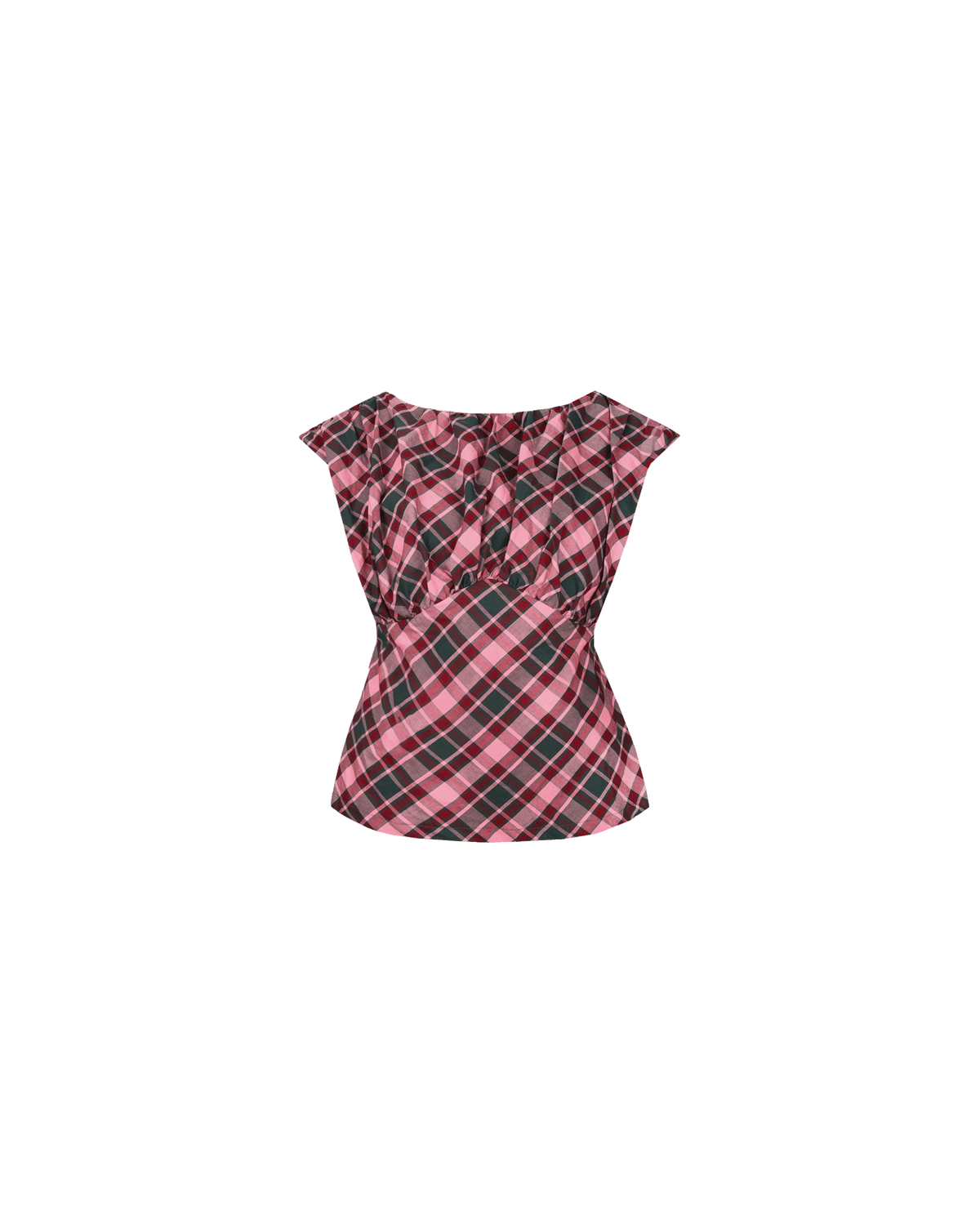 An update on our Raquel Top, crafted in a pink petrol tartan. Features a high boat neckline and a scooped back, with ruched detailing at the bust. The tailored fit is designed to sit close to your body without feeling too tight.