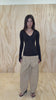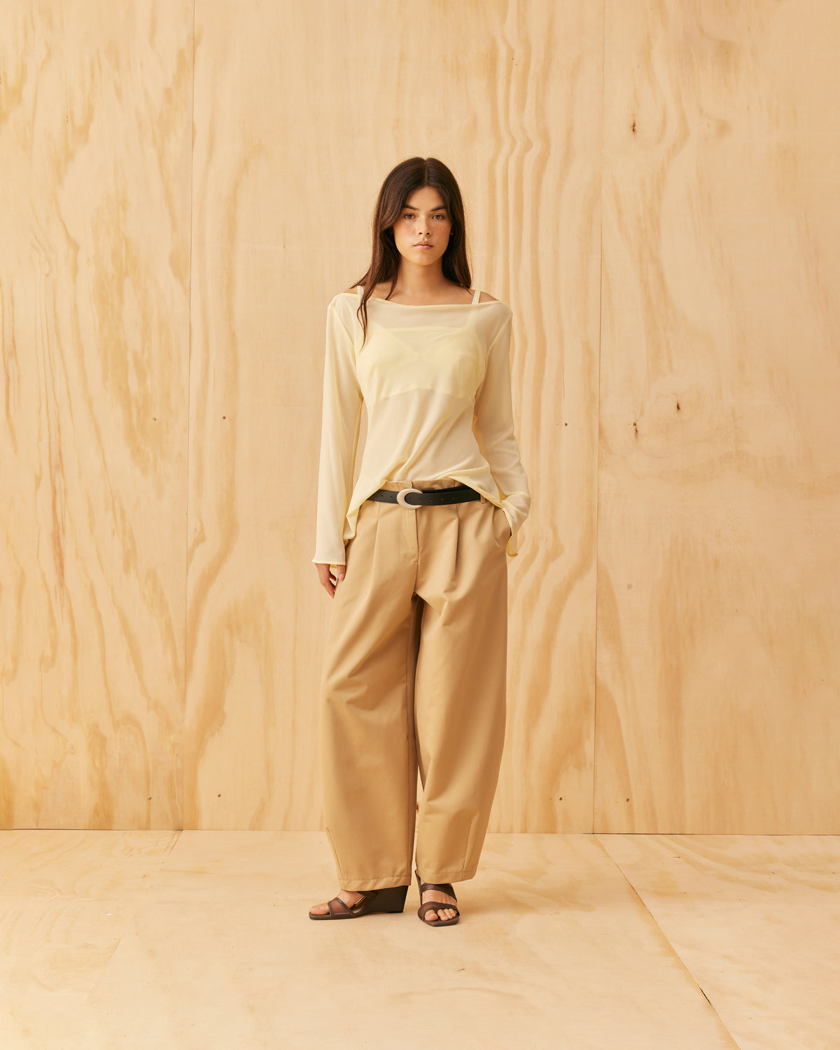 Barrel leg pant designed in a mid-weight caramel organic cotton. These pants sit low-rise, with a seamless waistband and flat front closure.
