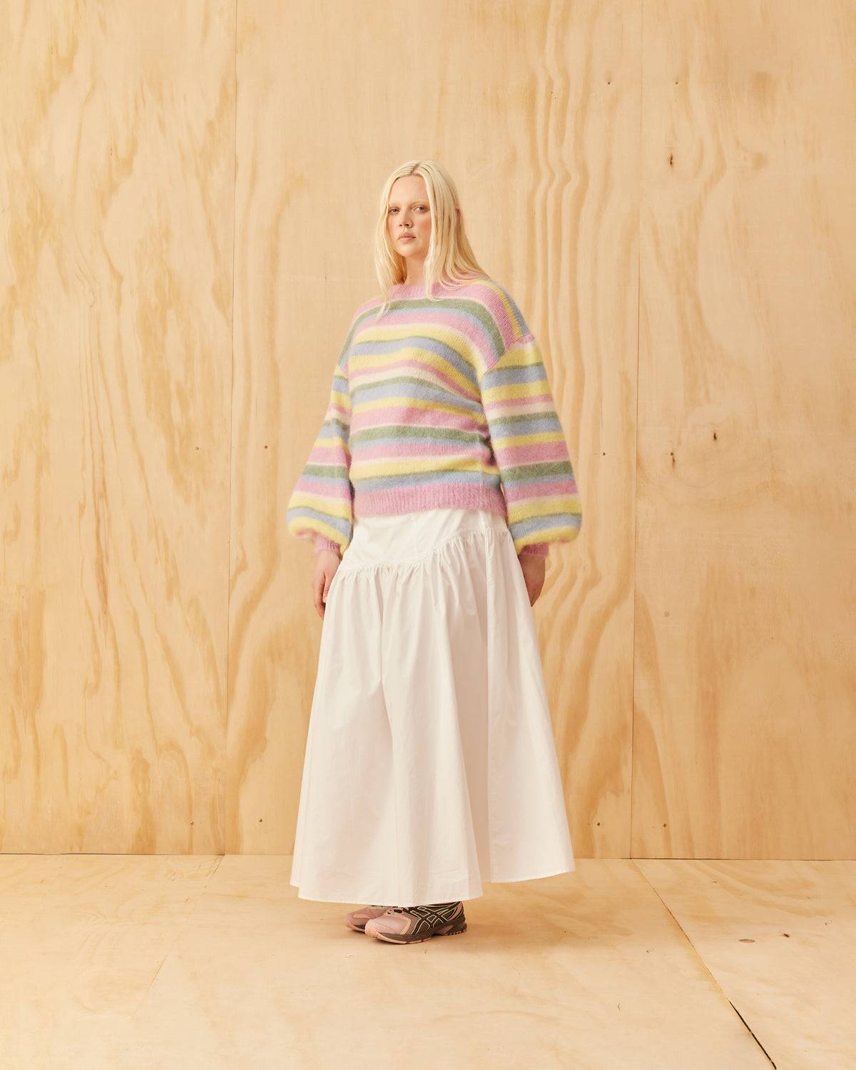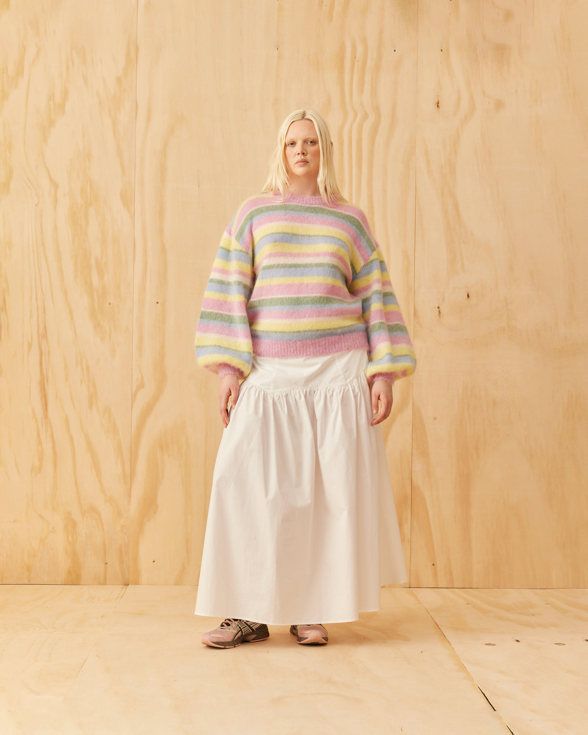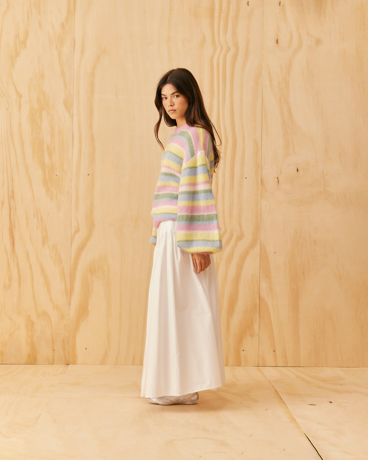 Balloon sleeve sweater designed in a cosy lollipop stripe mohair wool blend. This sweater has a brushed texture with a super soft hand-feel.