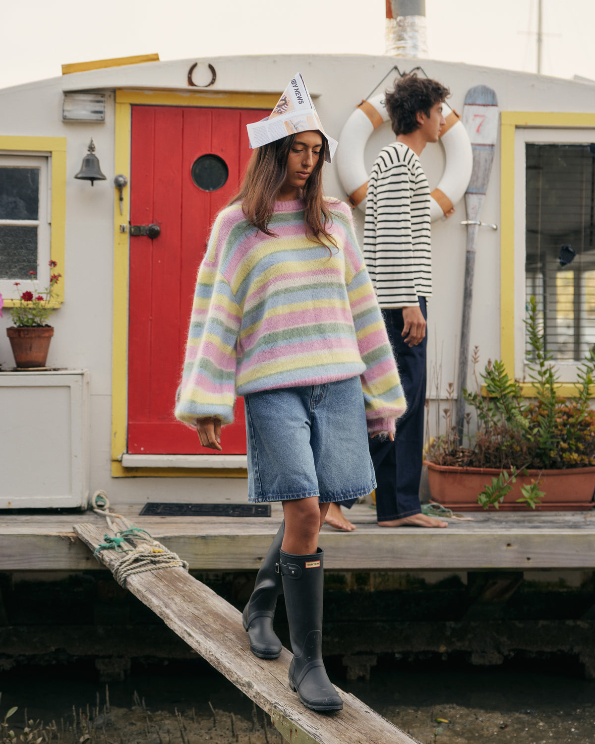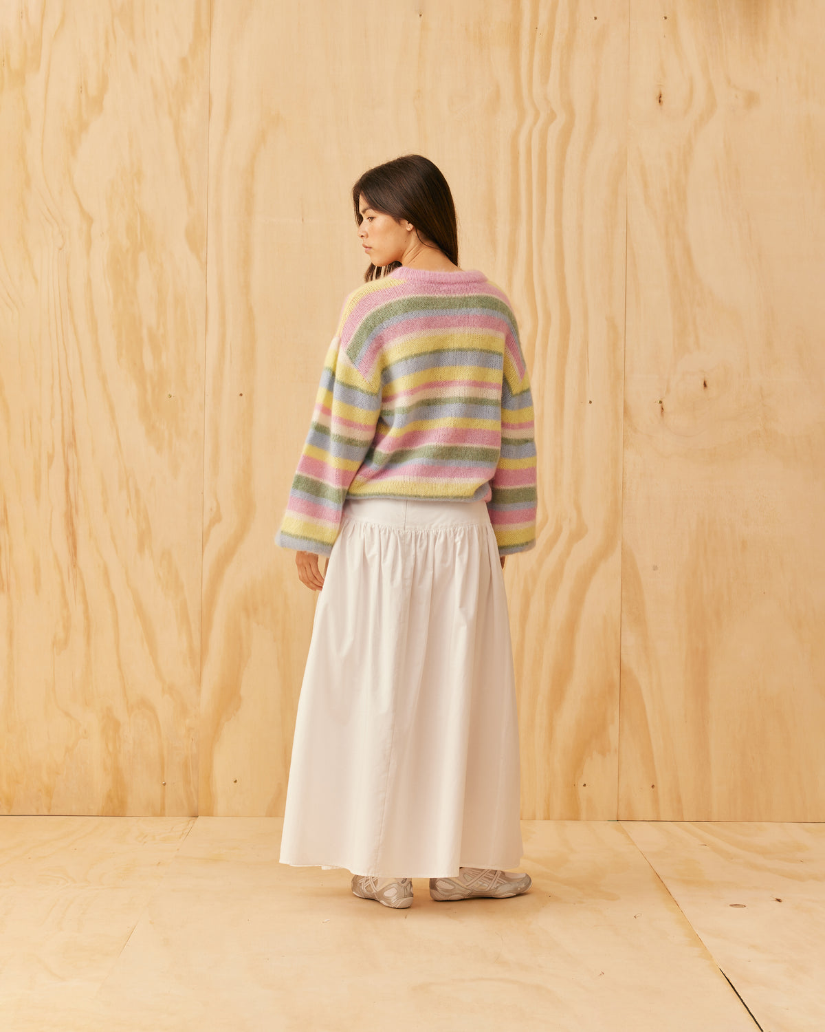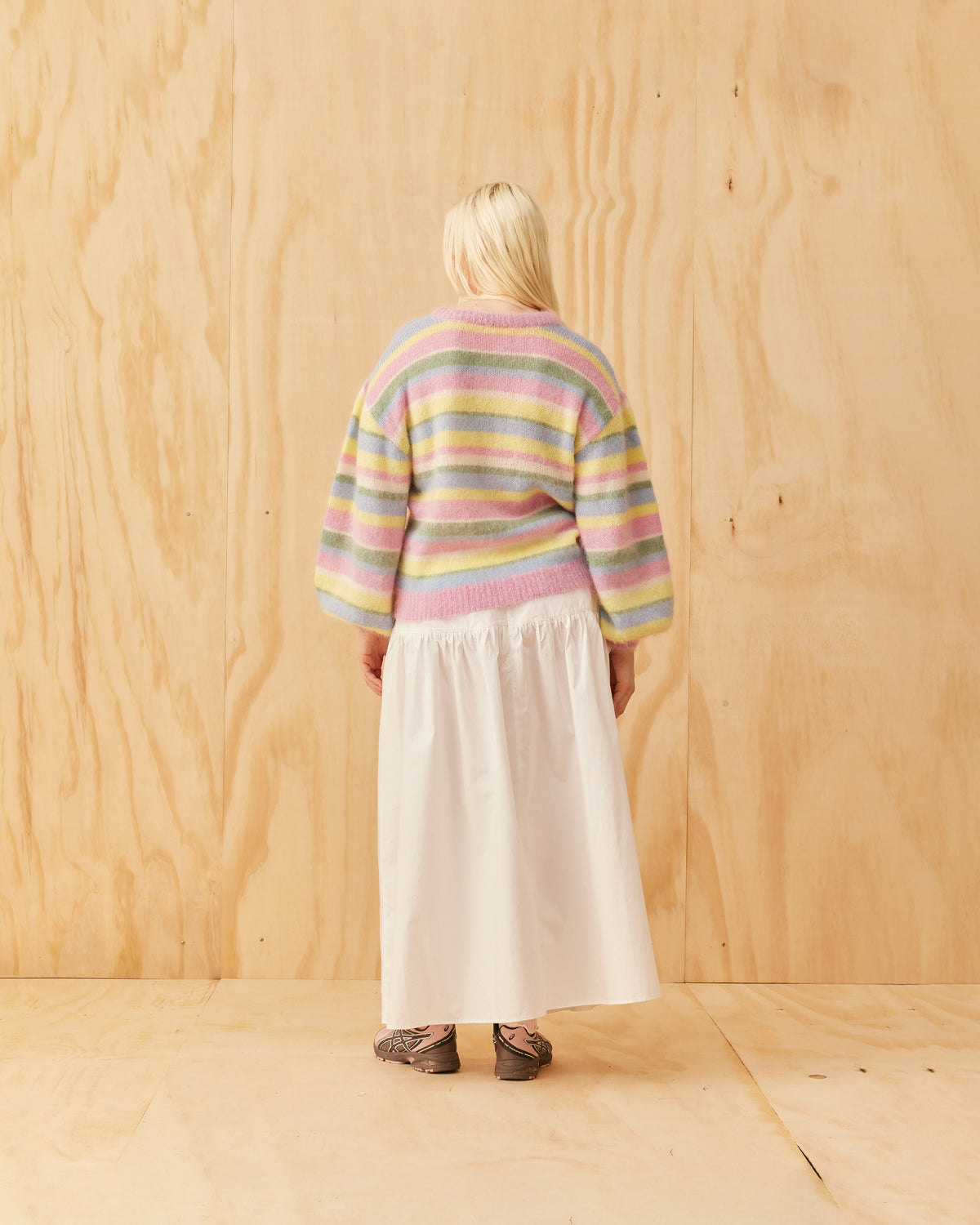 Balloon sleeve sweater designed in a cosy lollipop stripe mohair wool blend. This sweater has a brushed texture with a super soft hand-feel.