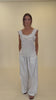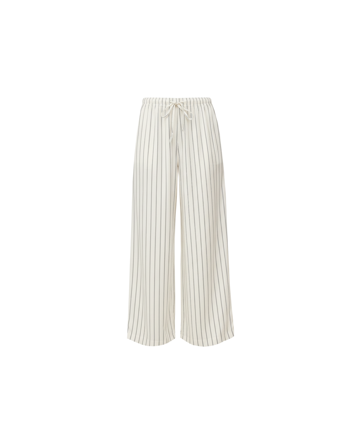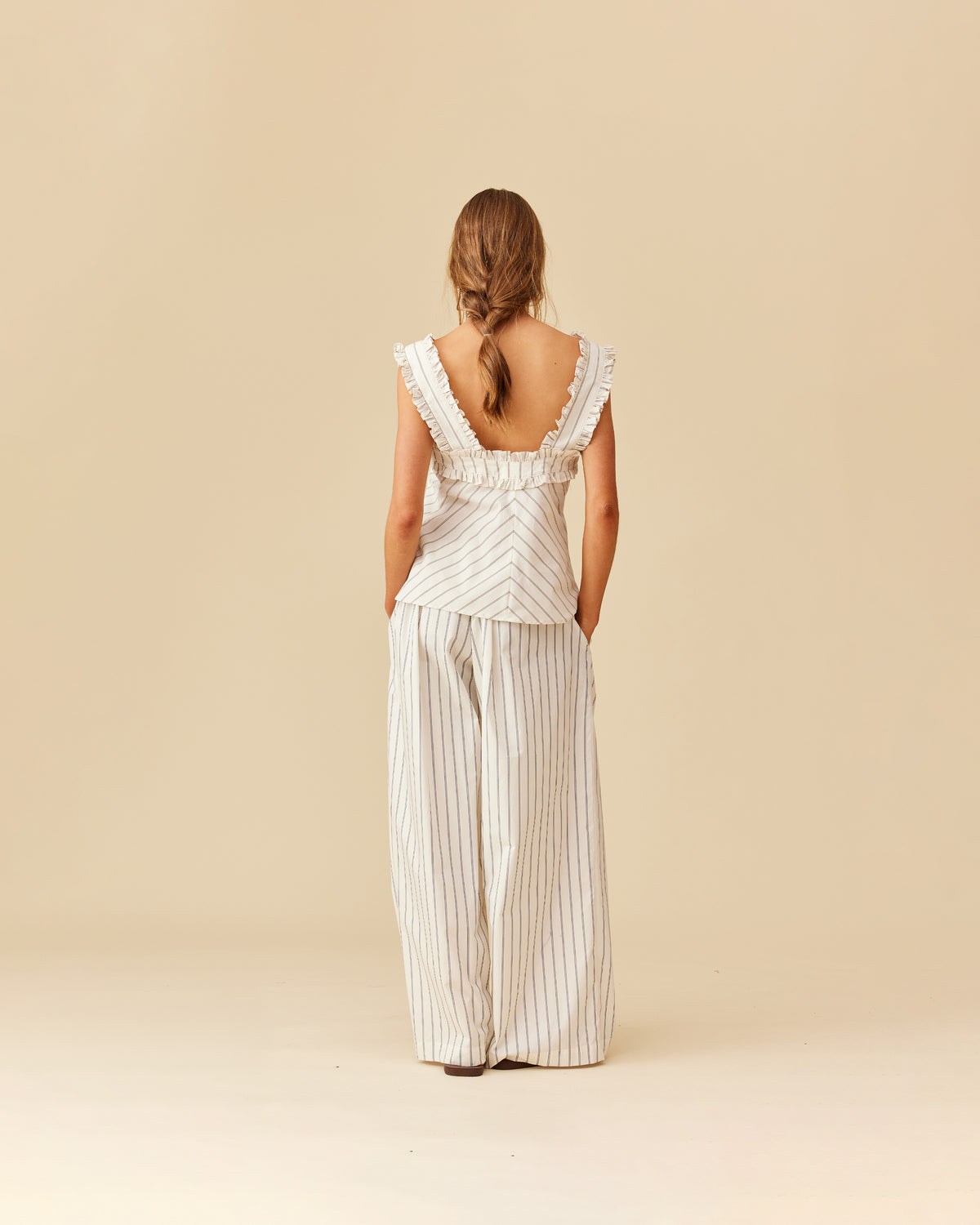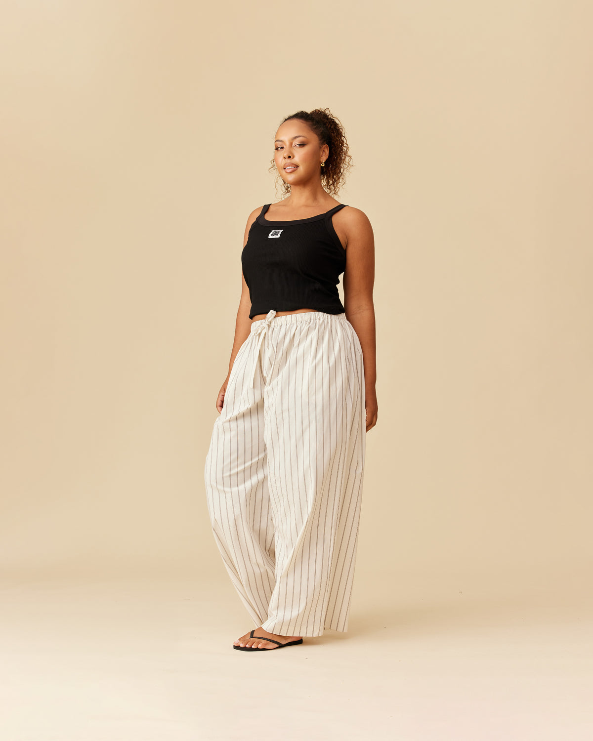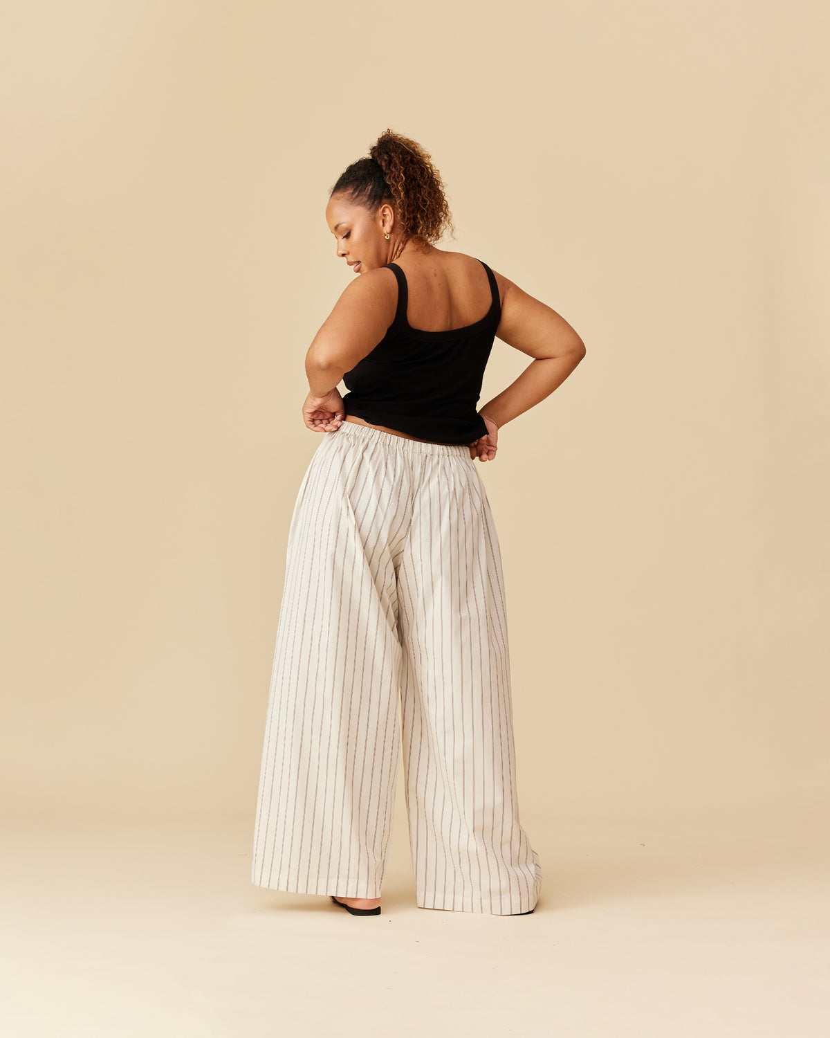 Wide-leg organic cotton pant designed in a cream and navy pinstripe. These pant sit mid to high waisted depending on your desired fit, and have a subtle barrel leg silhouette. Make it a set by pairing this top with our Passionfruit top.