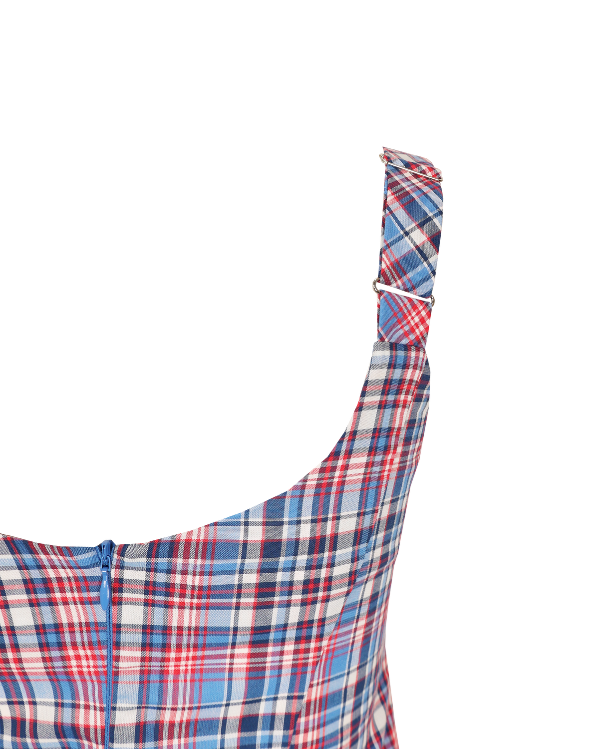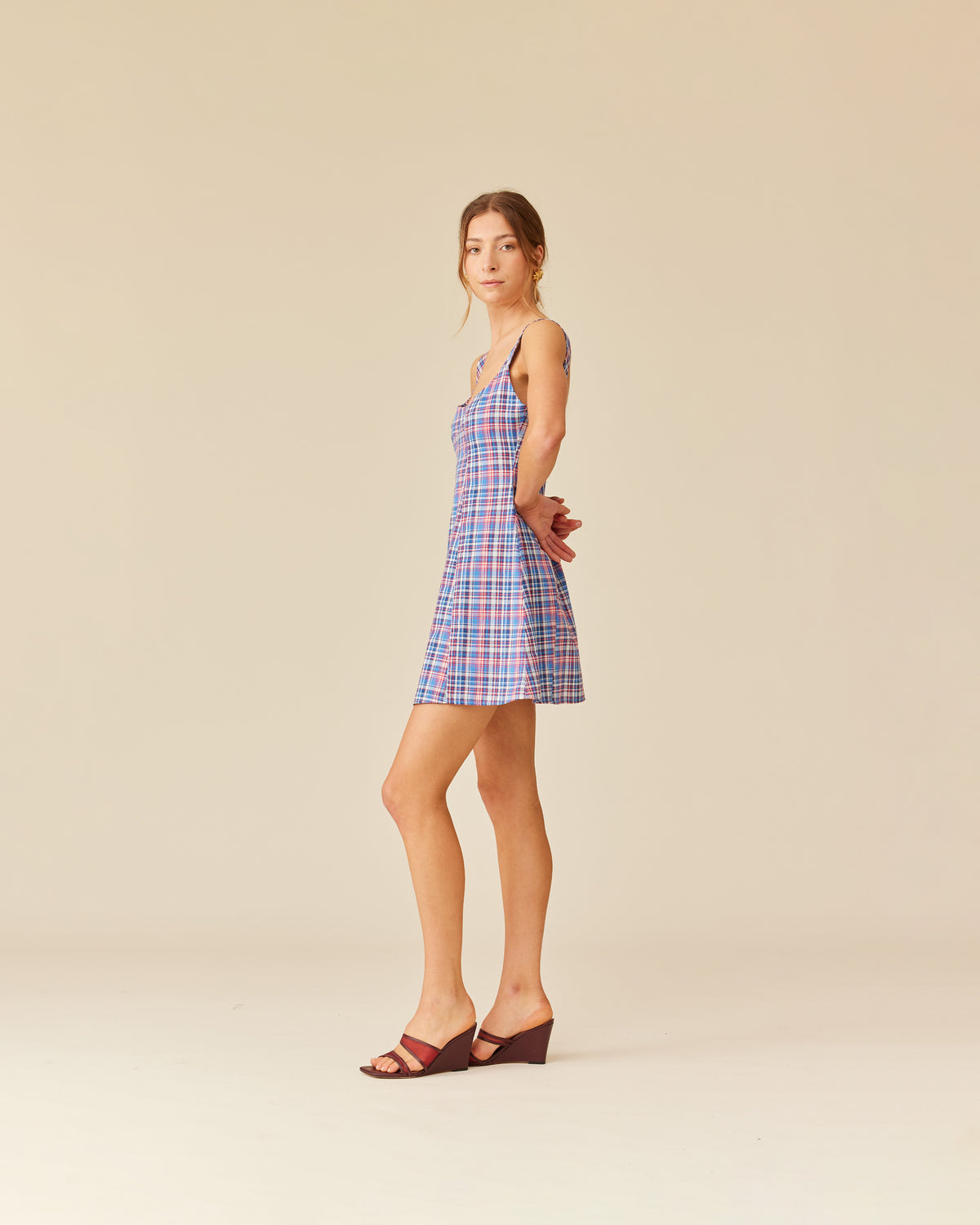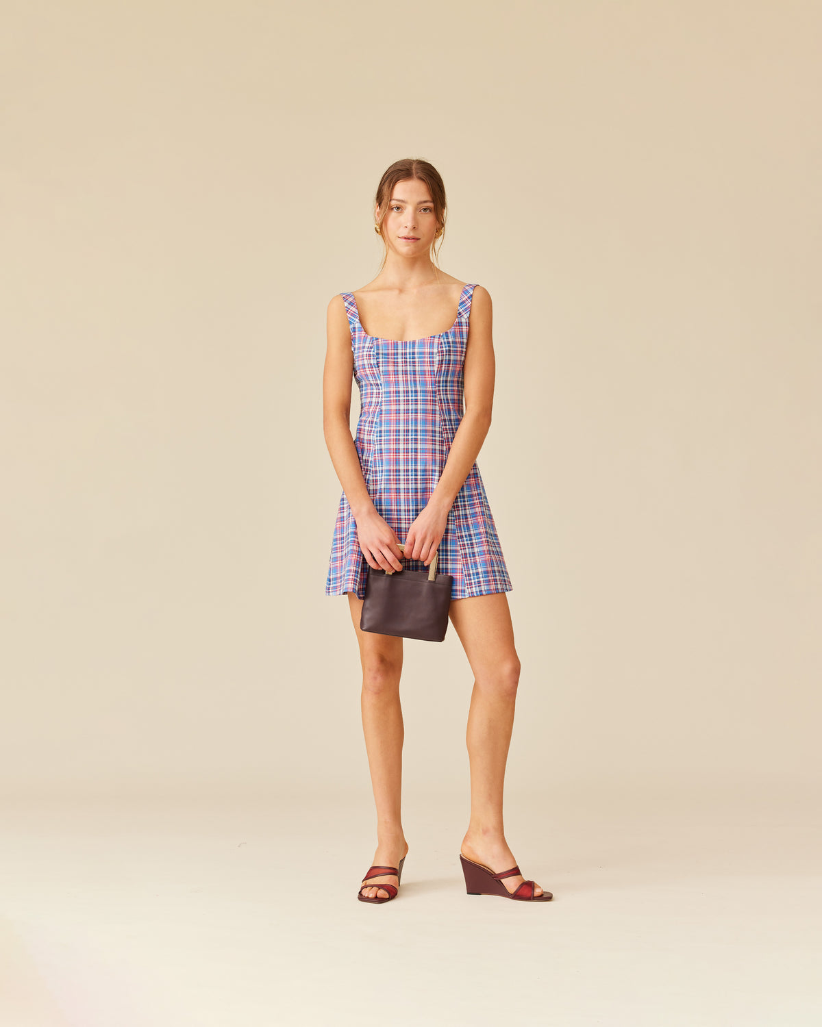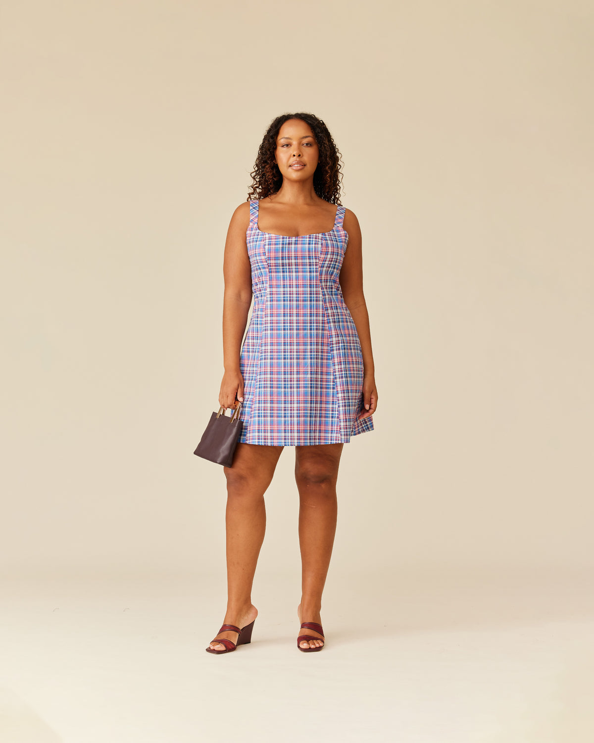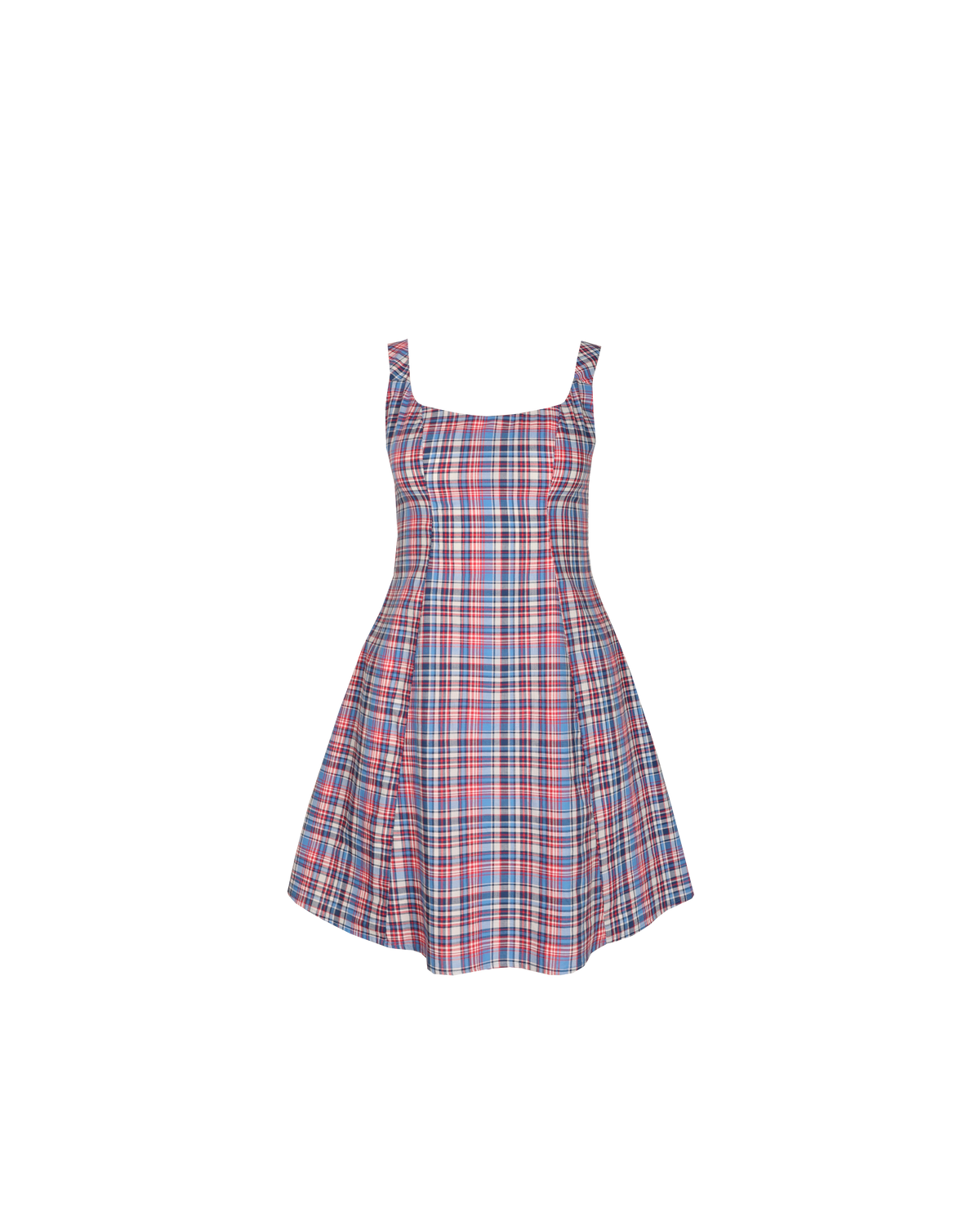 Cotton mini dress designed in our vibrant poolside tartan. Features a scoop-neckline and a soft A-line silhouette. An effortless summer dress or a perfect layering piece.
