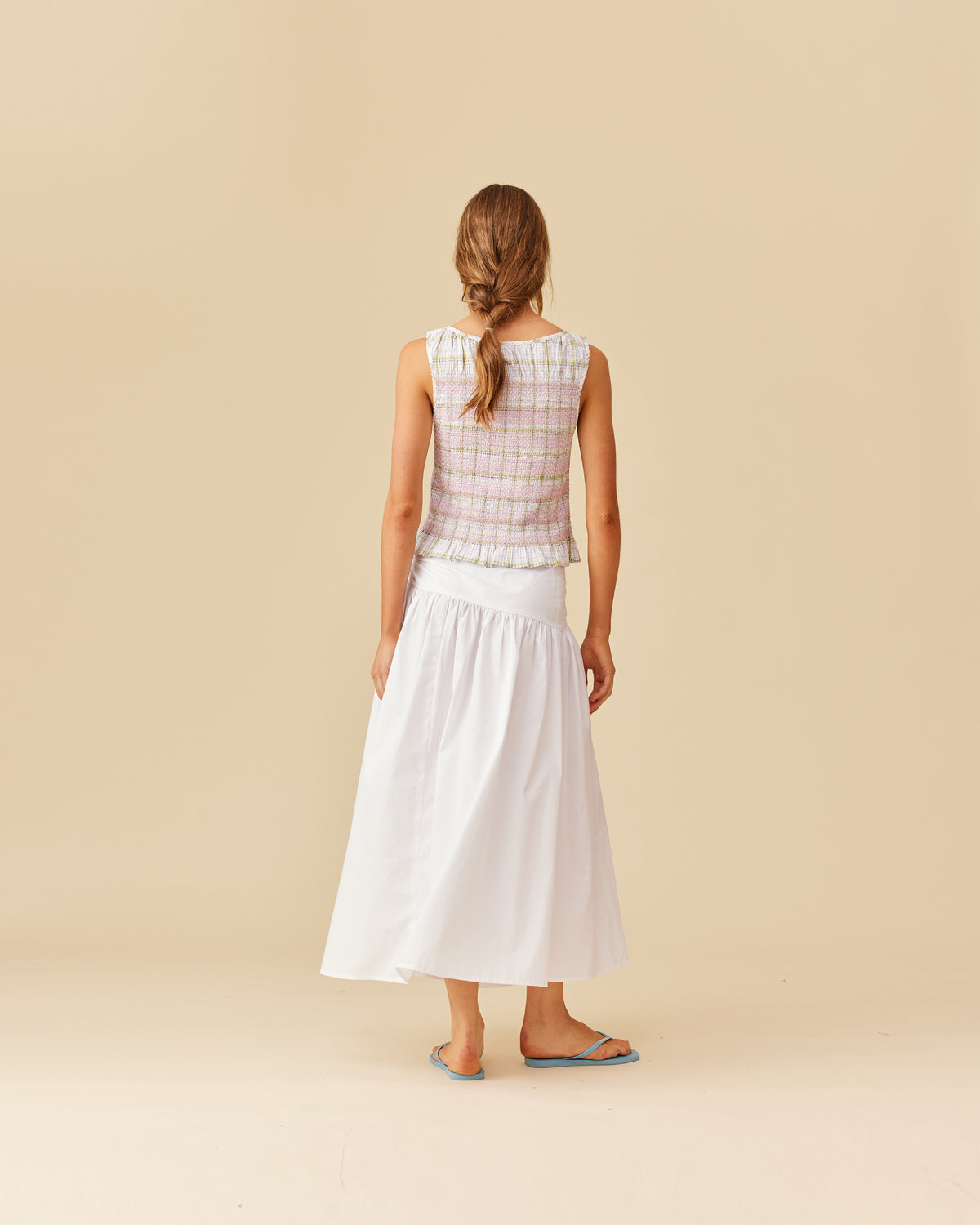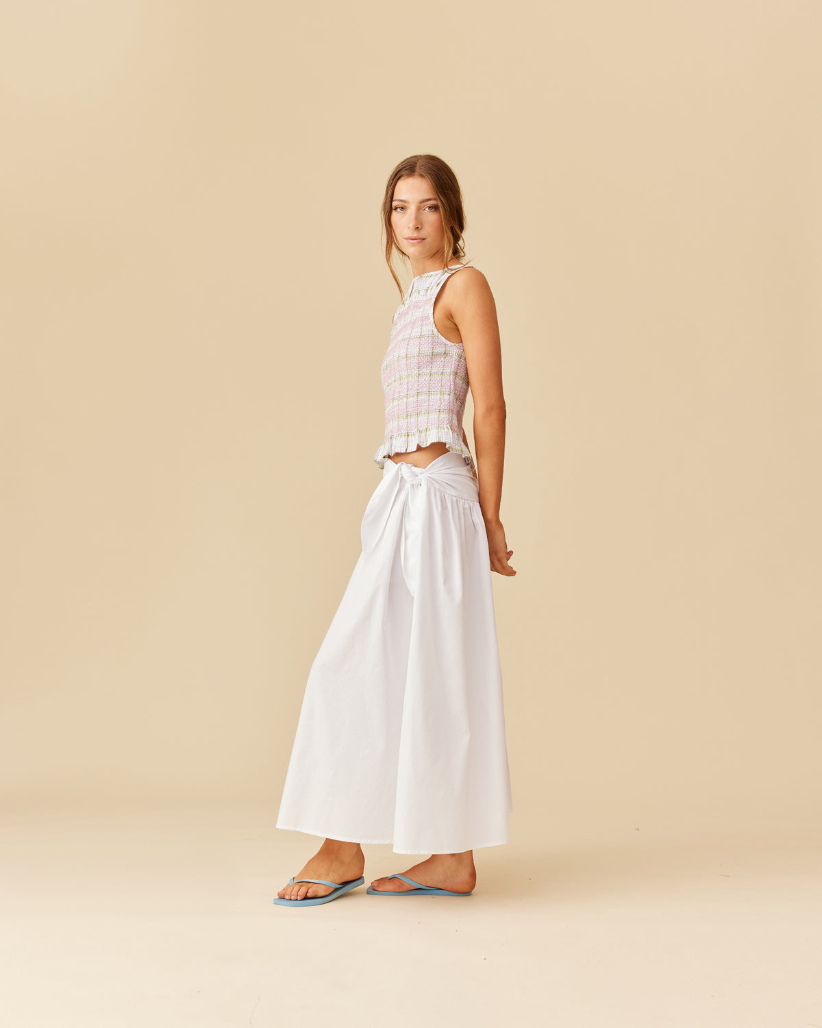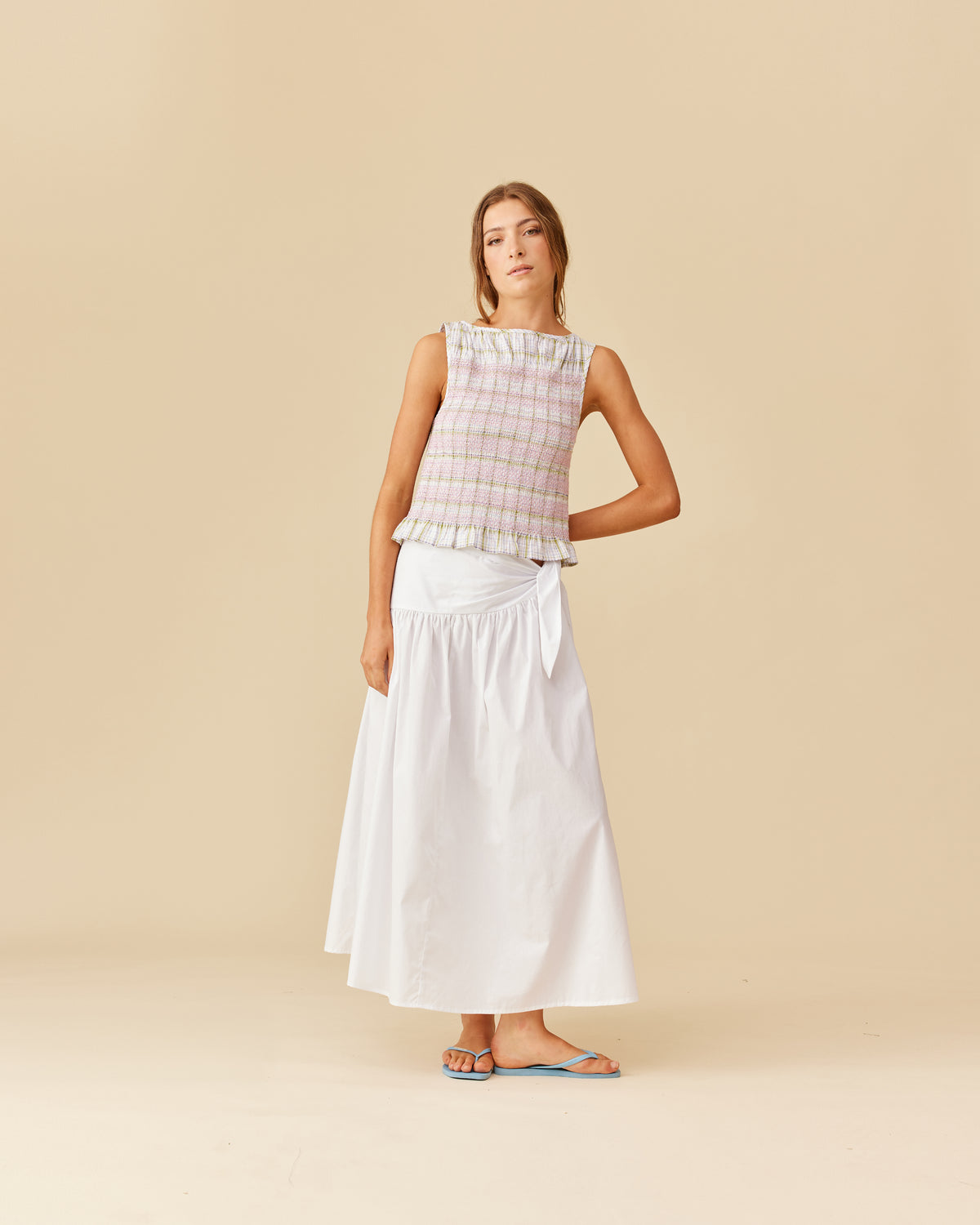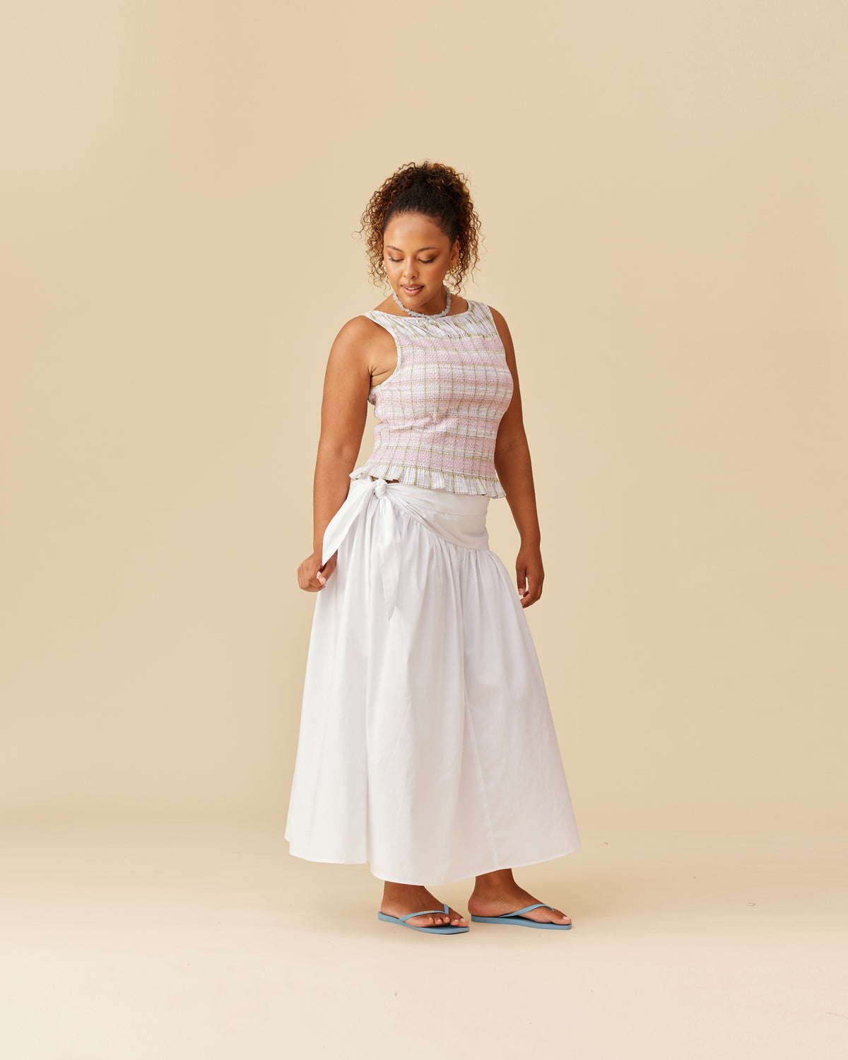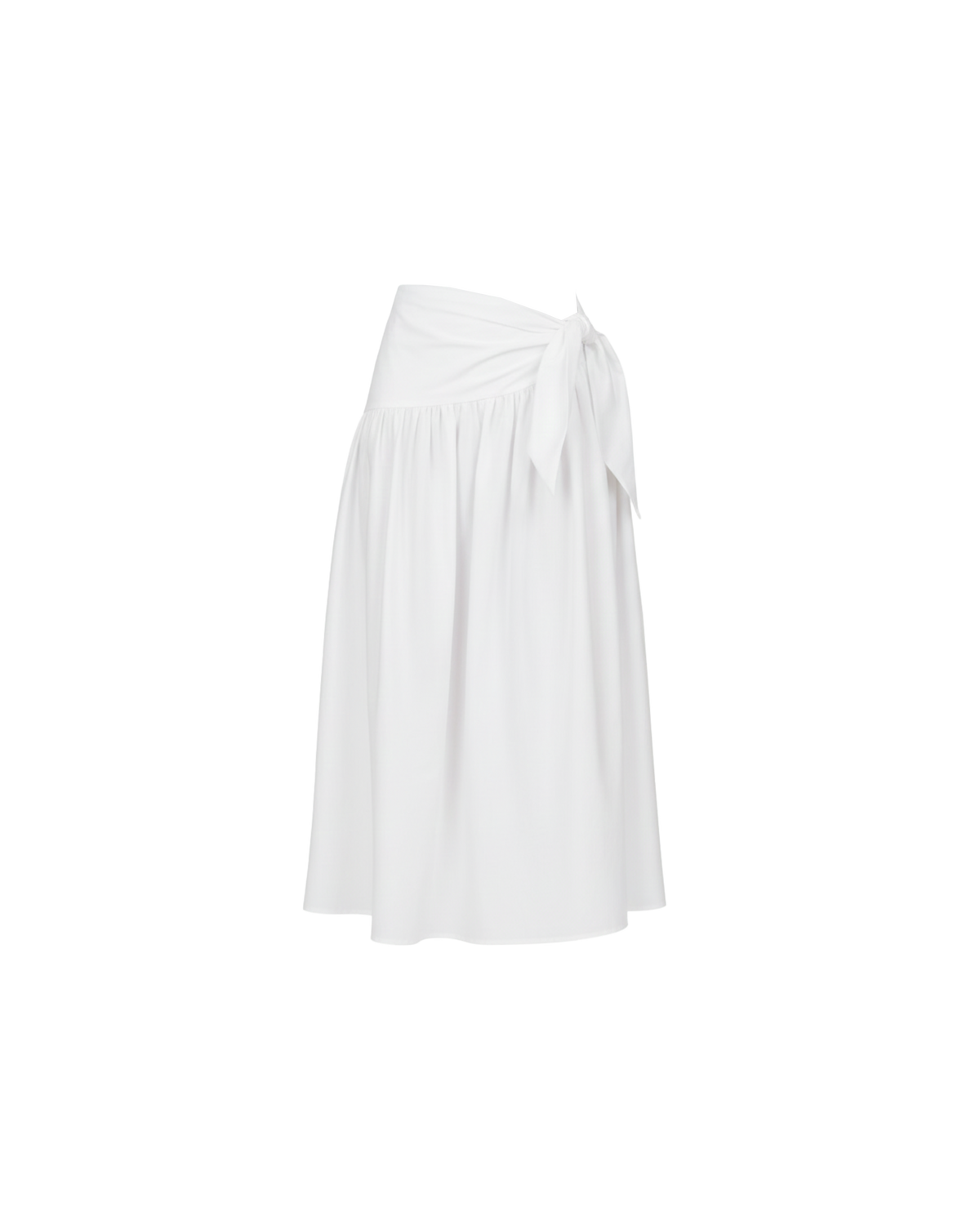 Organic cotton maxi skirt with a feature scarf tie at the side. An effortless piece for warm summer days.