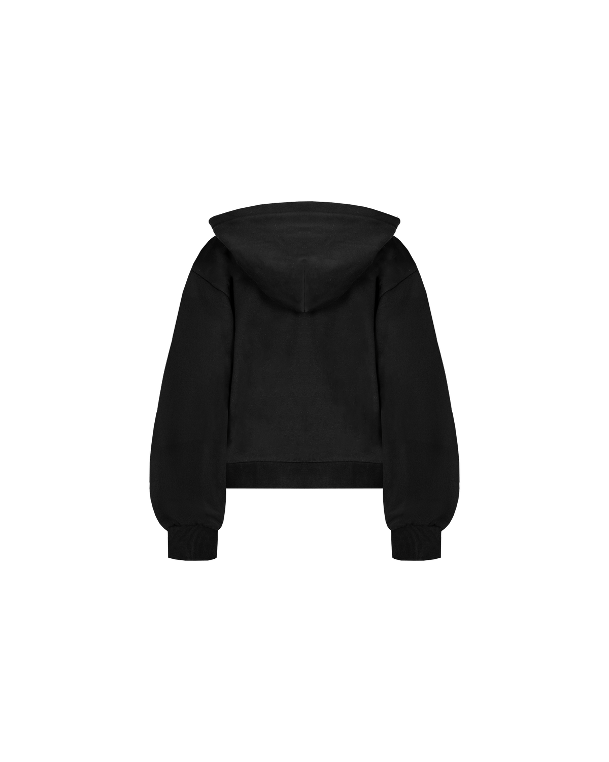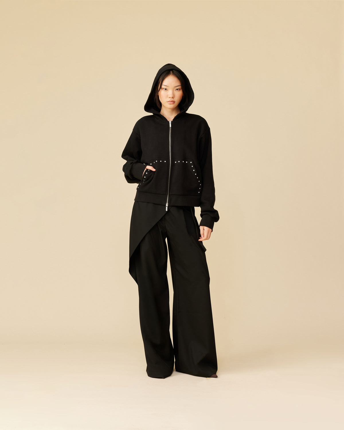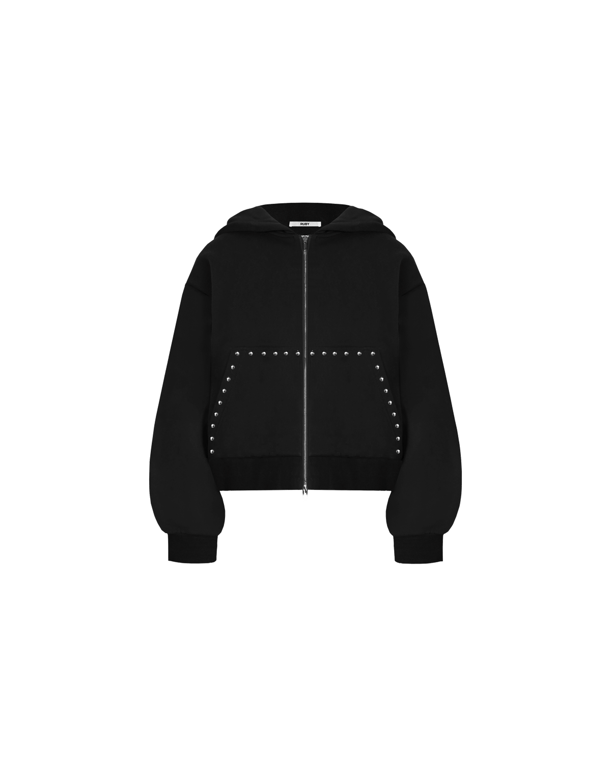 Boxy fit hoodie with a dual ended zip designed in a plush black cotton sweatshirt fabric. A cropped fit finished with studded pocket detailing elevate this staple piece. Make it a set by pairing it with our Lex Trackpant.