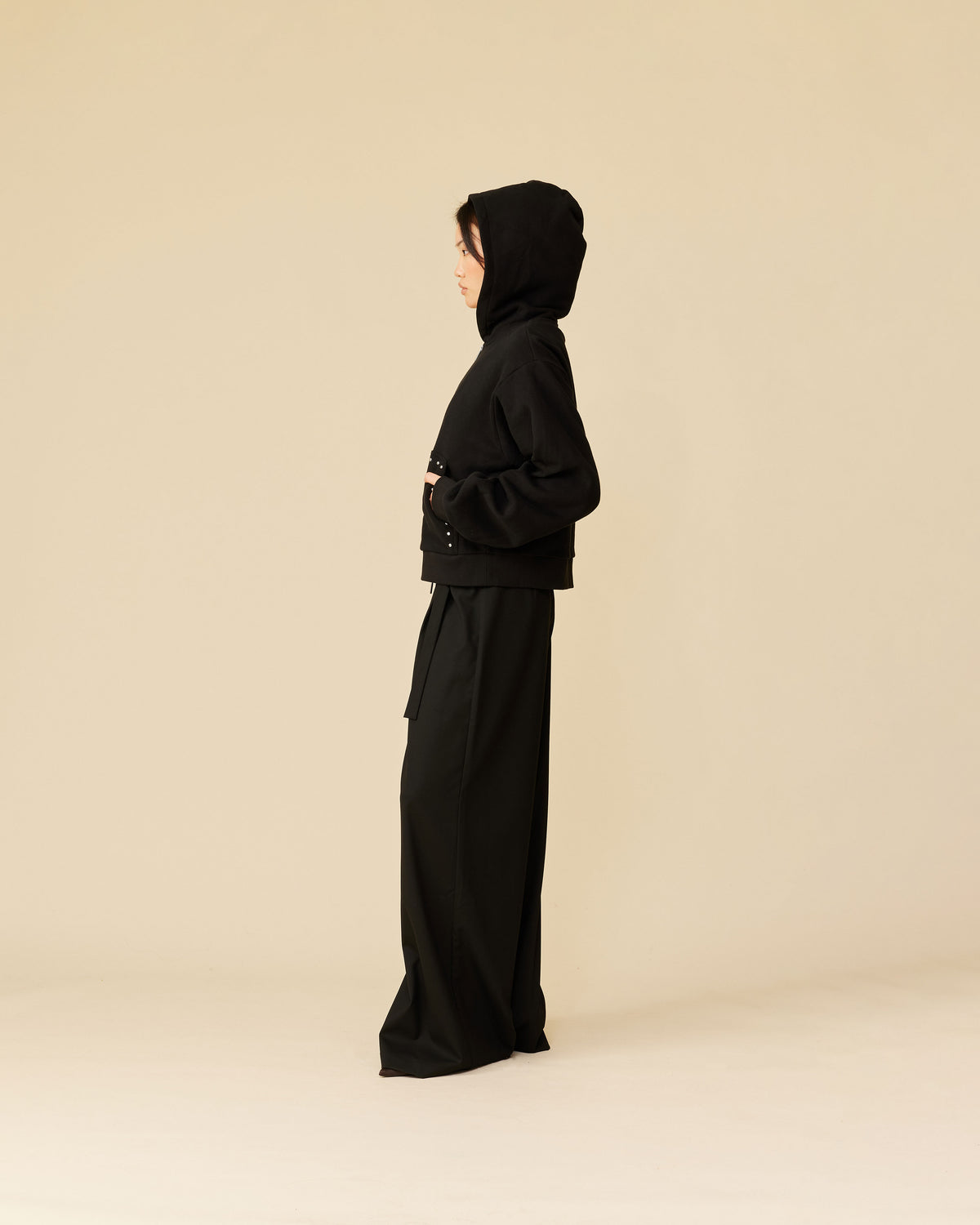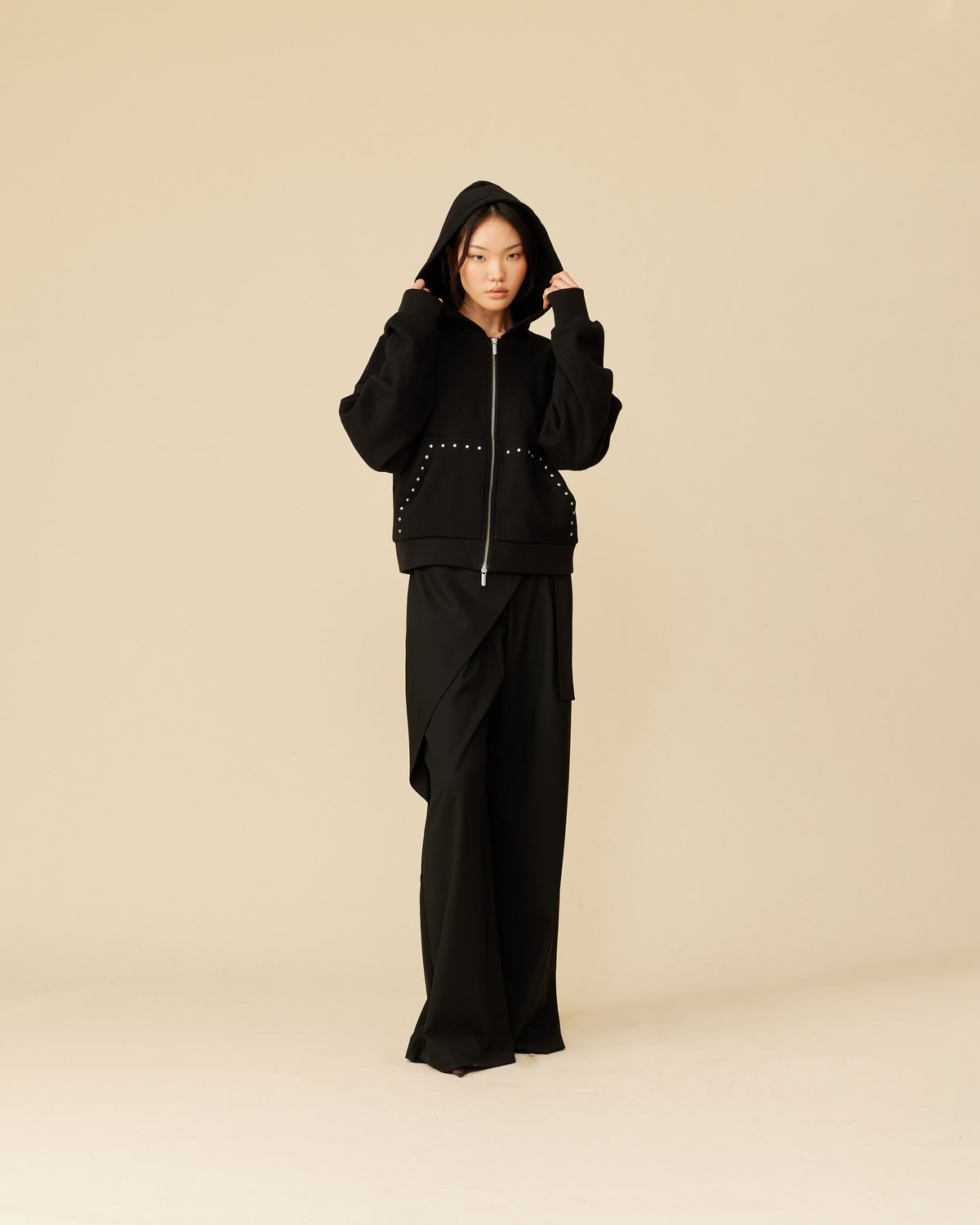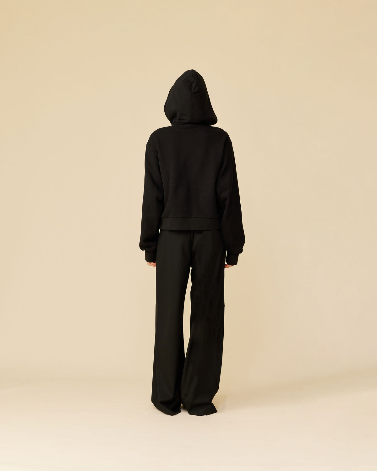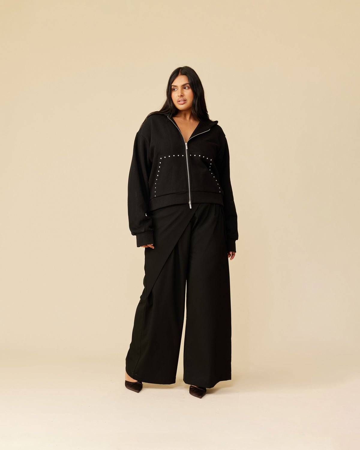 Boxy fit hoodie with a dual ended zip designed in a plush black cotton sweatshirt fabric. A cropped fit finished with studded pocket detailing elevate this staple piece. Make it a set by pairing it with our Lex Trackpant.