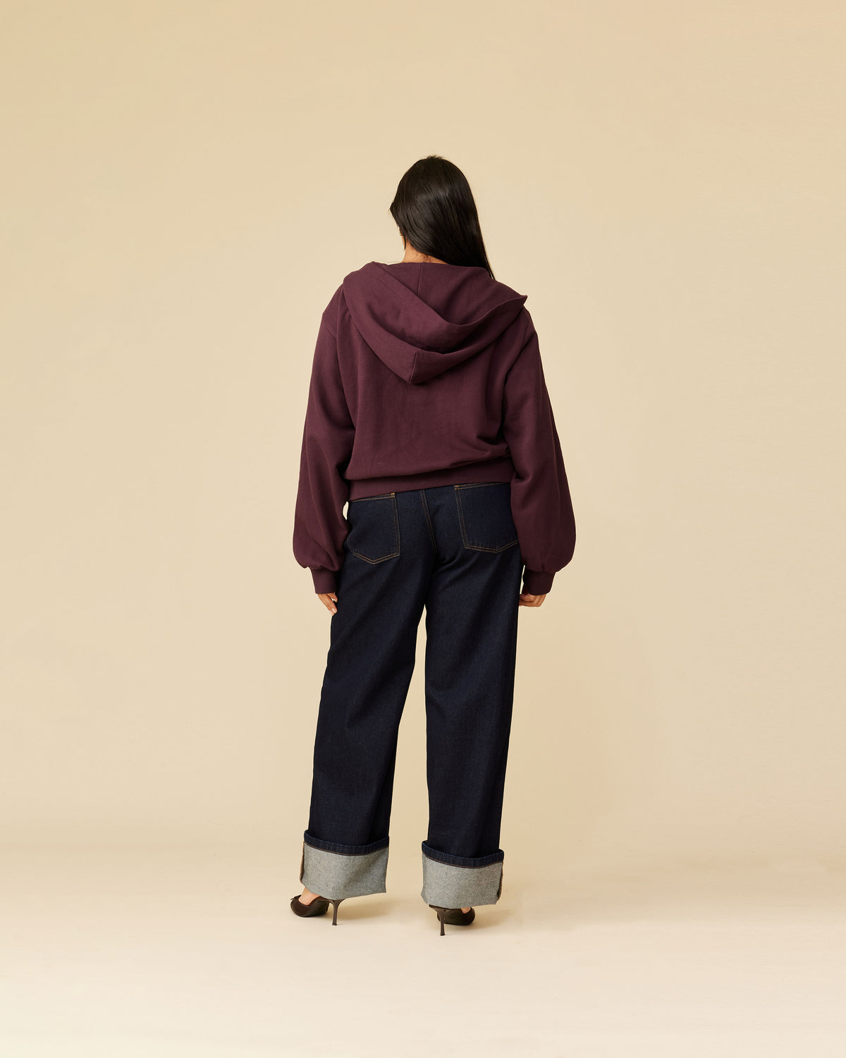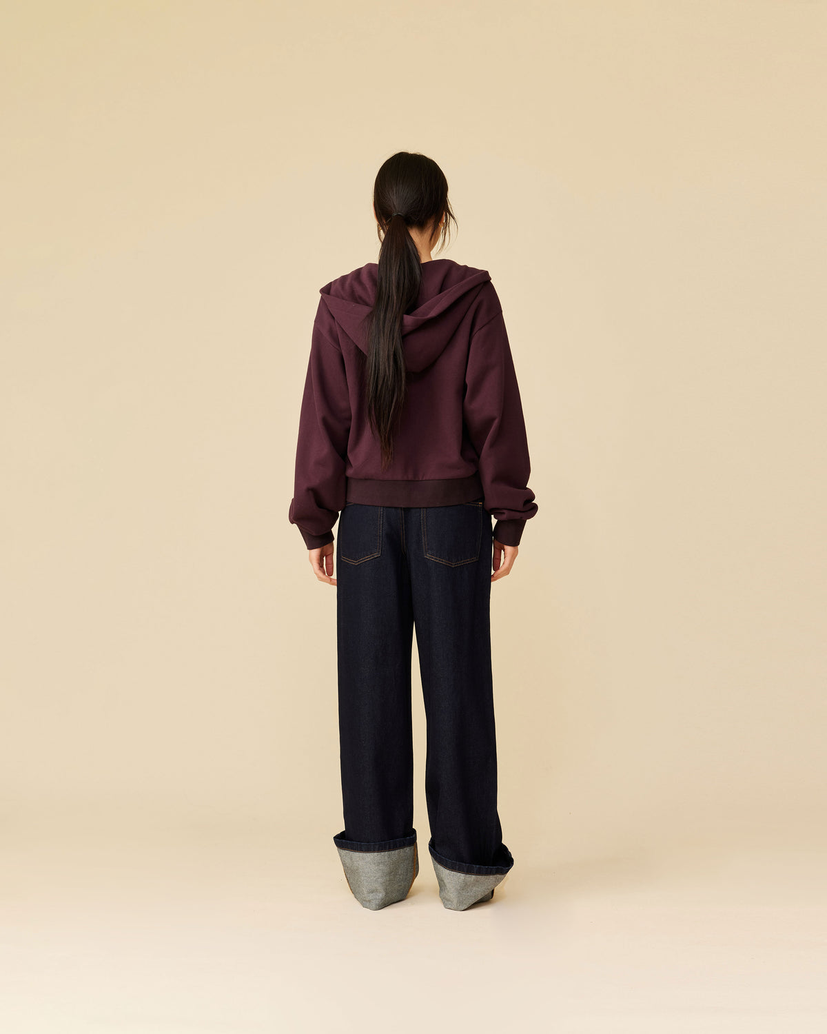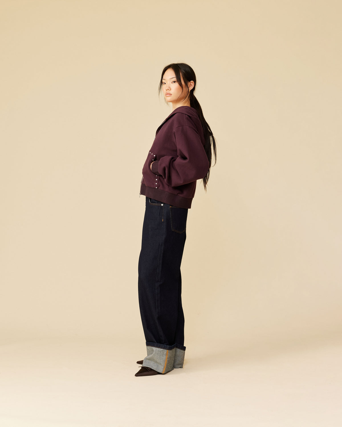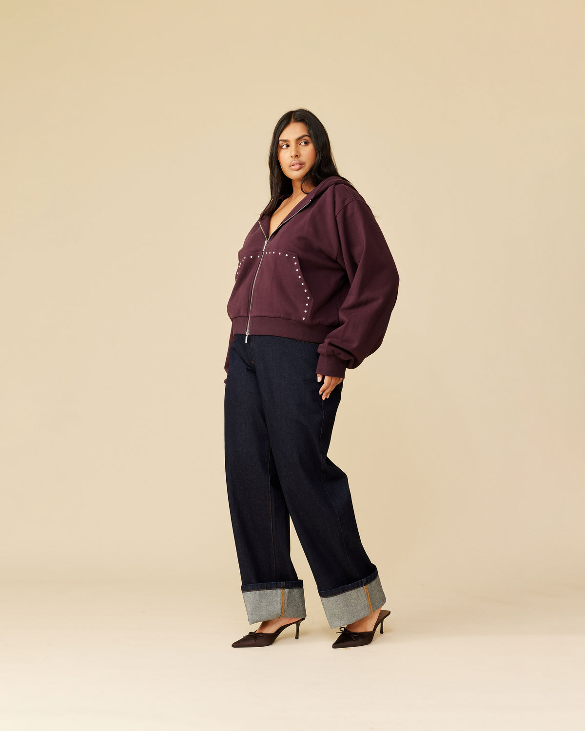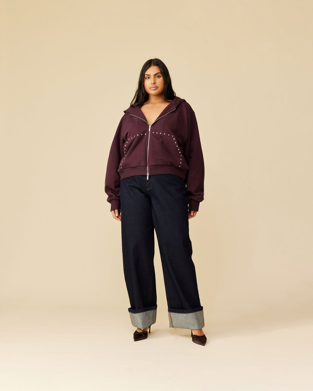 Boxy fit hoodie with a dual ended zip designed in a deep plum cotton sweatshirt fabric. A cropped fit finished with studded pocket detailing elevate this staple piece. Make it a set by pairing it with our Lex Trackpant.