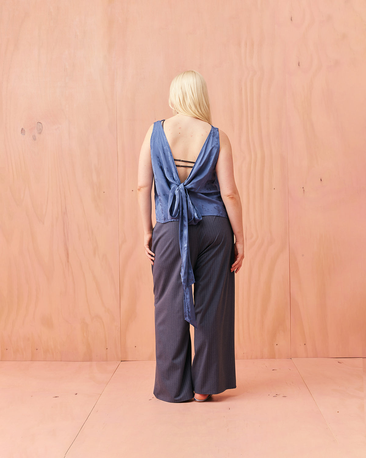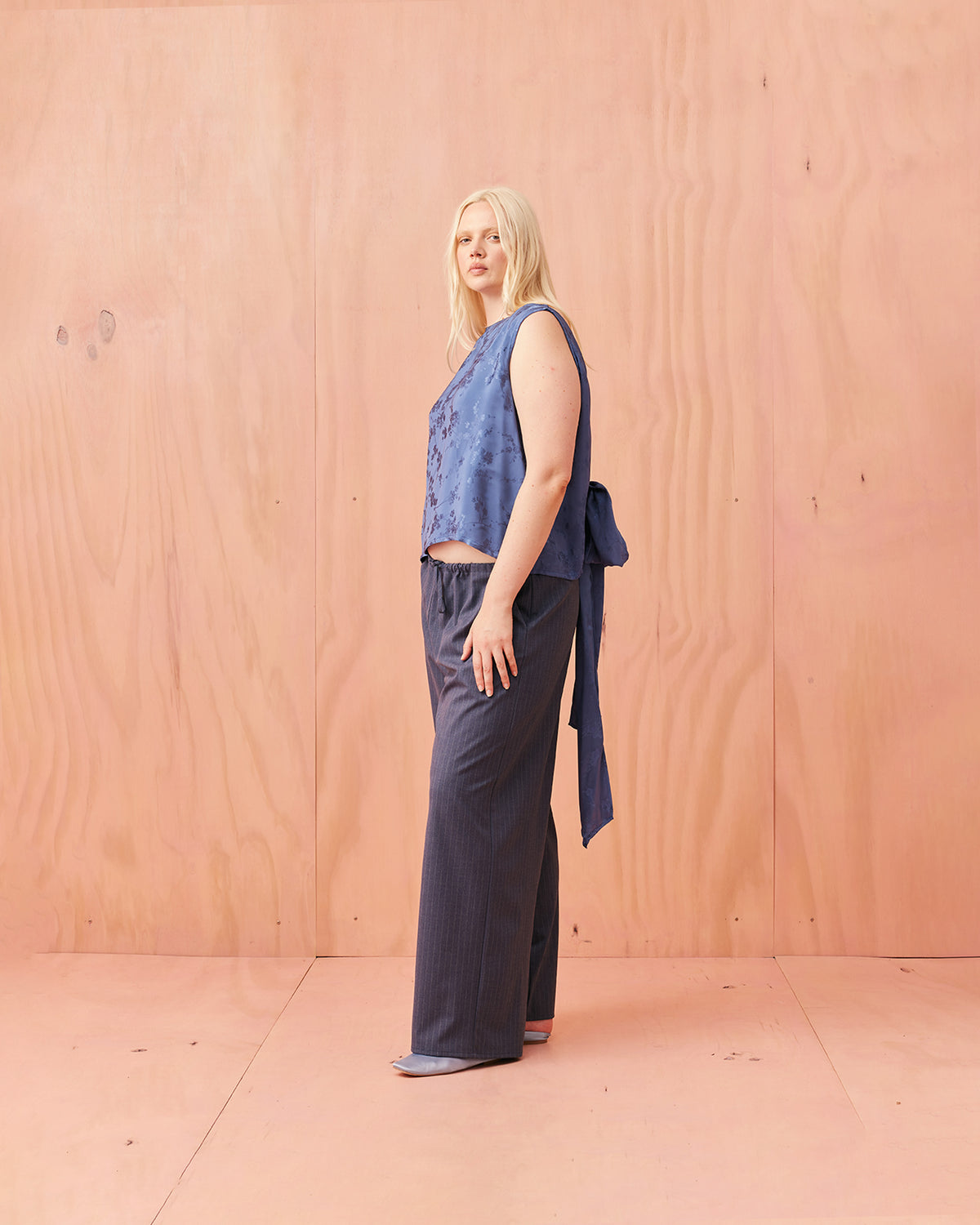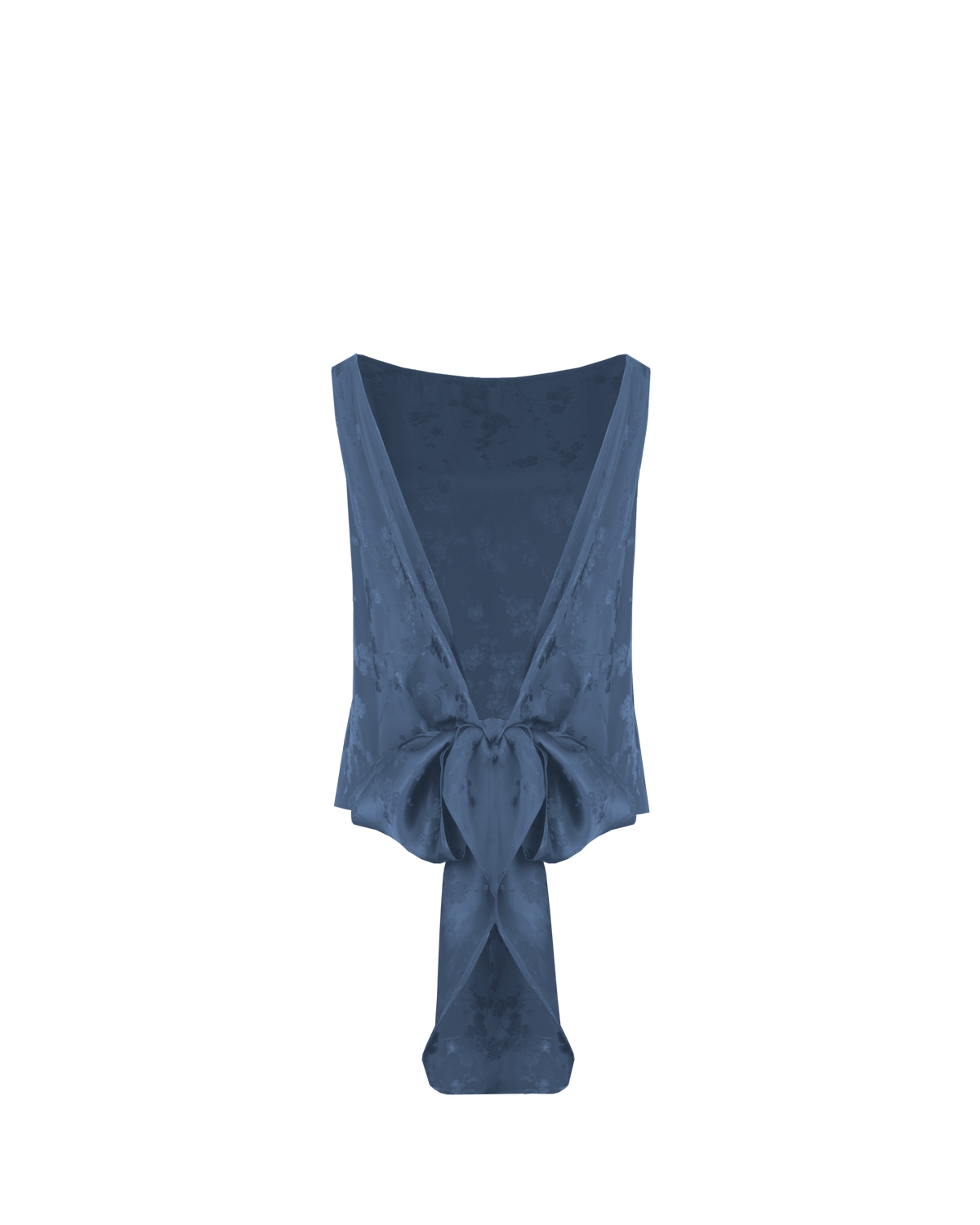 Liz is a relaxed fit sleeveless top with a wrap feature, accentuated with long waist ties that can be tied around the body or at the back in a bow. Imagined in a sheeny jacquard satin, when this fabric catches the light it reveals the delicate cherry blossom floral.