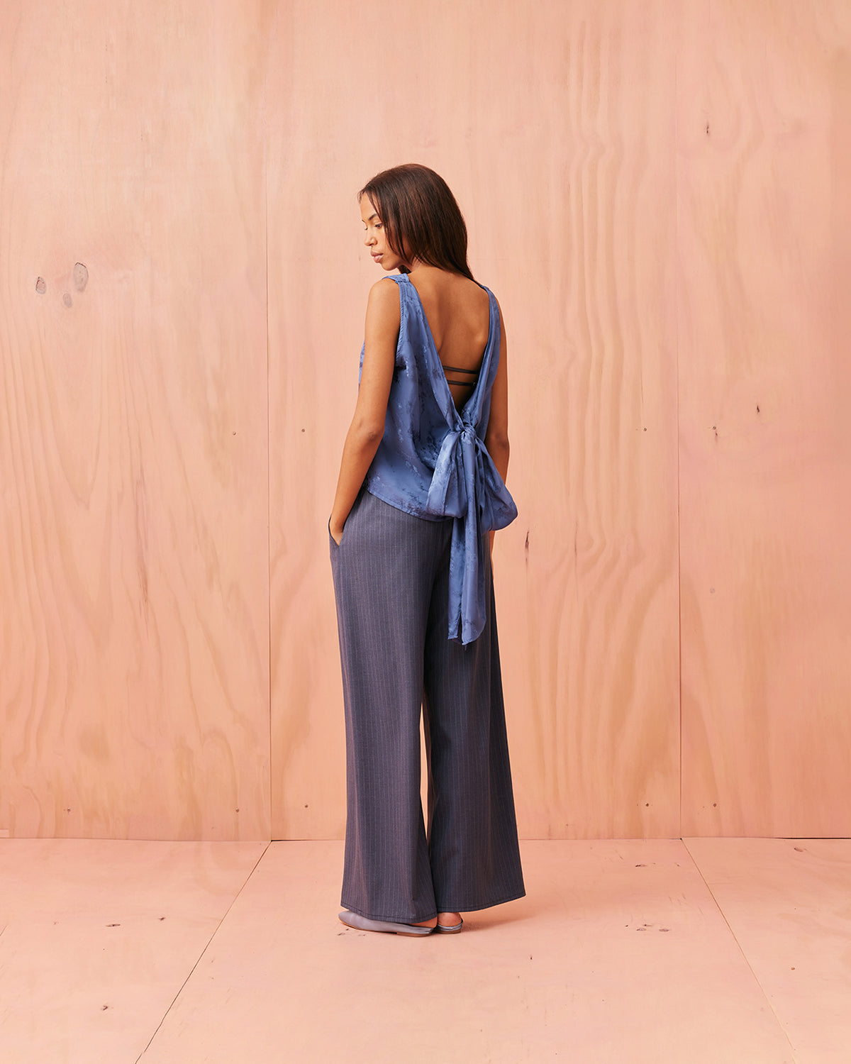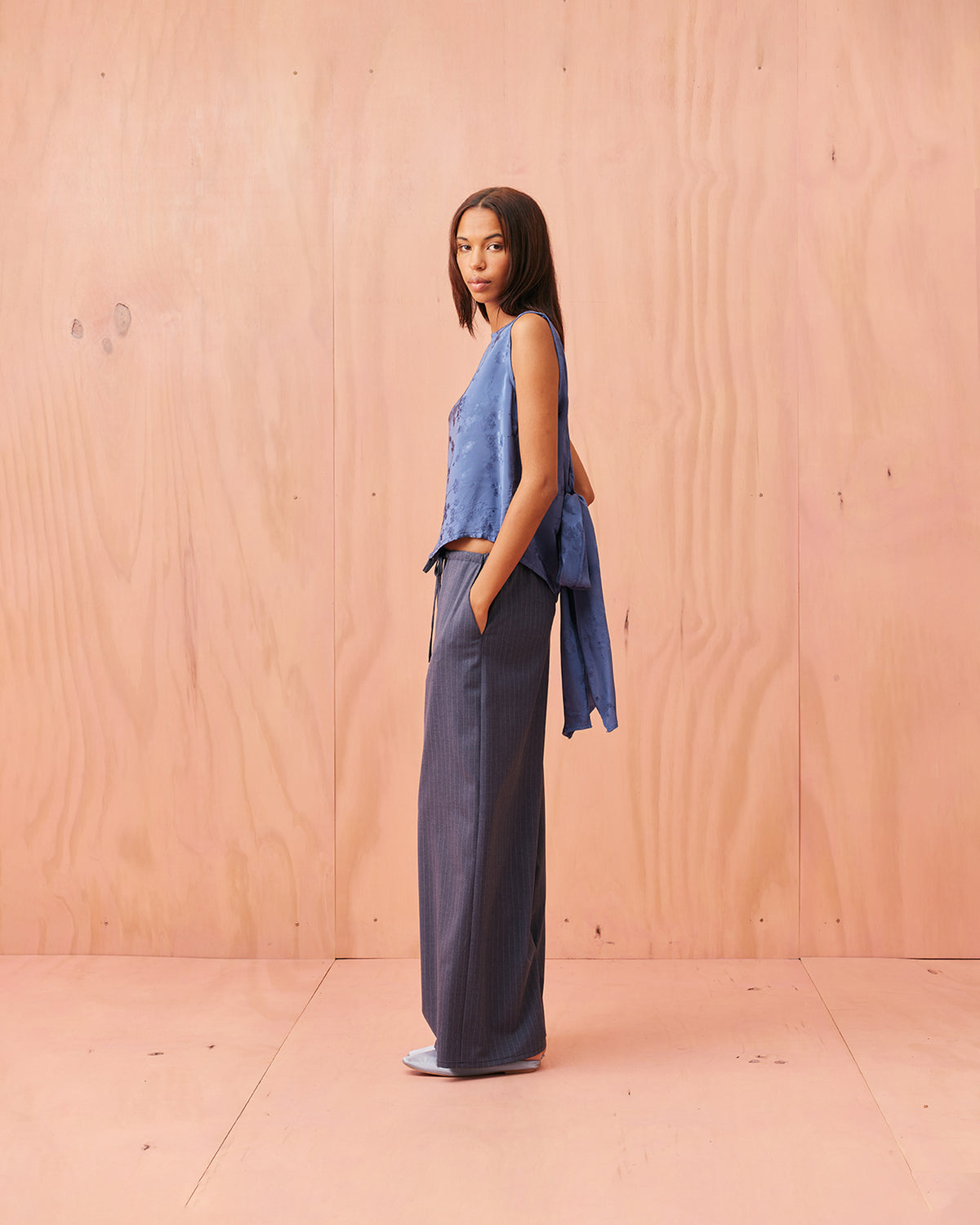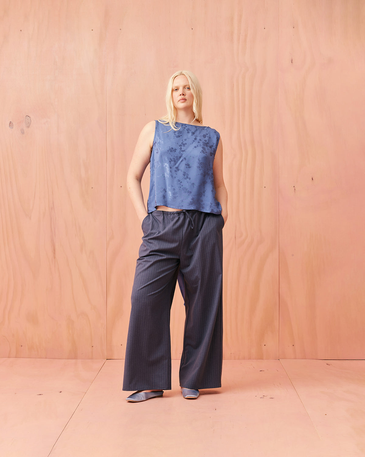 Liz is a relaxed fit sleeveless top with a wrap feature, accentuated with long waist ties that can be tied around the body or at the back in a bow. Imagined in a sheeny jacquard satin, when this fabric catches the light it reveals the delicate cherry blossom floral.
